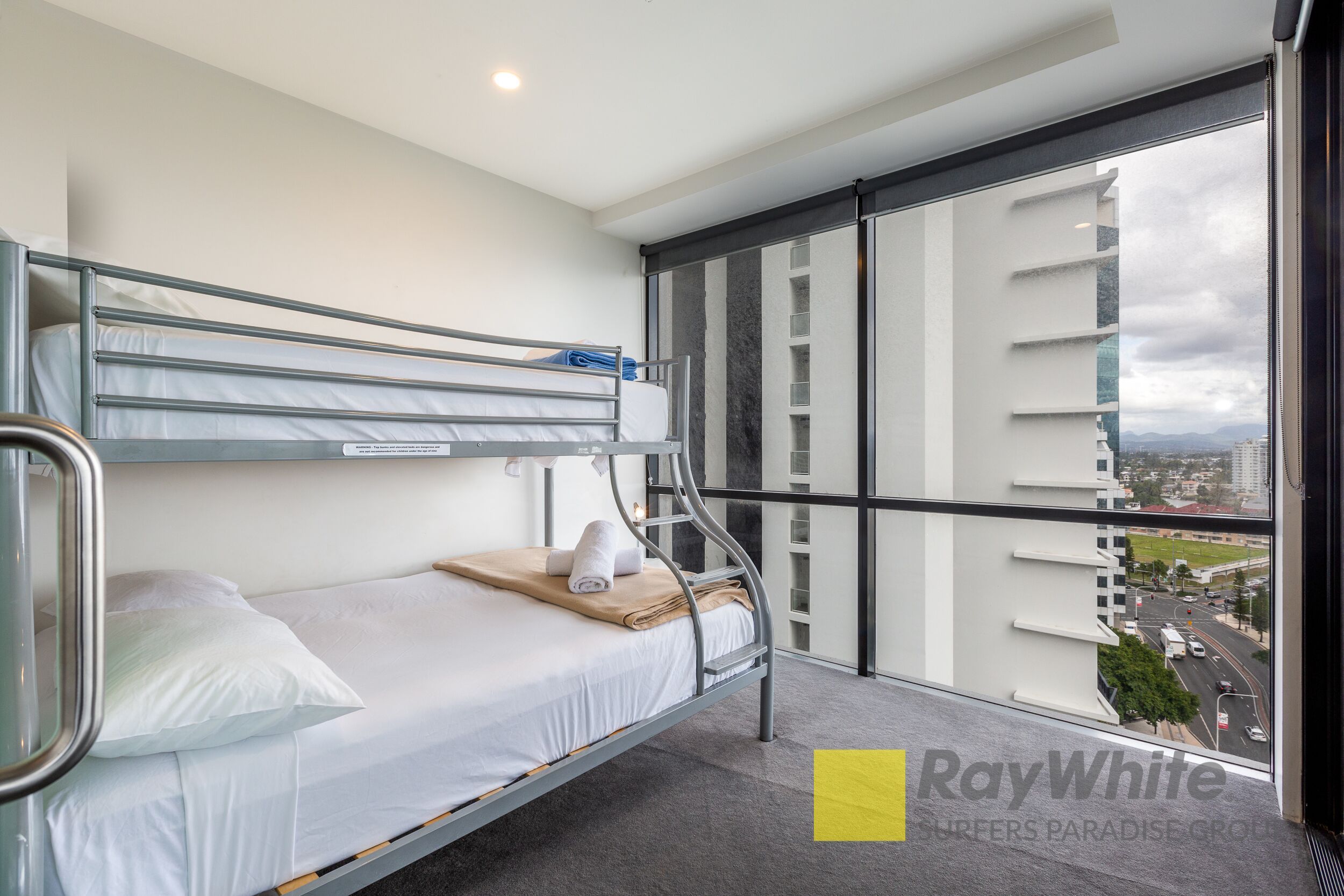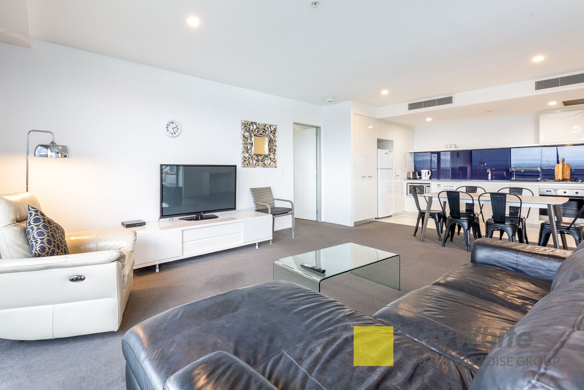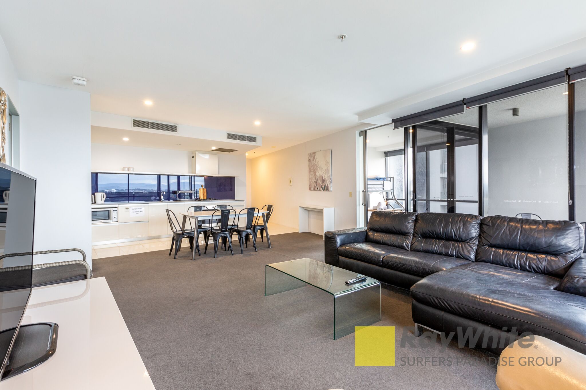 * Master bedroom with modern luxury ensuite with jet bathtub * 2 bedroom with double bunk beds and balcony access * Kitchen with modern appliances and gas stove-top * Open-plan dining/living area * Lounge room fitted with large TV and black leather couch