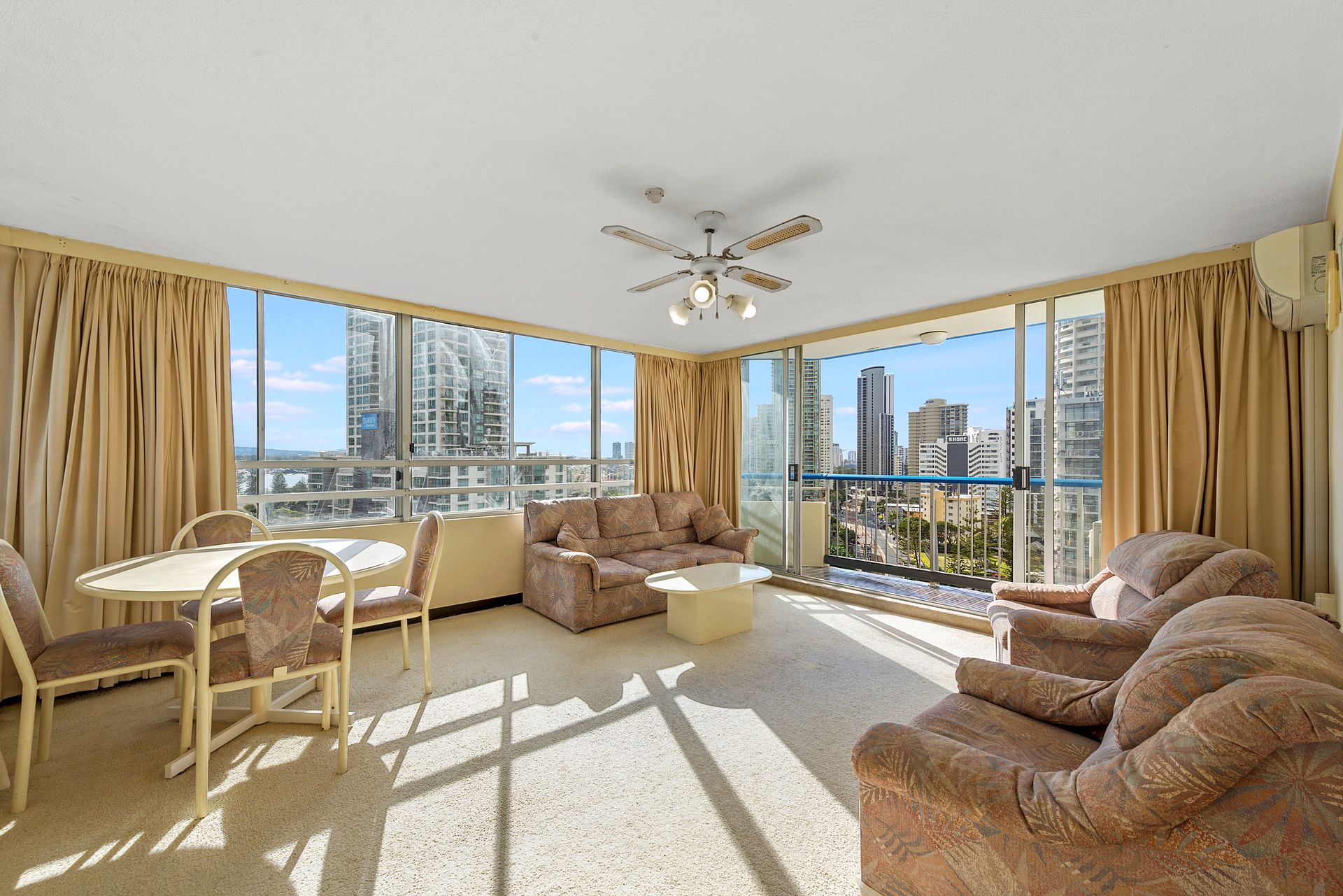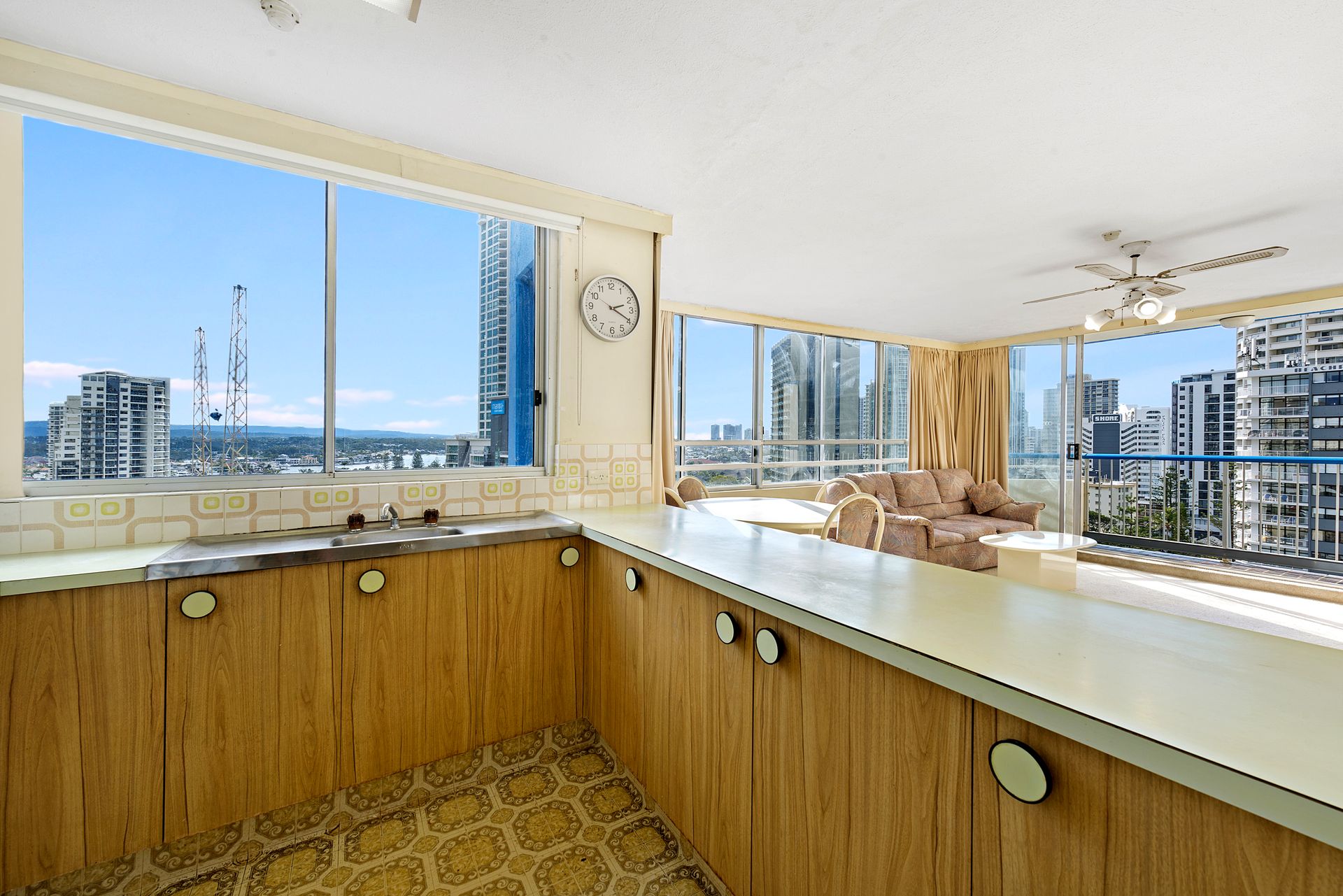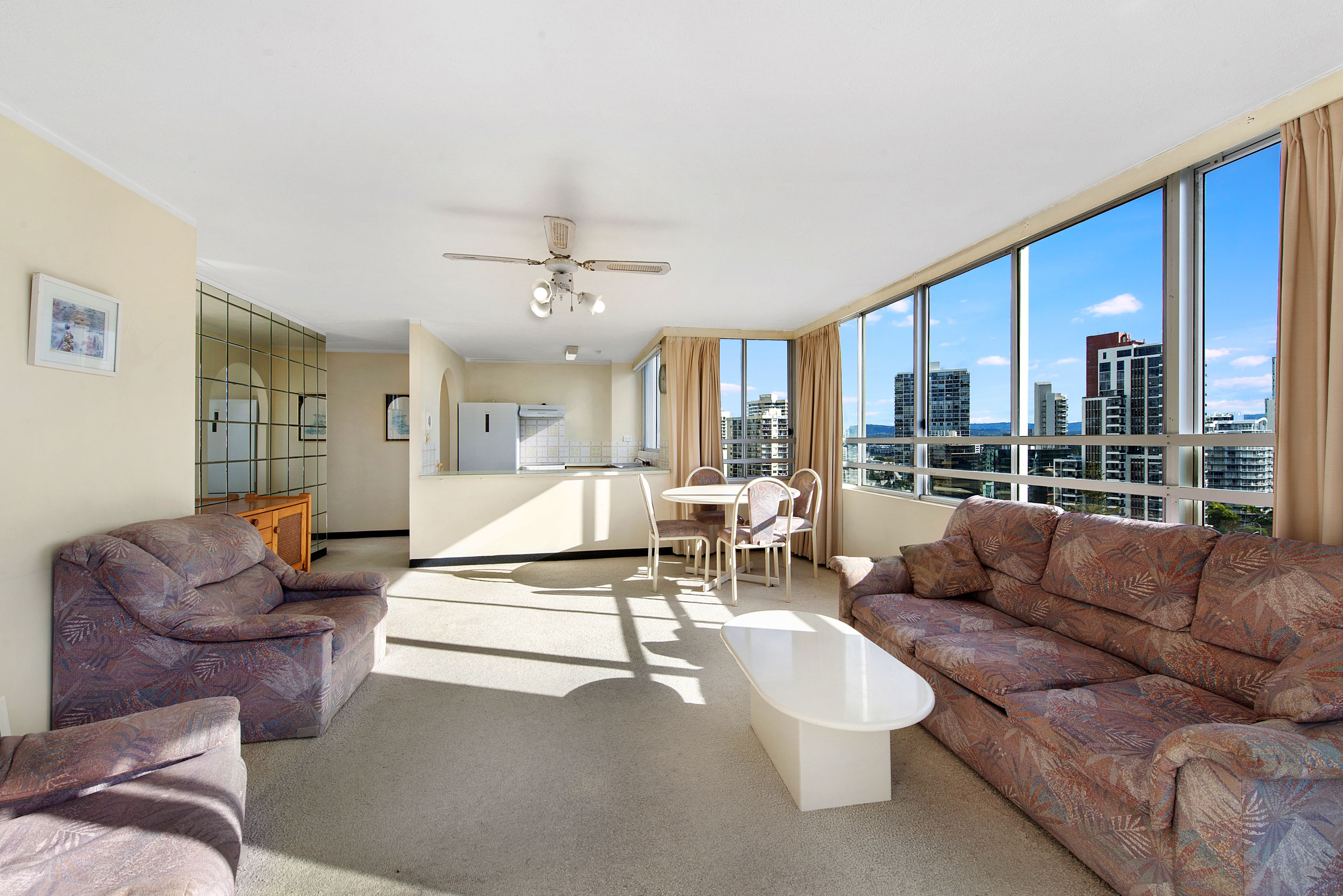 • 1 bedroom, 1 bathroom, 1 secure car park. • Top floor (Level 14) • First time offered for sale in 30 years. • Rarely available and tightly held floor plan. • Northernly corner position. • Surfers Paradise skyline views, sunset views over the hinterland and beachfront views. • Light filled open plan living/dining. • Unrivalled location in central Surfers Paradise. • Good condition loads of opportunity to modernise and add your own touches. • Ceiling fans in living and master bedroom. • Quick and easy access to the G Link rail transport with tram station directly behind the building. • Owner has bought elsewhere and has priced for immediate sale.