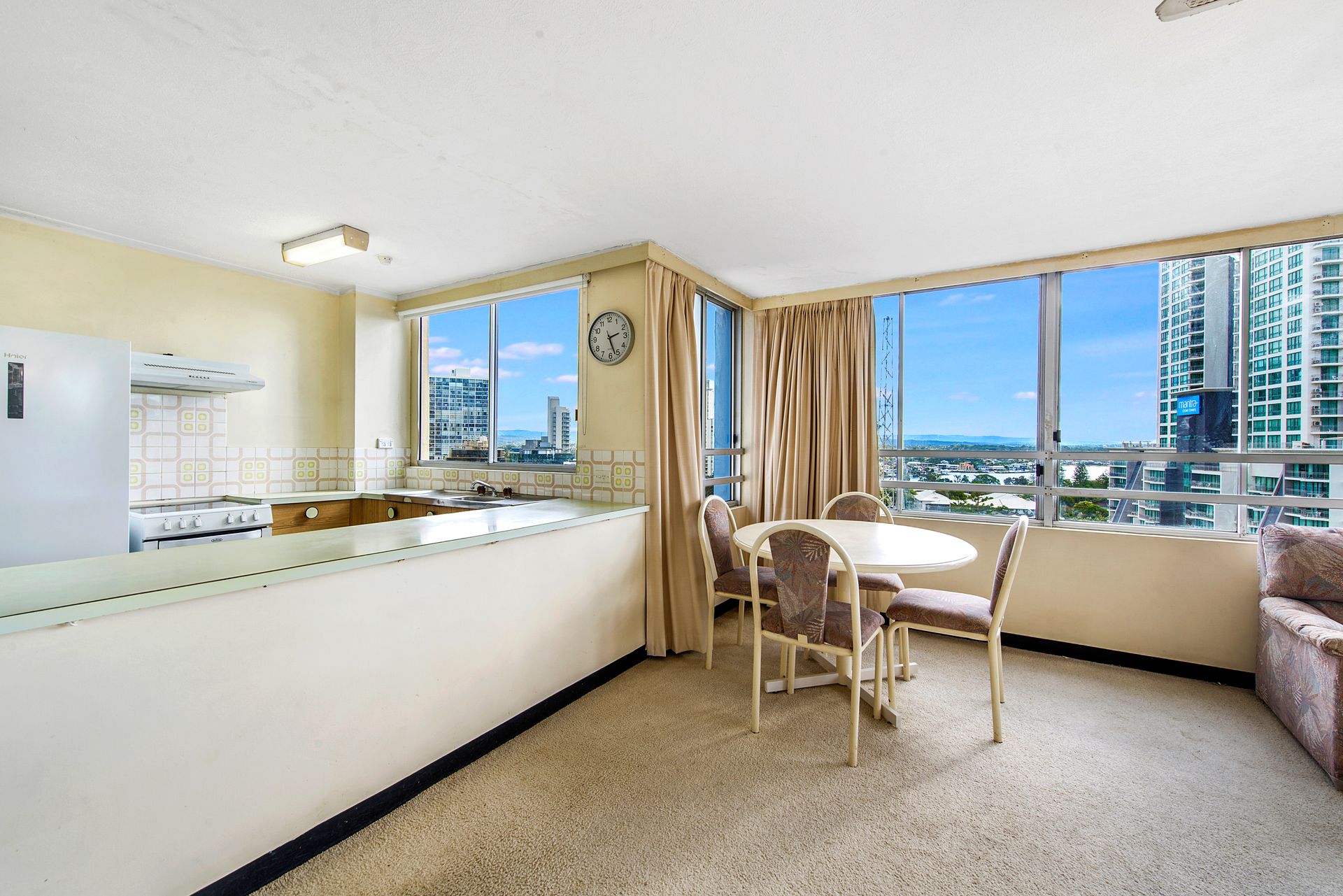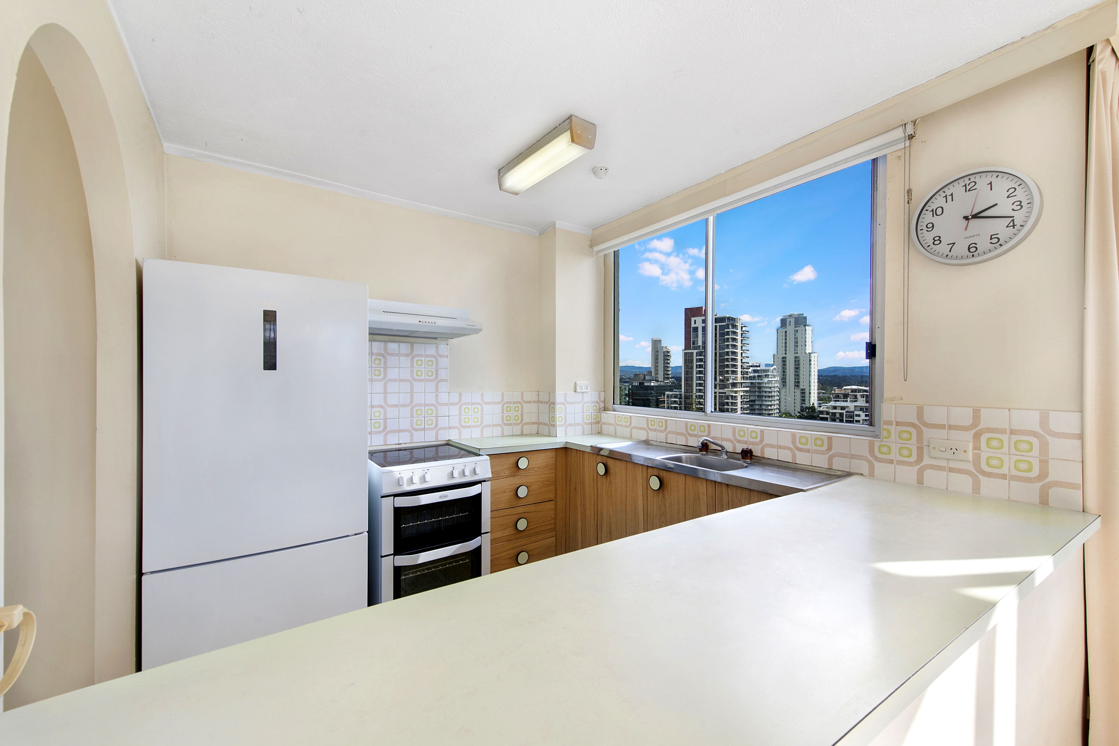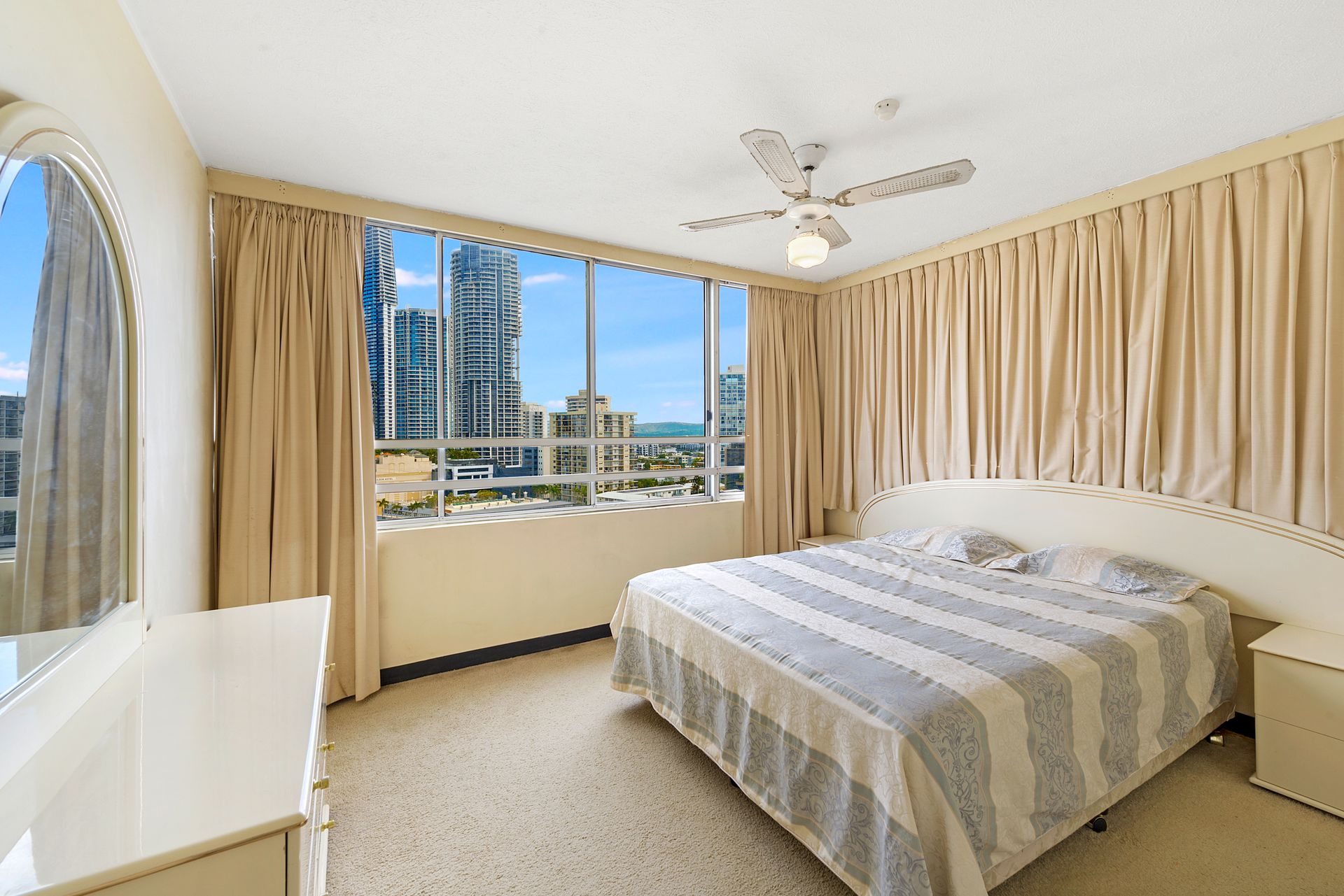 • 1 bedroom, 1 bathroom, 1 secure car park. • Top floor (Level 14) • First time offered for sale in 30 years. • Rarely available and tightly held floor plan. • Northernly corner position. • Surfers Paradise skyline views, sunset views over the hinterland and beachfront views. • Light filled open plan living/dining. • Unrivalled location in central Surfers Paradise. • Good condition loads of opportunity to modernise and add your own touches. • Ceiling fans in living and master bedroom. • Quick and easy access to the G Link rail transport with tram station directly behind the building. • Owner has bought elsewhere and has priced for immediate sale.