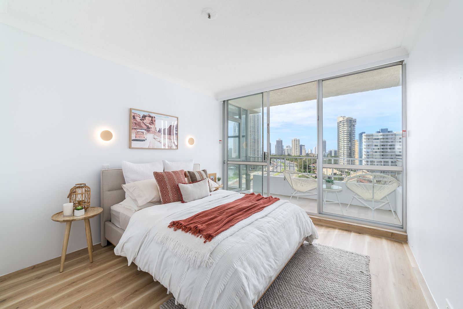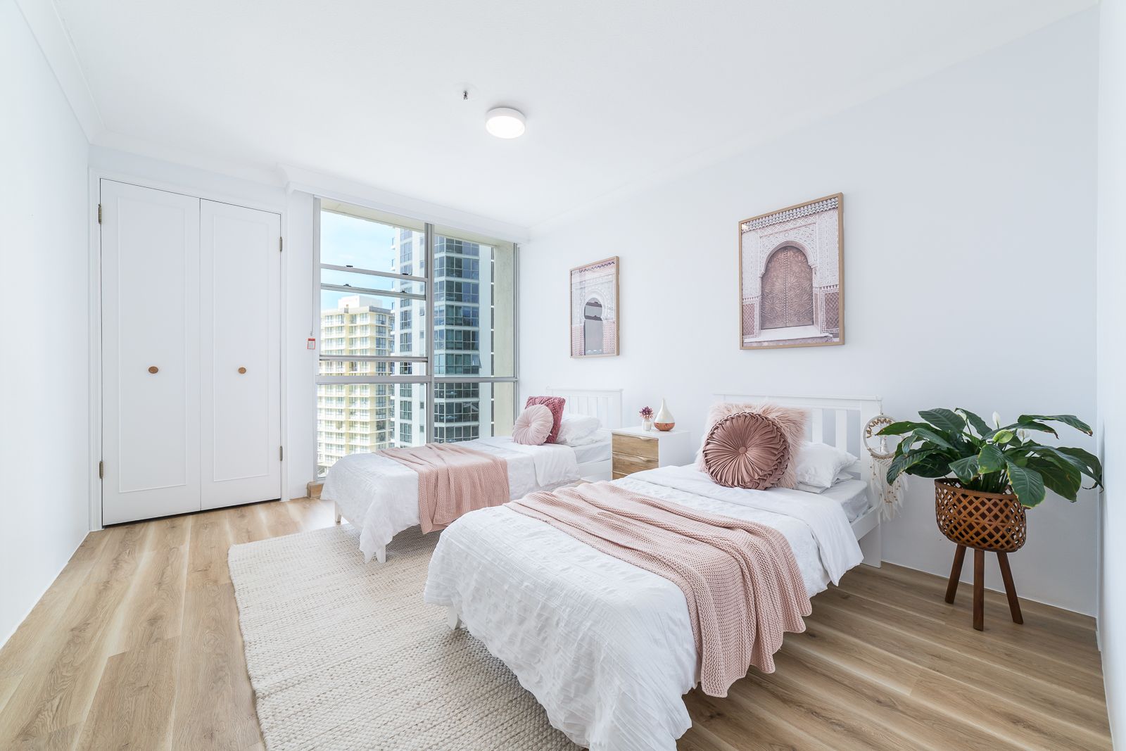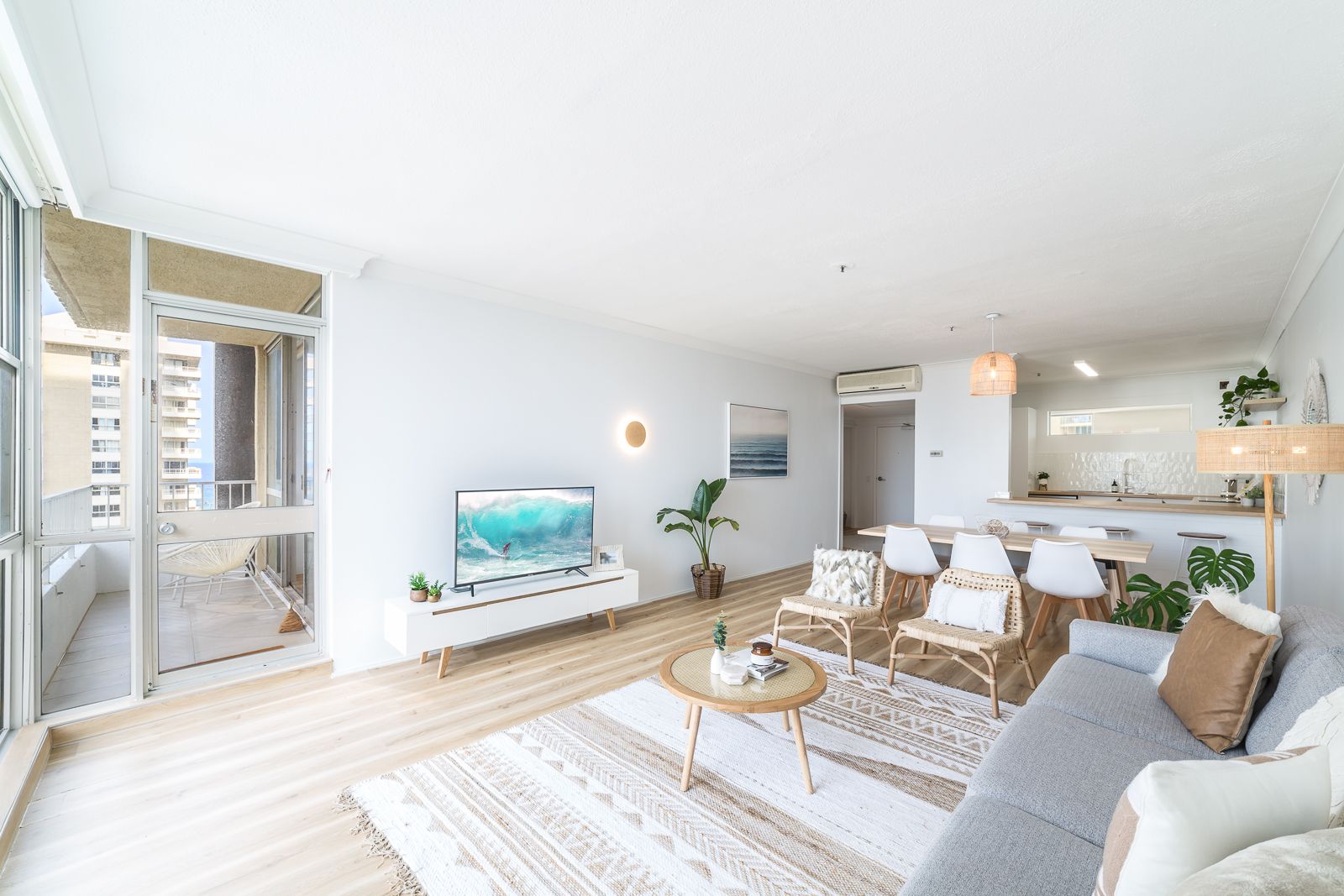 - Spacious open plan dining area extending to the living room - Freshly painted - North/East balcony with ocean outlook - Renovated kitchen - King sized master bedroom with built-in, balcony access and en-suite - King sized second bedroom with built-in and North facing skyline view - New bathroom with brass finishings - Reverse cycle air-conditioning, level lift access - Well maintained building, tennis court, pool and BBQ facilities - Visitors parking and undercover secure parking - Close to cafes, shops, Surfers Paradise Beach and Trams