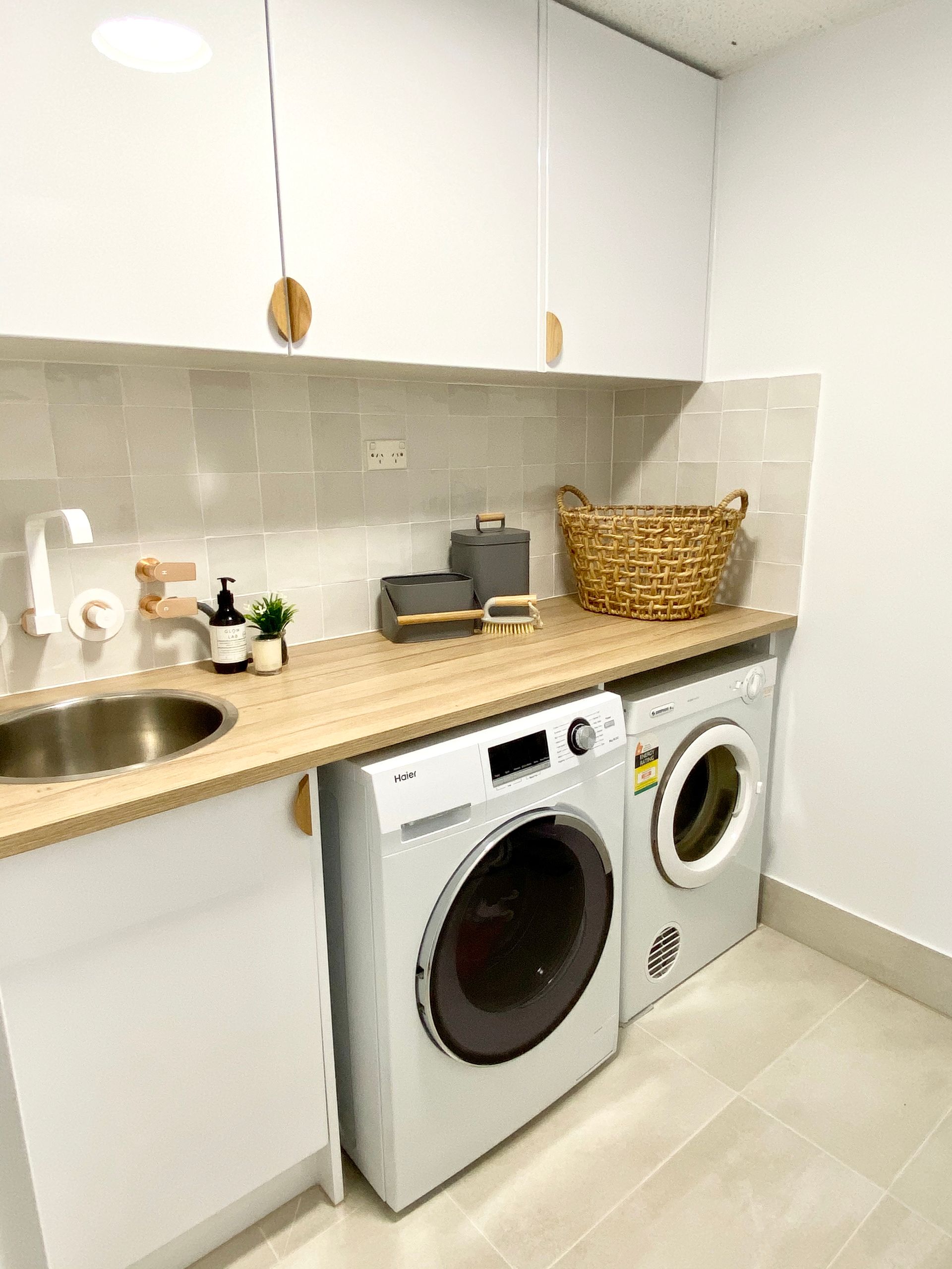 - 6 person dining table & bar stools, - Television with stylish sofa, rattan chairs, coffee table - Refrigerator, washing machine & dryer - Queen mattress, bed & side-tables - Outdoor setting + more!
