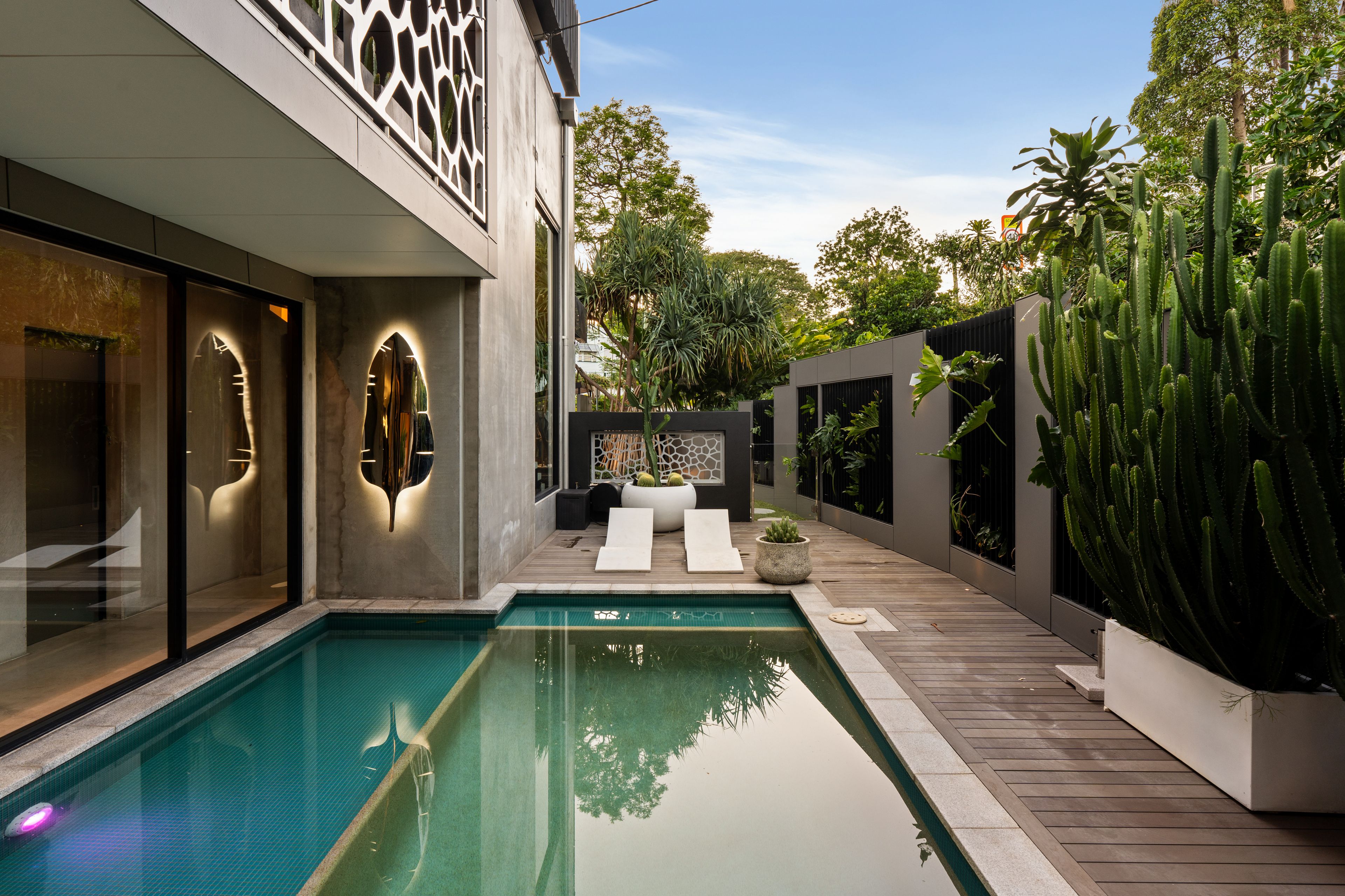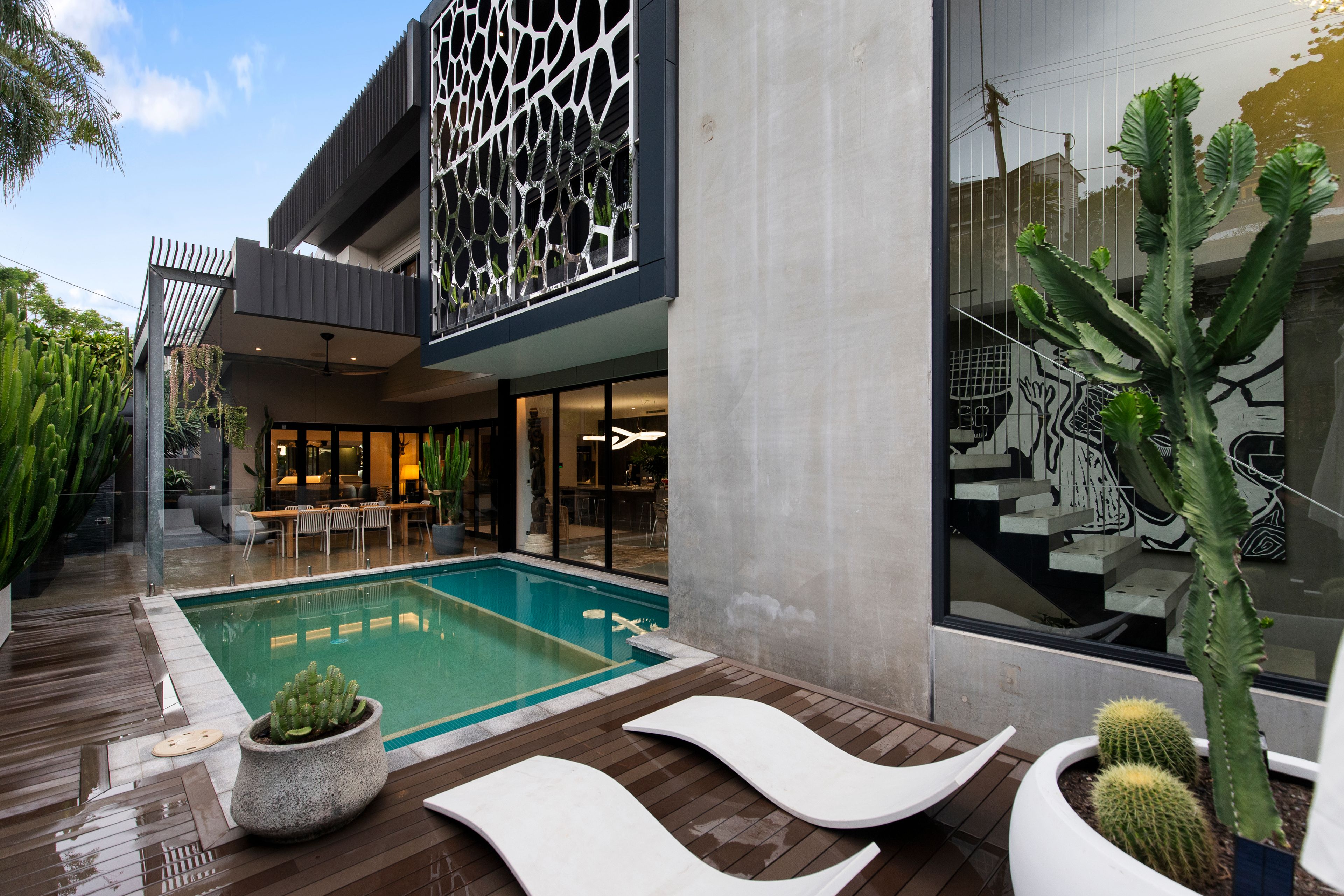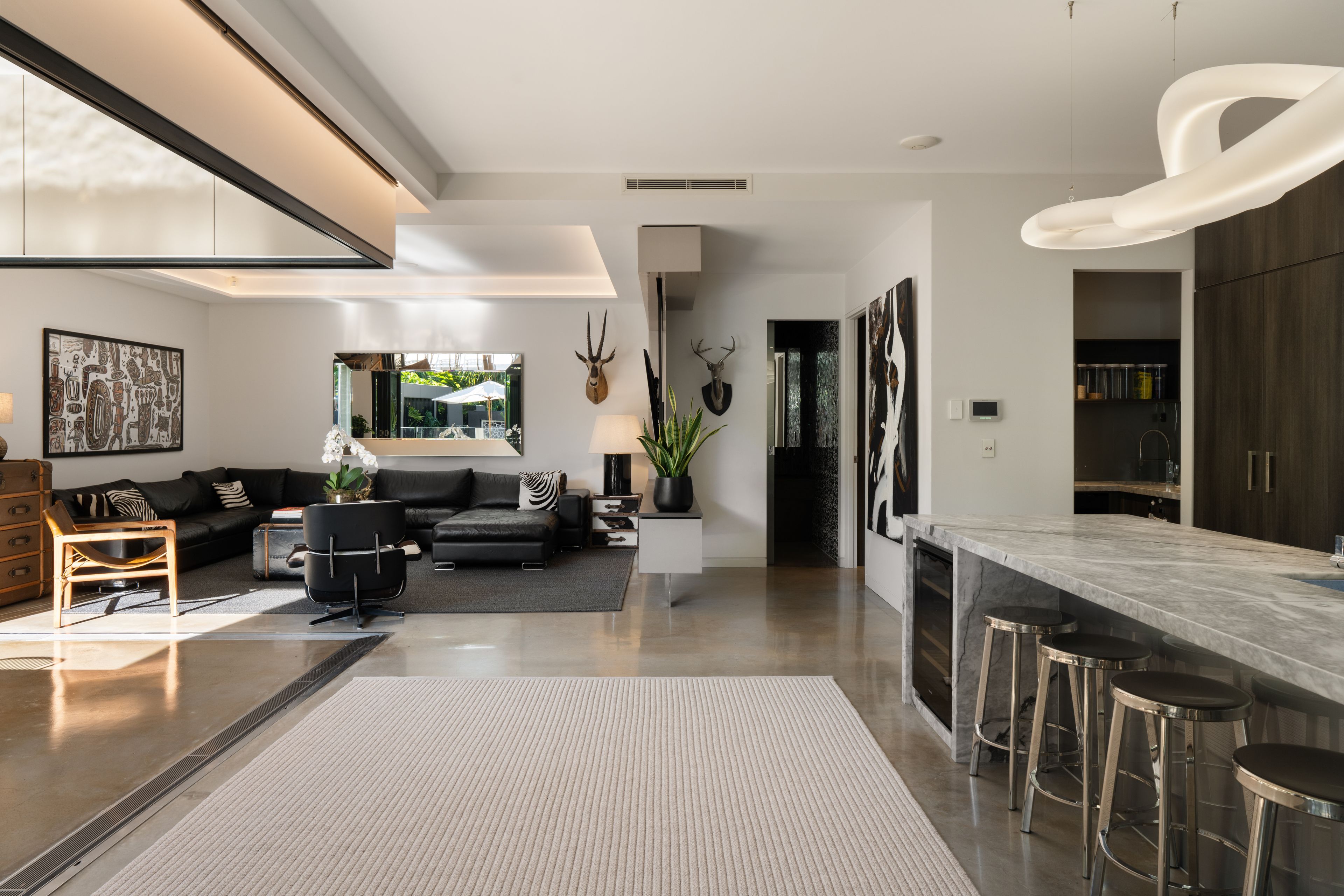 Designed by Greg Harris, renowned for his involvement in some of Brisbane's highest-value homes, the property embodies an industrial-inspired aesthetic defined by sculpted forms and bold materiality. Cascades of concrete, marble, natural stone and glass rise beneath soaring 3-metre ceilings, creating a curated canvas that frames the landscaped greenery, glistening pool views and northern aspect, where ambient sunlight and breezes flow freely.