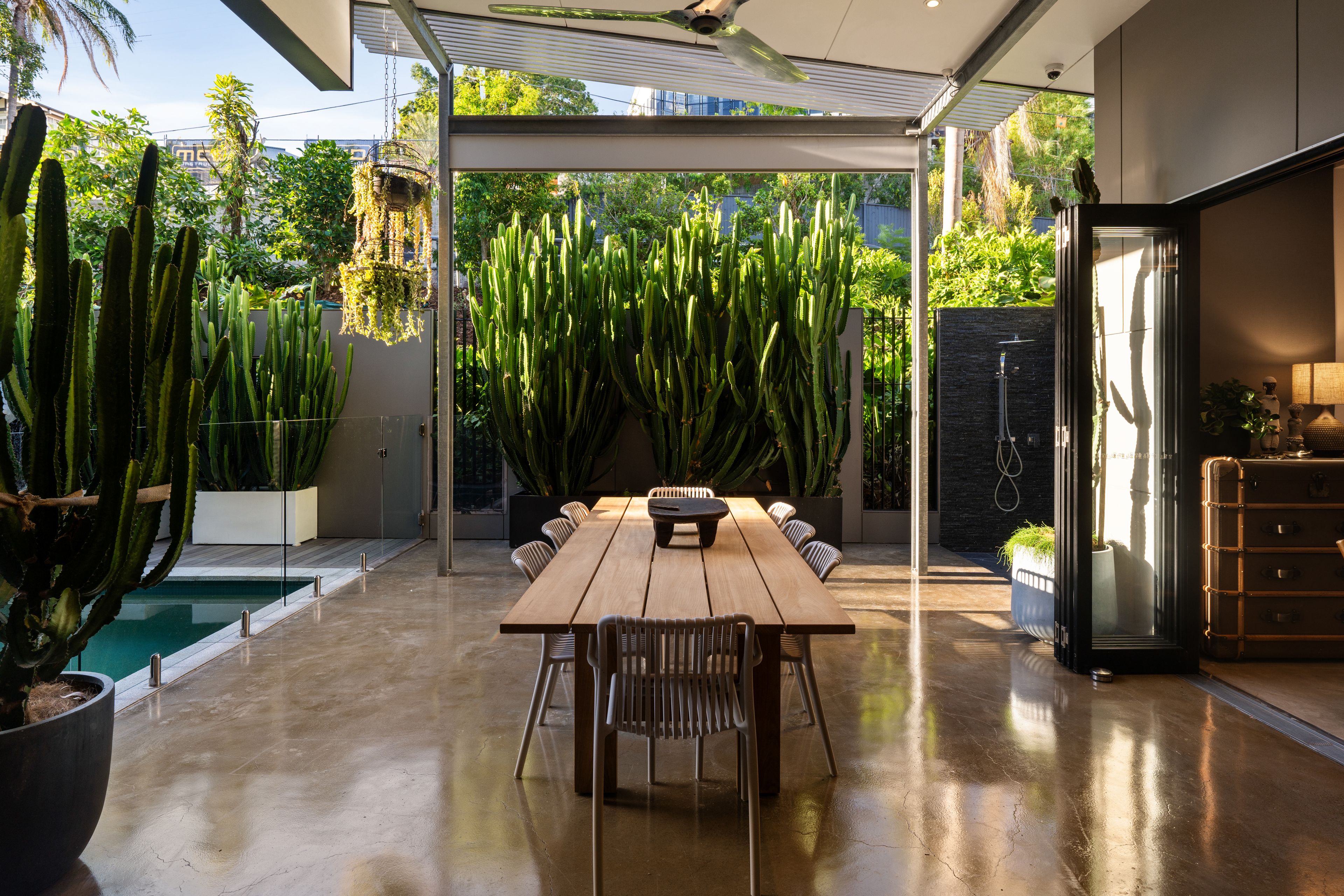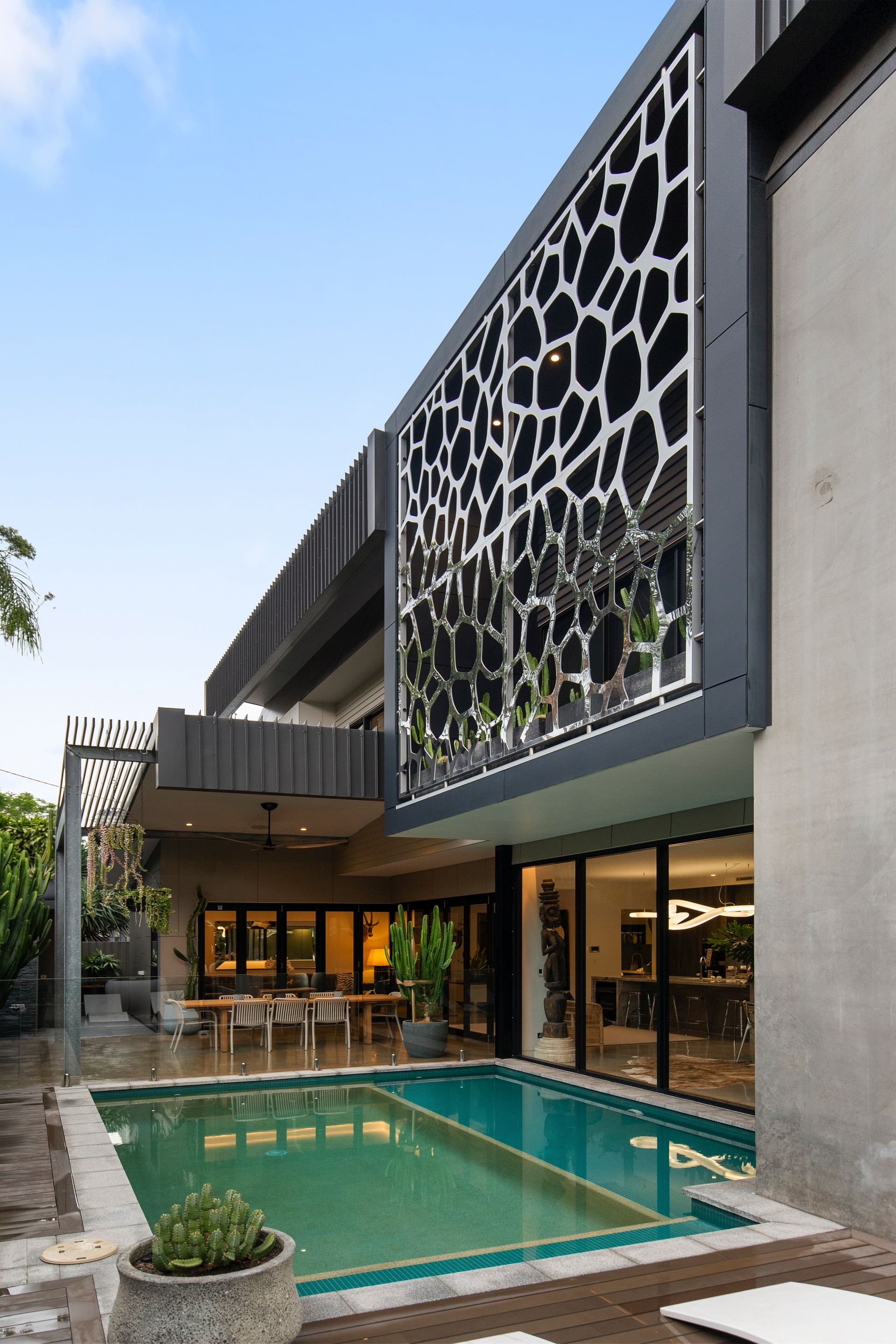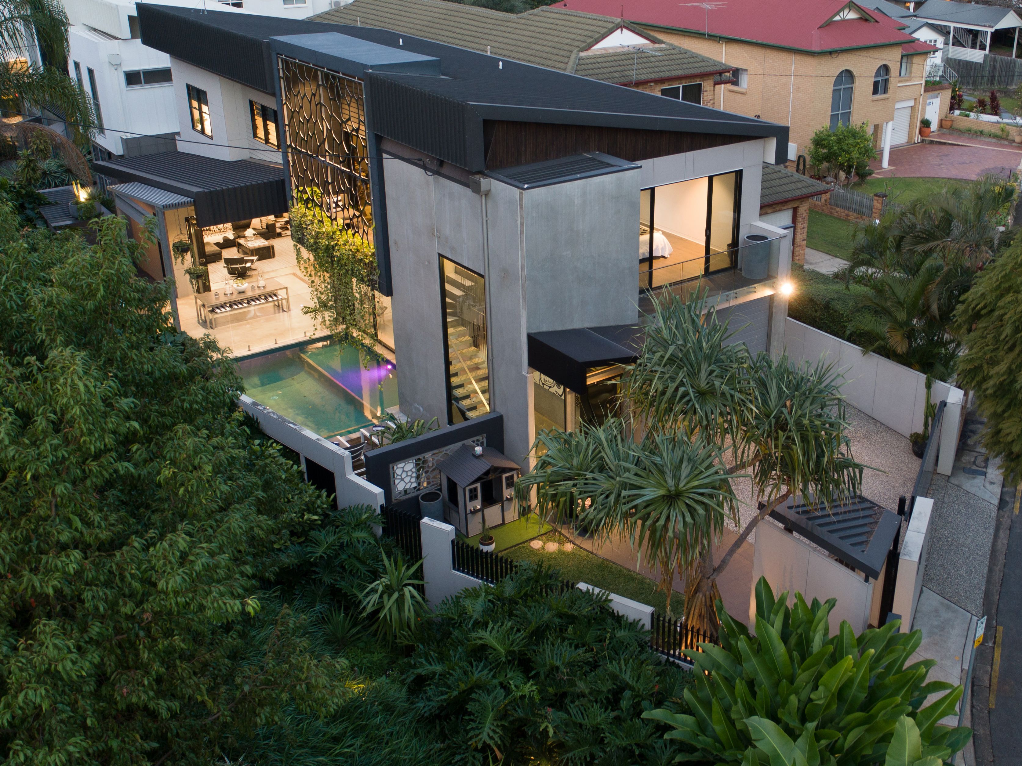Designed by Greg Harris, renowned for his involvement in some of Brisbane's highest-value homes, the property embodies an industrial-inspired aesthetic defined by sculpted forms and bold materiality. Cascades of concrete, marble, natural stone and glass rise beneath soaring 3-metre ceilings, creating a curated canvas that frames the landscaped greenery, glistening pool views and northern aspect, where ambient sunlight and breezes flow freely.