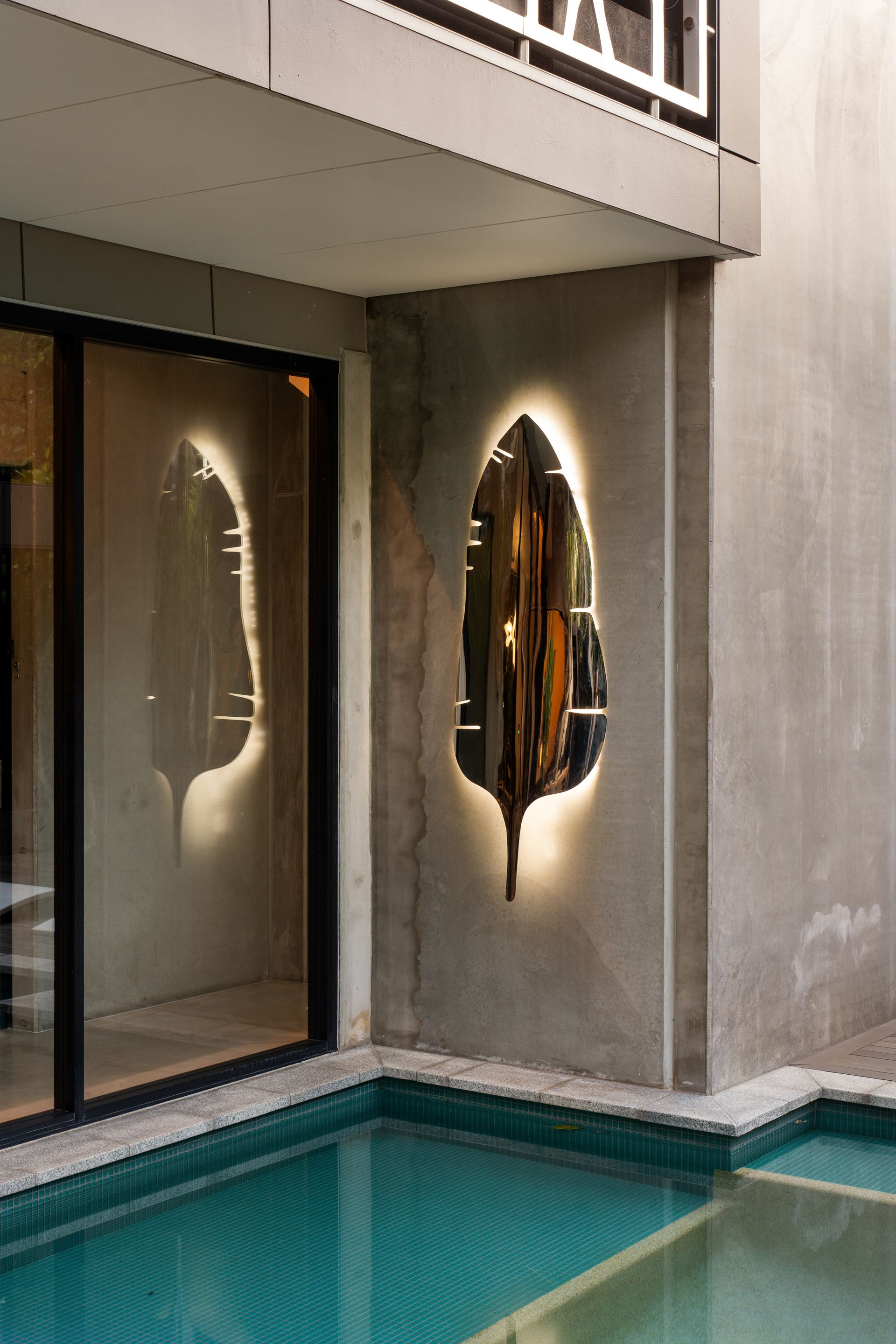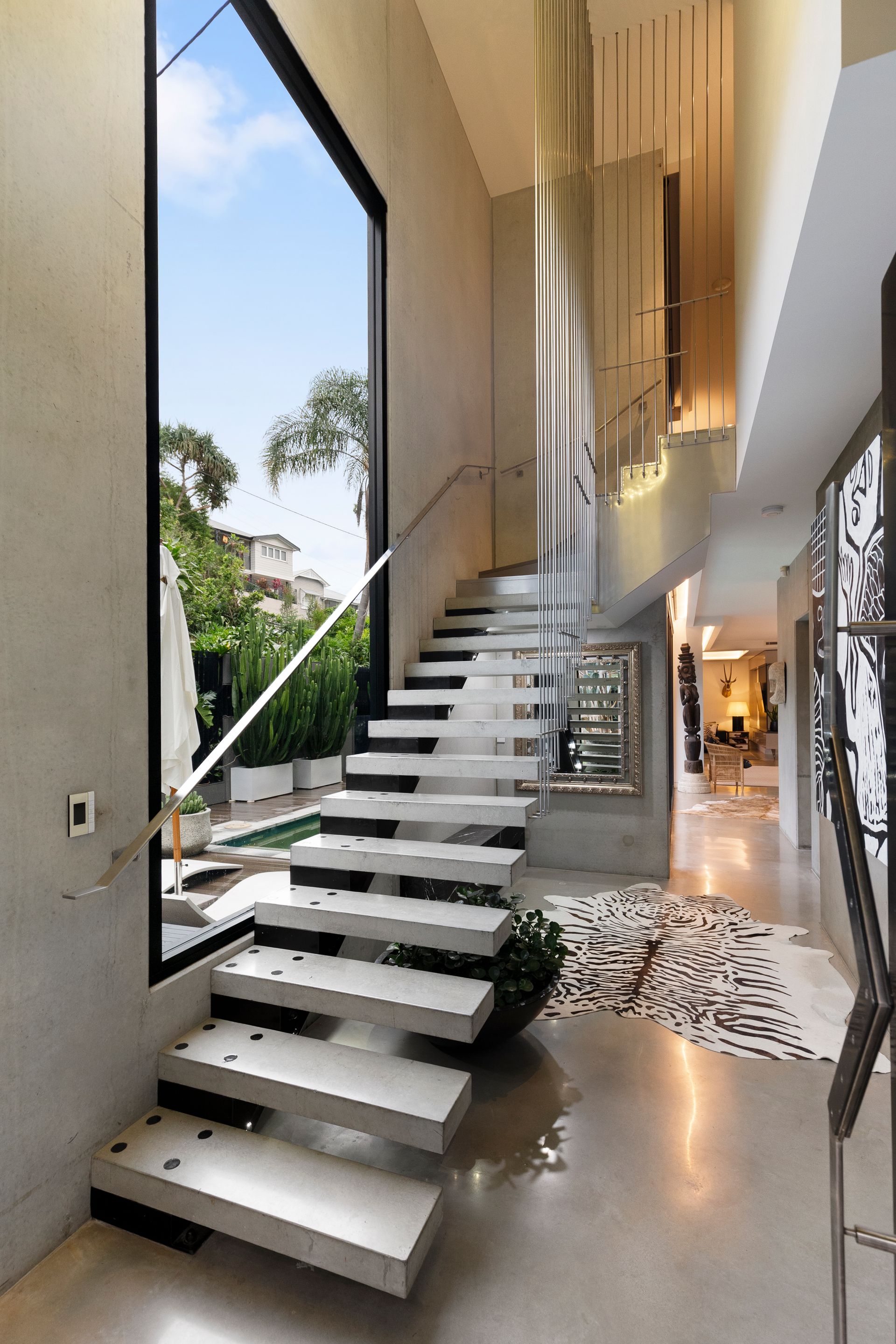 Living continues upstairs, with a lounge room extending to a balcony featuring a custom, mirrored stainless steel display.