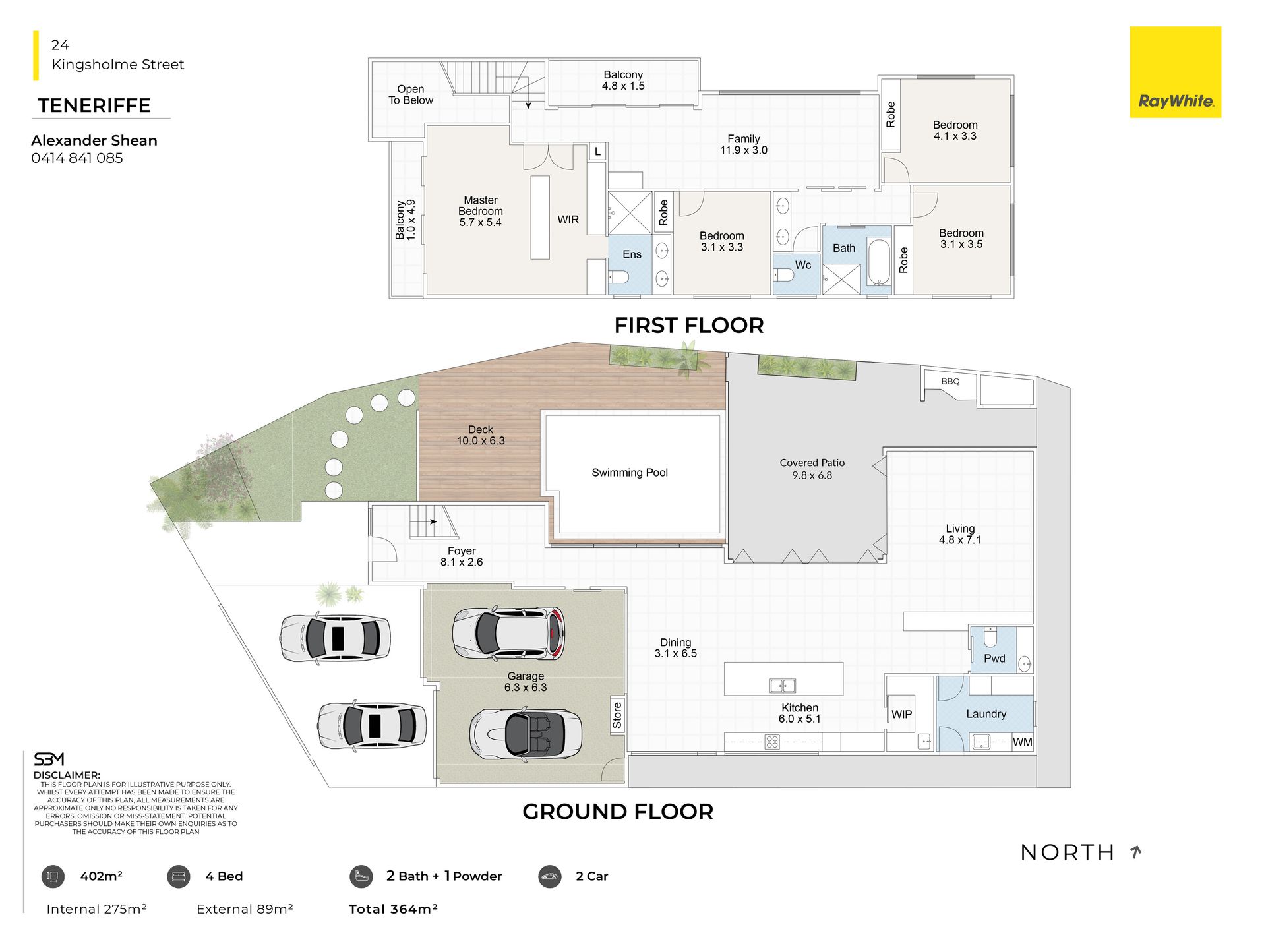 All four bedrooms are located upstairs, and the home features two bathrooms, a guest powder room, and a laundry with ample storage. A private balcony, walk-in robe, and double-shower ensuite heighten the luxury in the master suite, and the main bathroom is beautifully designed with a steam room, marble bench seating, and heated towel rails.