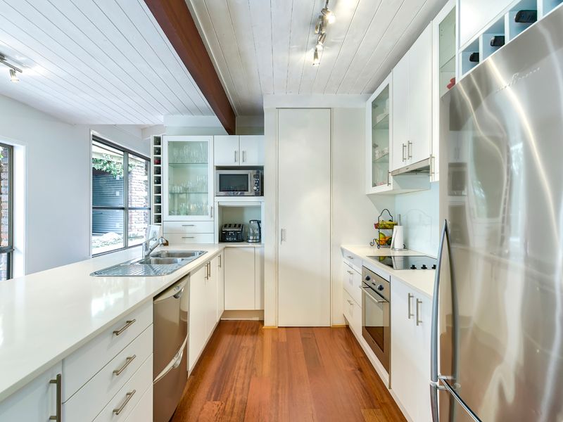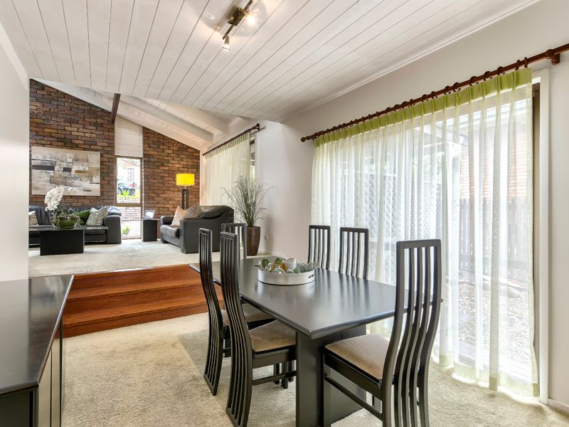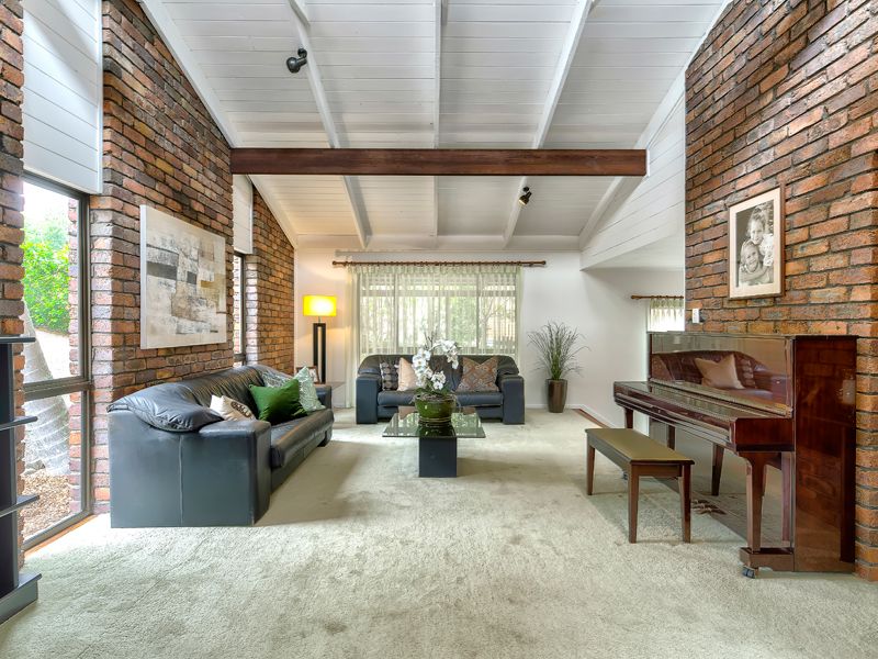 Upon entering the property, your eyes are drawn to the vaulted, cathedral ceilings and the exposed brick walls, which gives the home a pleasant and homely vibe. The formal living space is generously sized, and despite being at the front of the house, feels intimately private due to the set-back position of the home on the block. The dining room then flows into the practical, U-shaped kitchen. The kitchen is well-equipped with storage and counter space, plus its central location allows for close supervision of younger family members as they play outside by the pool, or relax in the second living area.