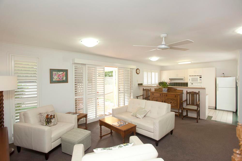 Townhouse 22 boasts Spacious living and dining room with large windows allowing the room to be filled with natural light. All windows throughout the property have been fitted with quality plantation shutters; this practical feature has given the home a fresh new look. The modern kitchen is located perfectly in the home, boasting loads of bench space sure to impress the best of home cooks. Opening up from the kitchen is the great paved undercover entertaining area, large enough for alfresco dining with family and friends. The landscaped back yard has to be seen to be believed! The space leaves scope for the imagination to run wild. The main bedrooms is a true feature of the property, with a large walk in robe and ensuite as well as large glass feature doors opening up onto a deck. From the deck you have views down to the pool and the surrounding hills. The second bedroom also has built in cupboards and its own deck. The family sized bathroom is positioned perfectly to service the home.