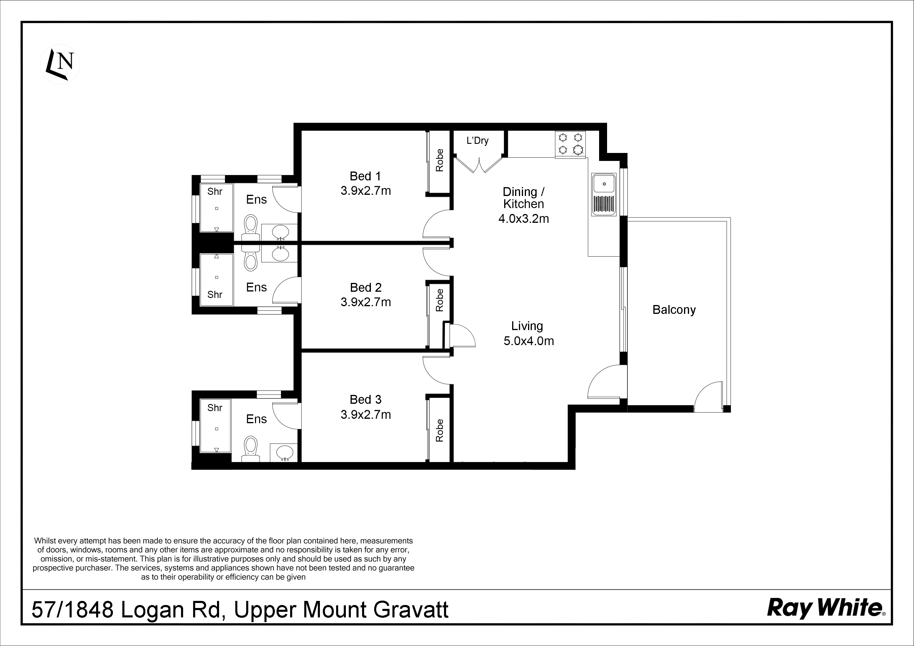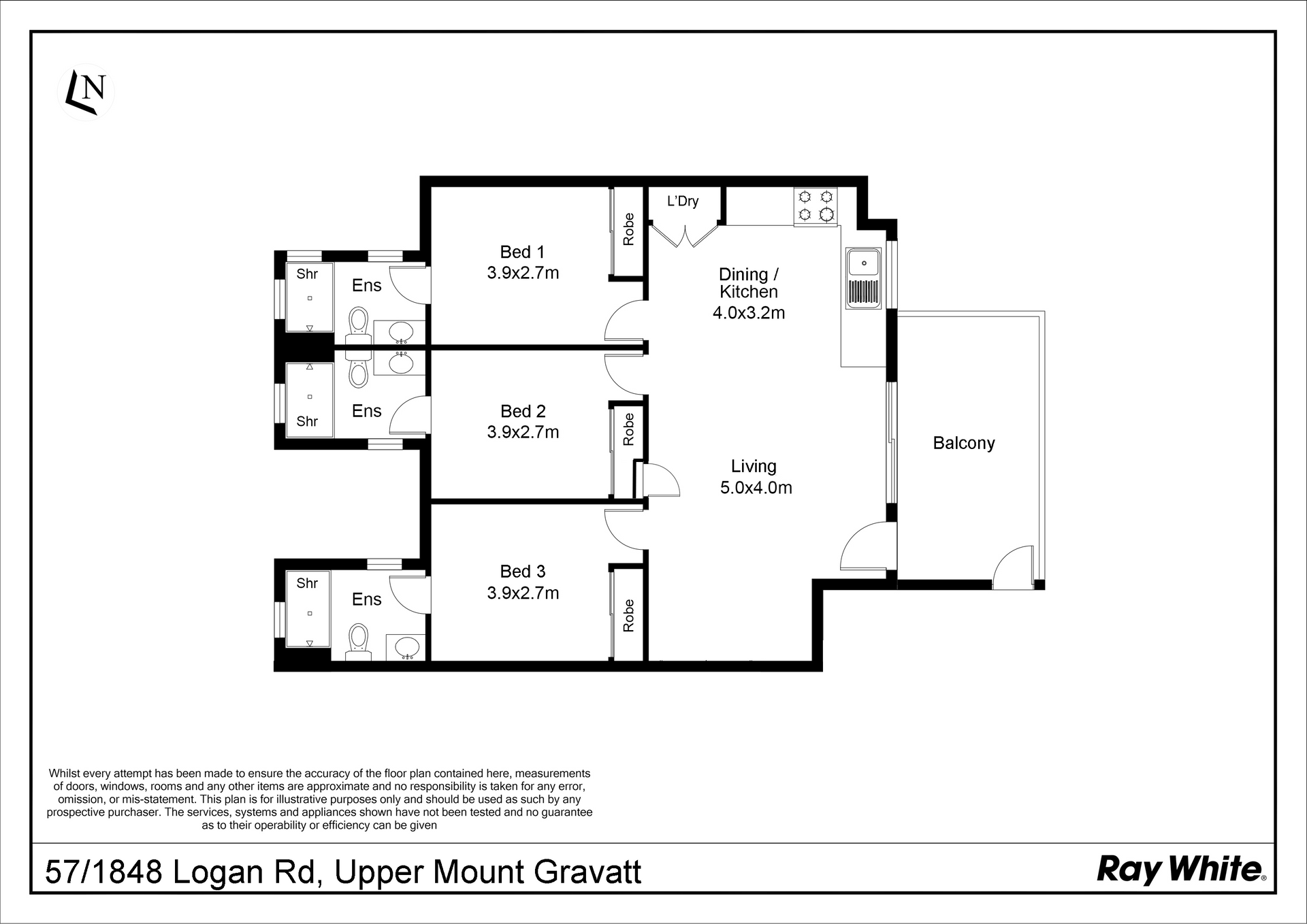 The apartment layout offers three equal sized bedrooms with ceiling fan, blinds, carpets, sliding robes and their own top condition ensuite facility.