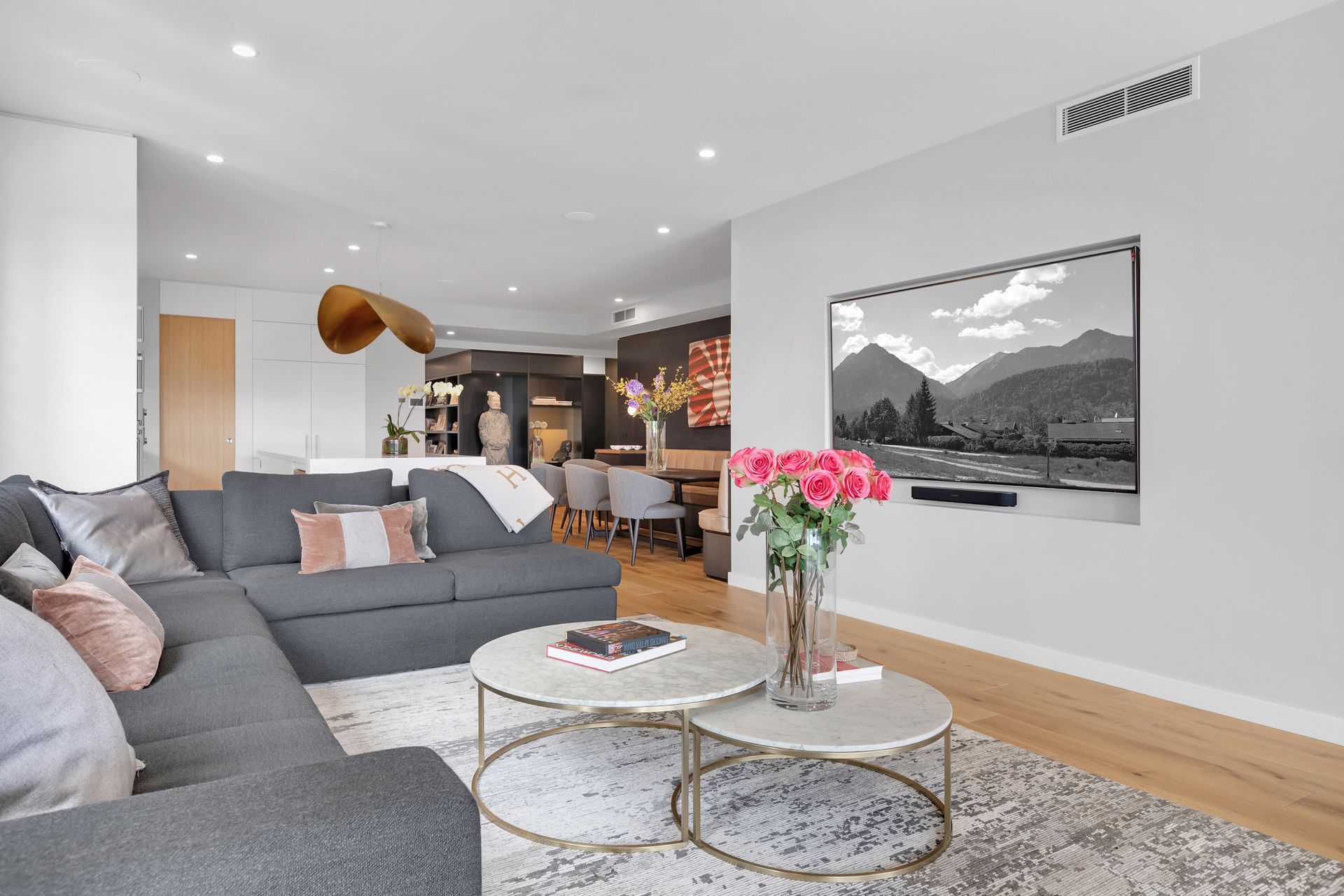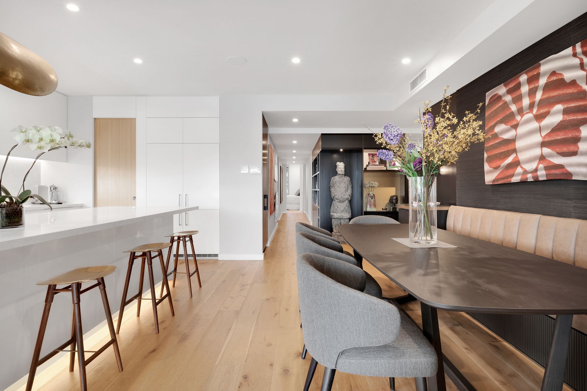 Secure lift access with only two apartments per lobby Almost 300 sqm of useable floor space Five over-sized bedrooms, all with built-in wardrobes Master bedroom with glamourous marble ensuite, walk-in robe, custom wardrobe joinery and bedding upholstery Second bedroom with walk-in robe and large ensuite Formal dining space for ten people with luxurious custom-built banquette seating Open-plan kitchen with top-of-the-range Gaggenau cooking equipment Integrated Liebherr fridges, Vintec wine fridge Compact butler's pantry provides discreet sink and additional storage Fully-ducted and zoned air-conditioning throughout Fifth bedroom configured as home office and media room with lounge, custom-joinery, built-in storage Two covered balconies with direct access from three of the bedrooms Main balcony can comfortably accommodate seated dining for 12 people Recessed wall-mounted TV's (85" and 55") in lounge room and home office Integrated Sonos ceiling speakers throughout apartment Three prime basement car spaces accessed directly from apartment lift Secured bicycle storage cage in basement 17 metre swimming pool with resort-style surrounds Pool-side gymnasium featuring cardio and weight-training equipment,1500sqm of riverfront residents' lawn Friendly community of caring and neighbourly residents