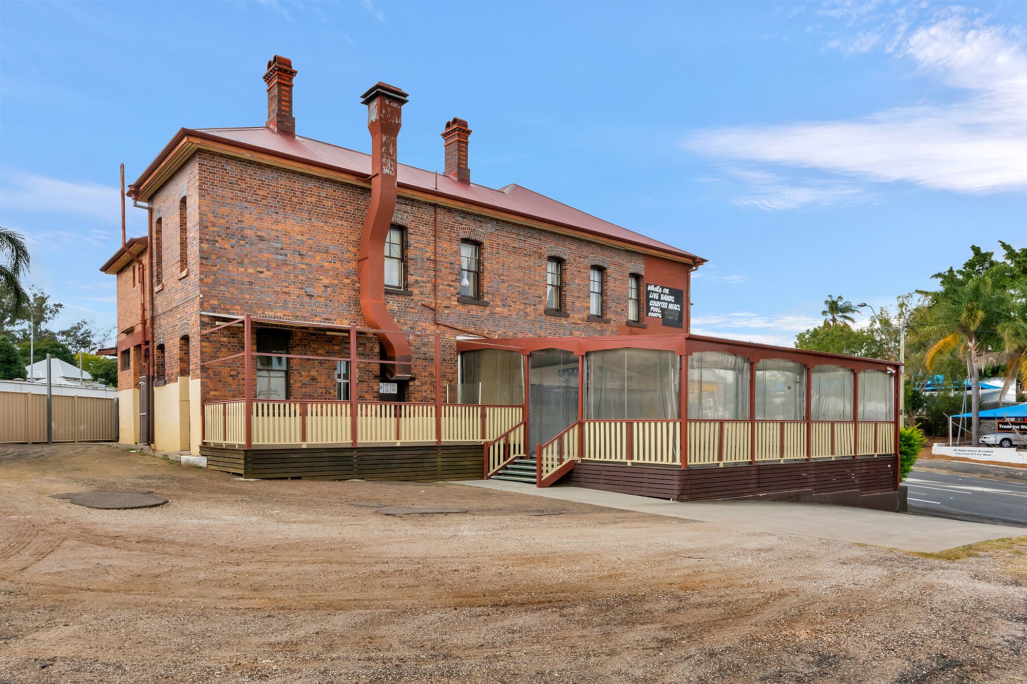 City View - Historical Landmark At The Top Of Town The Hotel was built in 1908 and was designed by renowned architect Brockwell Gill. Distinguishable for its iconic 2 storey octagonal tower the building demonstrates the principal characteristics of a Federation-era provincial Hotel. The NBN connected property is in good condition, predominantly of brick construction with a corrugated iron roof recently replaced. * Licenced premises with multiple opportunities for use (subject to Council approvals) * Zoning - CBD Residential High Density ( Mixed use) * High profile location at junction of major intersection overlooking the main thoroughfare of the Ipswich CBD * Excellent exposure with high volumes of passing traffic * Downstairs area consists of 2 separate function rooms, supporting bars, kitchen and cold rooms all in working order * Big outdoor undercover timber deck * Upstairs includes 9 rooms currently used for accommodation and 2 others for a managers residence, kitchen and laundry room * Features of the property include Grand timber stairway with balustrade , pressed metal ceilings, stained glass windows * 1,444m2 block (approx) with plenty of off street parking * Rare opportunity to purchase a slice of Ipswich history * Information Memorandum available