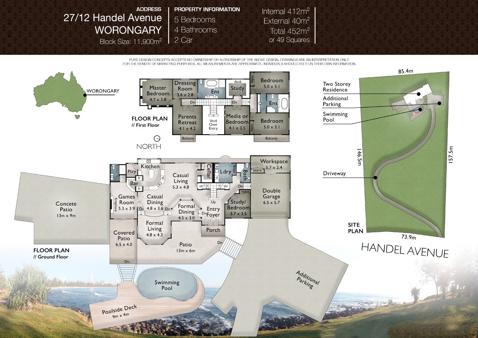 An impressive imperial staircase leads to the sleeping quarters, with the vast master suite wing separate from the remaining bedrooms. Here you'll be greeted with an elegant parent's retreat (or possible nursery) Juliette balcony, sweeping skyline views before flowing into the bedroom with custom built shelving, an expansive dressing room and ensuite. Presenting in earthy tones, it boasts a sunken spa, power jet shower, dual basins, as well as the added bonus of a 9m x 4m cavity hidden behind the bedroom, offering unlimited potential to transform this space into an even grander master suite to behold. All the remaining bedrooms are large, boasting intercom and built-ins, with bedrooms 2 and 3 sharing a bathroom with a deluxe sunken bath, with the final bedroom and bathroom downstairs. There is also a media room which can easily be converted into a 5th bedroom, plus separate his'n'hers studies on each floor.