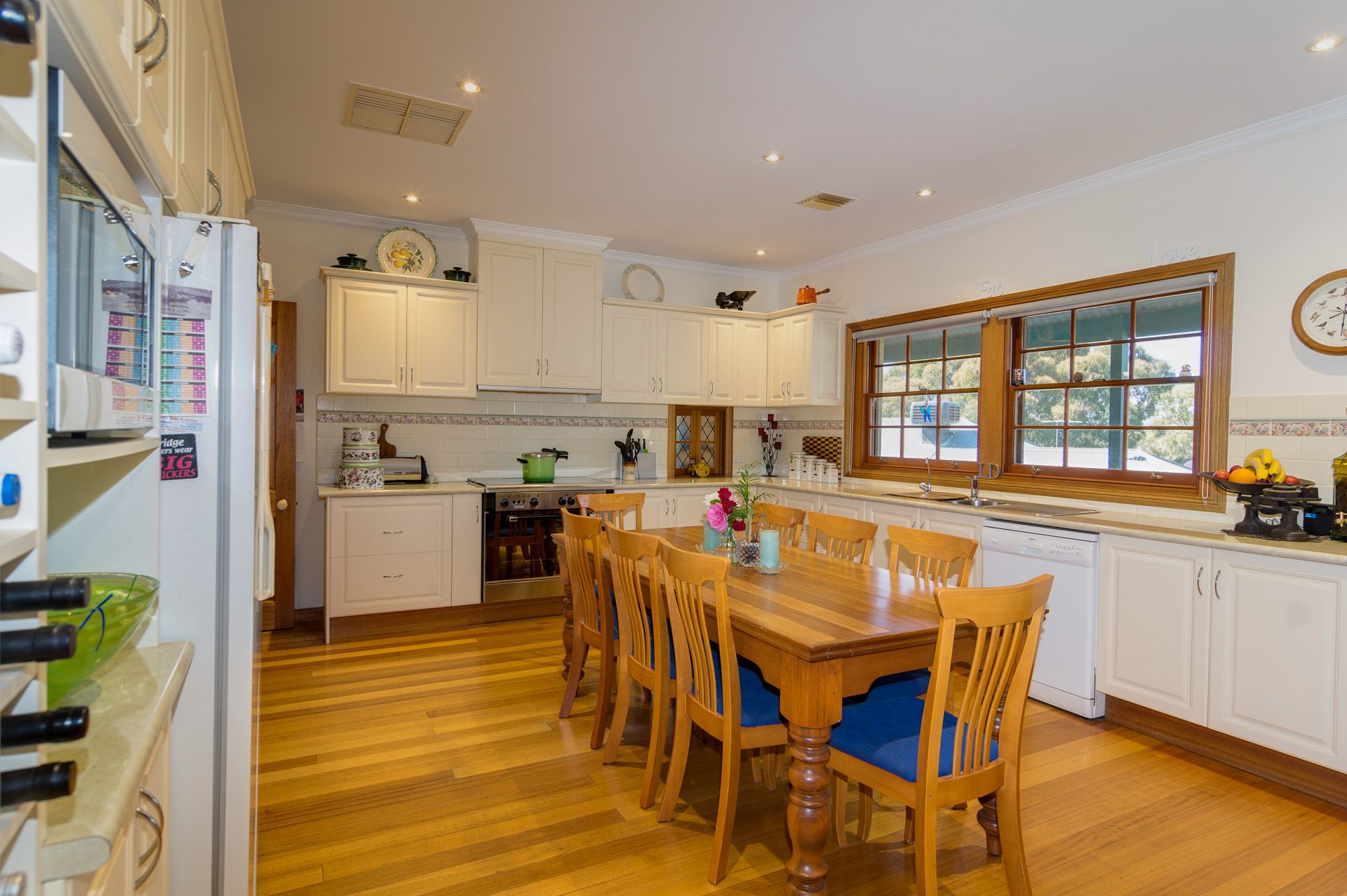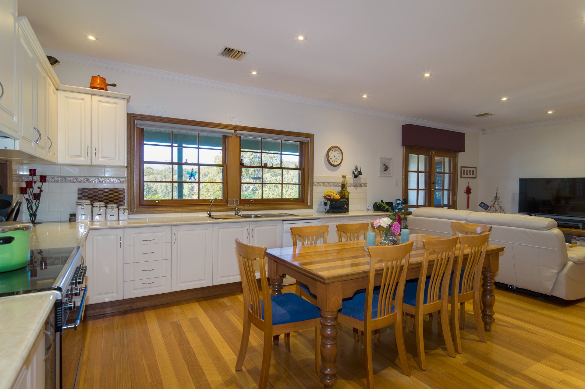 The home has 4 bedrooms, master with ensuite and Walk in Robe and bedrooms 2,3 & 4 with Built in Robes, 3.5 bathrooms, office, gym/craft room, home theater and 3 other separate living areas, including a 40sqm rumpus or billiard room. The floors throughout are a stunning solid Tasmanian Oak and the dcor is upmarket. There are two instant gas hot water services, ducted-evaporative cooling, ducted gas heating and LED lighting throughout the main living areas. The ceilings are 2.7m high and the windows large, allowing lots of light and providing a nice hillside aspect. The spacious Country kitchen offers quality 900cm gas oven & cook top, dishwasher and enough space for the whole family to sit and eat together.