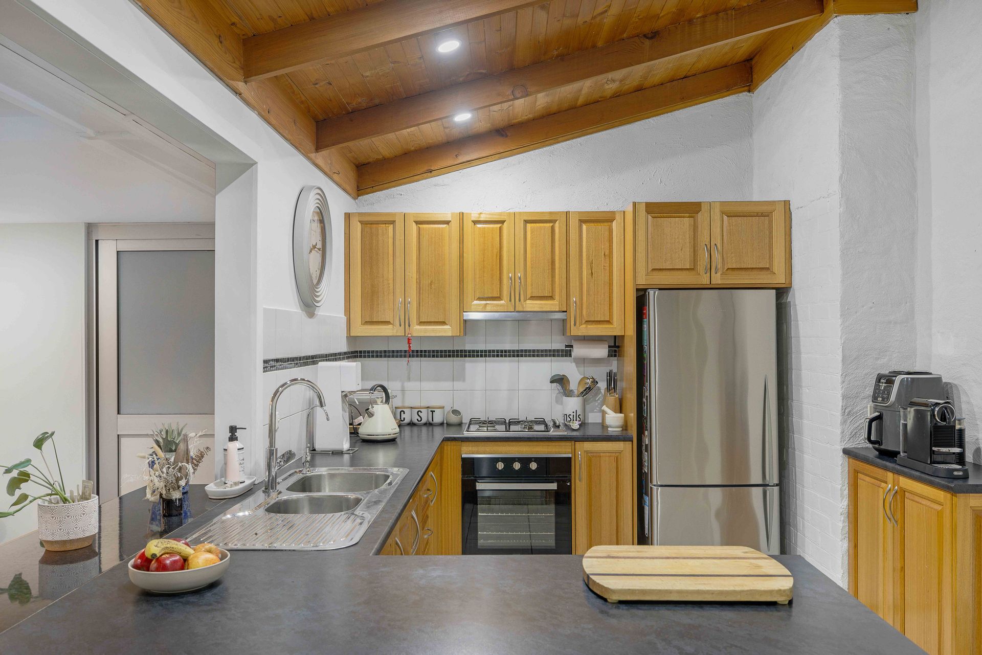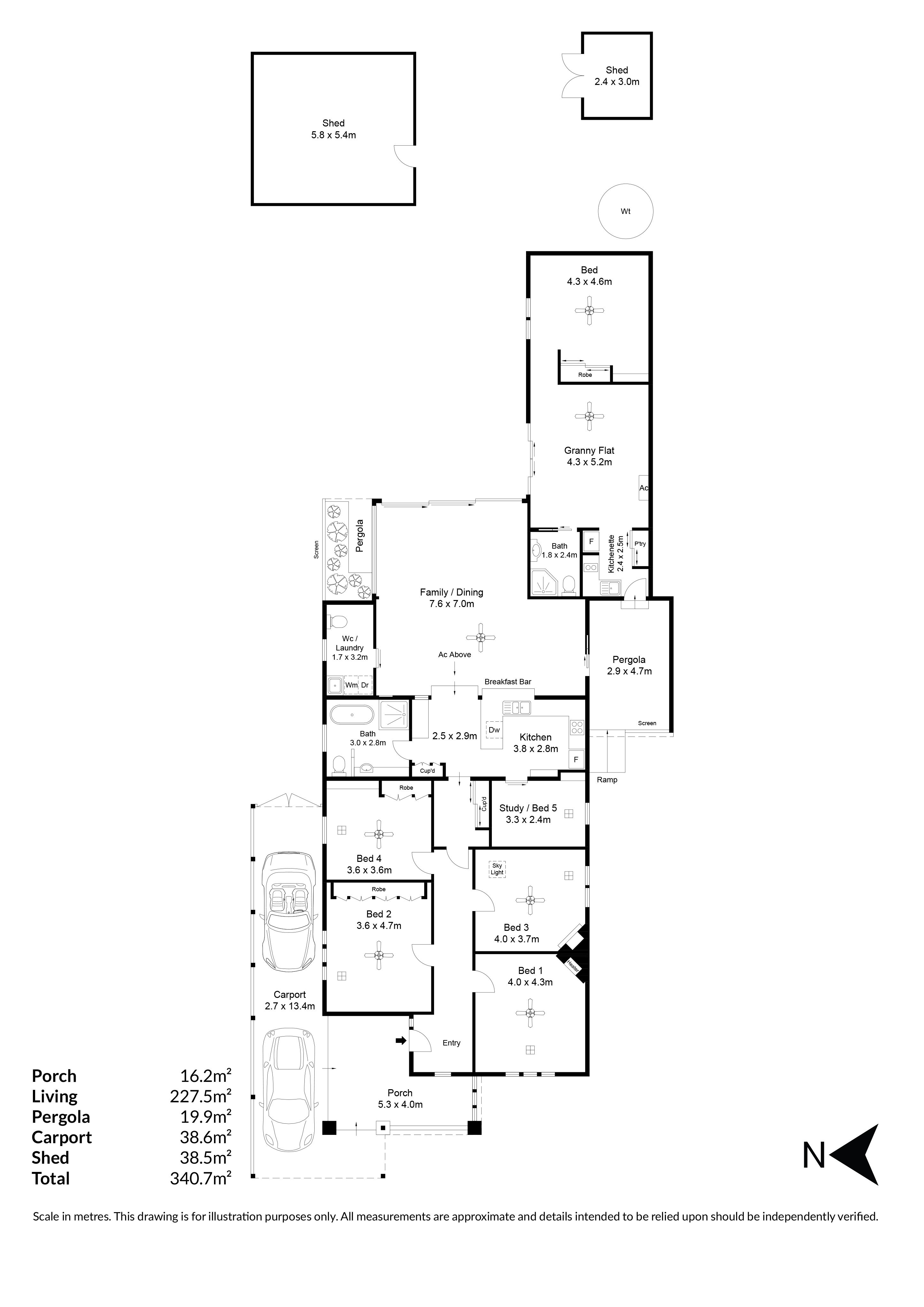 - Ducted reverse cycle air-conditioning throughout - Roller shutters - Ornate ceiling décor throughout - Kitchen with plenty of bench space a double stainless steel sink with filtered water tap, 4-burner gas cooktop, oven and dishwasher - Ample cupboard space and overhead storage - Spacious open plan living and dining area with ceiling fan and additional split system heating/cooling - Main bathroom with vaulted ceiling, a standalone tub, large vanity with wooden benchtops, a shower and toilet - Master bedroom with an ornate sandstone fireplace, including an electric gas heater and ceiling fan - Three additional bedrooms, all with floorboards, ceiling fans and two with built-in cupboards - Versatile study room, home office or fifth bedroom - Separate granny flat including a kitchen, bathroom and additional bedroom with a ceiling fan - Instant gas and solar system - Water tank - Low maintenance yard with lush gardens and plenty of room for entertaining - Undercover pergola - Four undercover parking spots - Two lock-up storage sheds