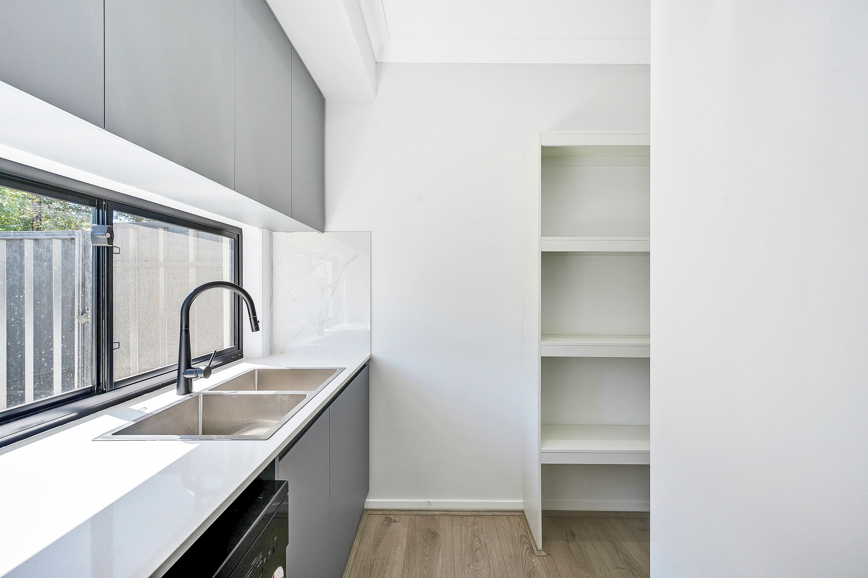 Luxuriously appointed wet areas include a spacious main bathroom with floor to ceiling tiles, deep relaxing bath, flat black tapware, frameless shower screen and rail shower, while a dedicated powder room and walk-through laundry complete the interior.