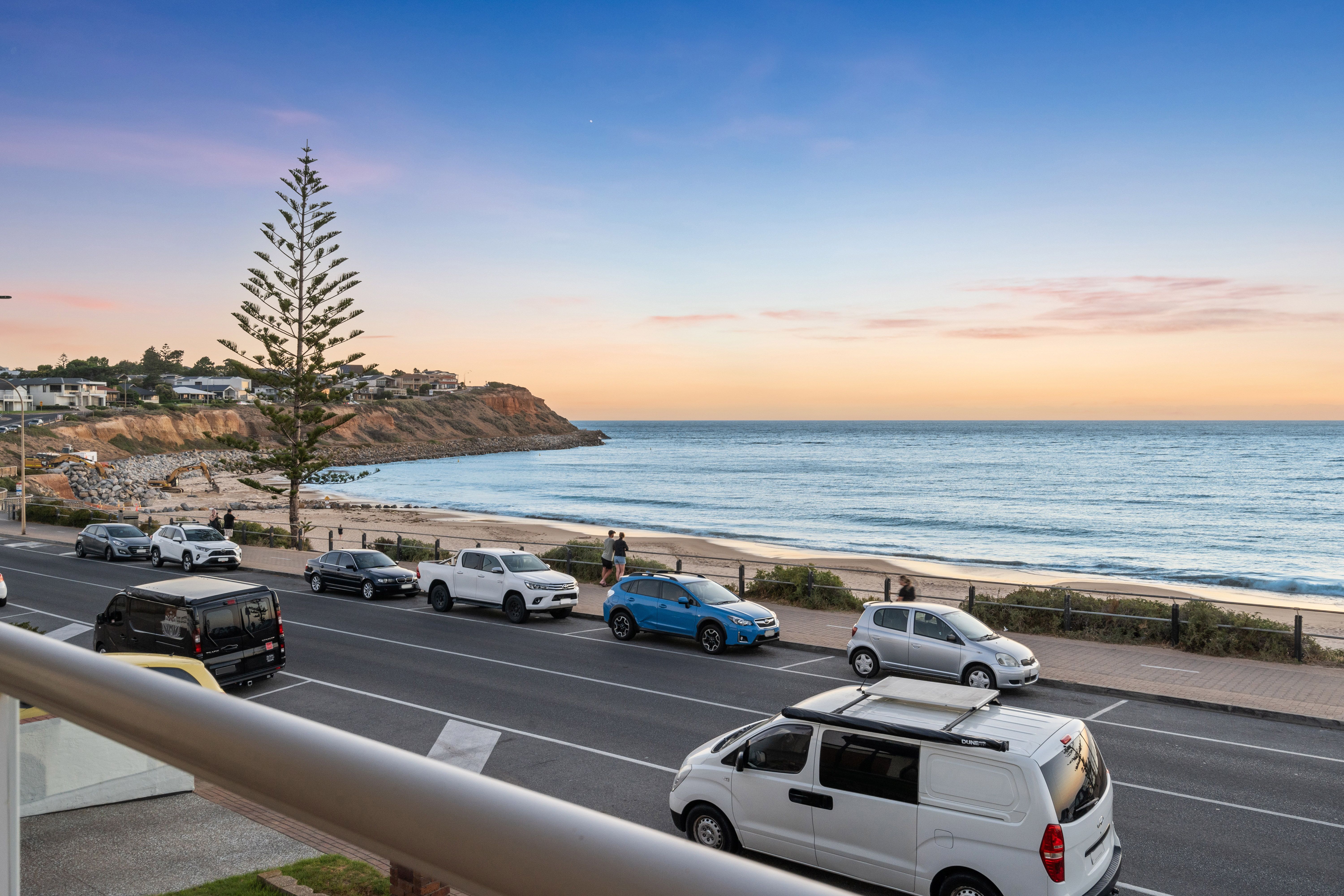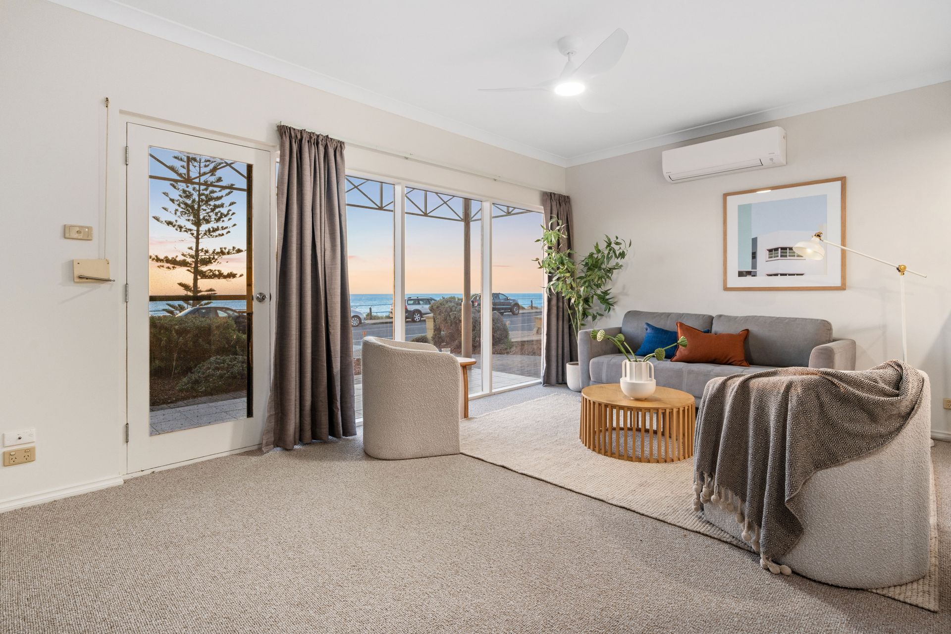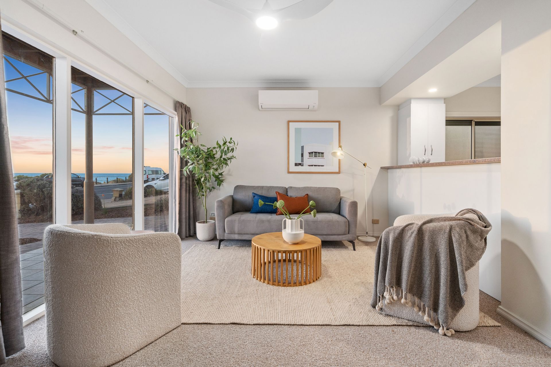 • Absolute beachfront location on the Esplanade • Breathtaking ocean views and spectacular sunsets • Light-filled interiors with a calming neutral palette • Seamless open-plan living, dining, and kitchen • Two spacious bedrooms on the ground floor • Master retreat upstairs with ensuite • Second spacious lounge (potential fourth bedroom) and balcony • Low-maintenance garden, perfect for relaxed coastal living • Steps to the sandy shores of Christies Beach • Close to cafés, shops, transport, and schools