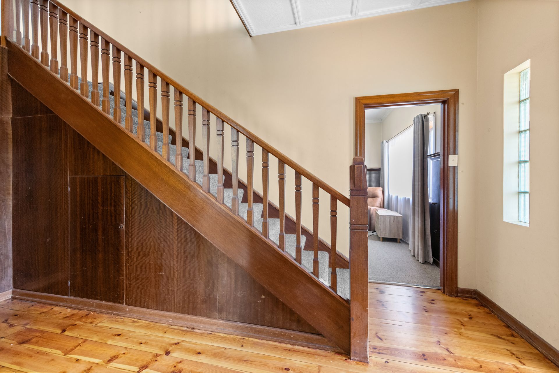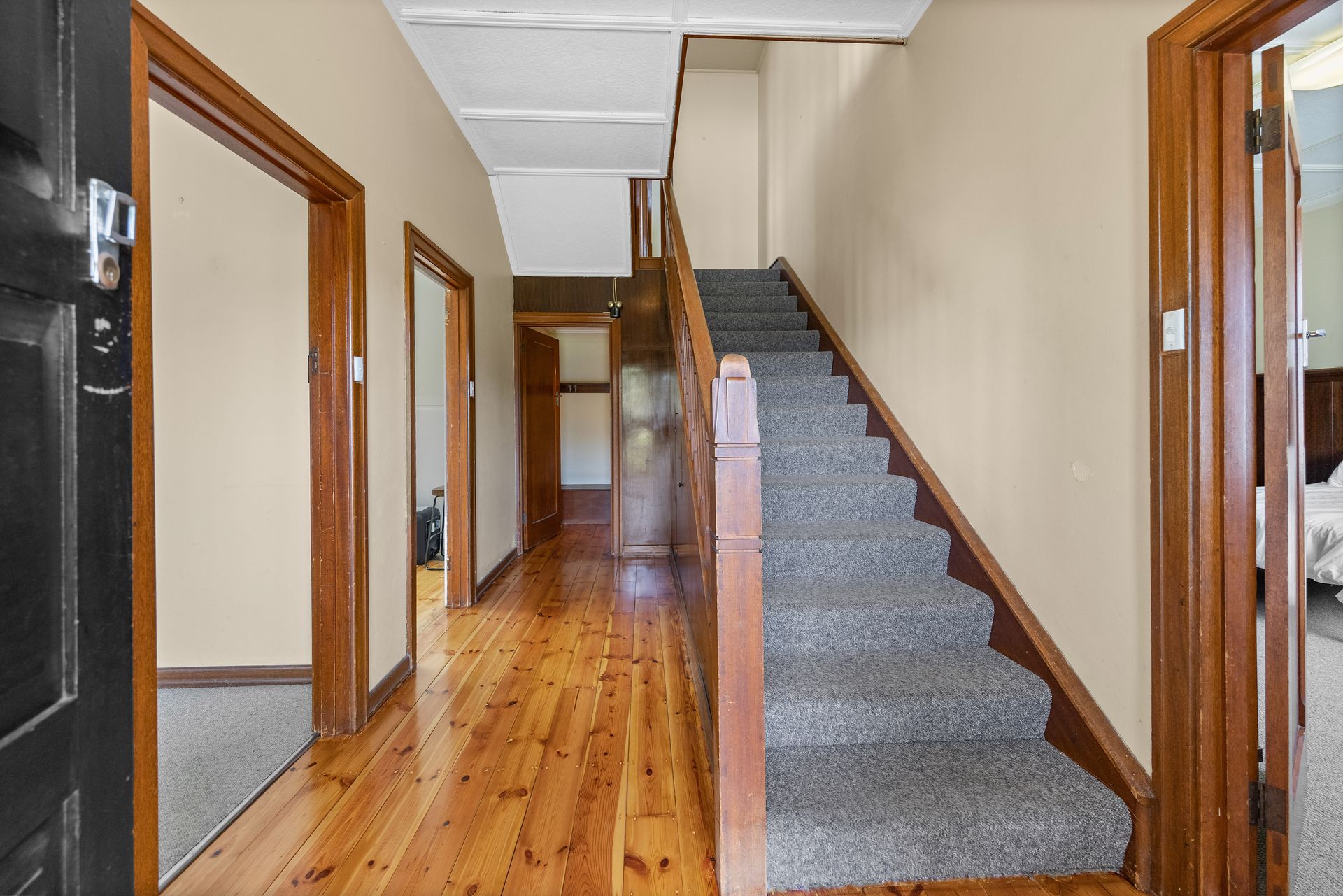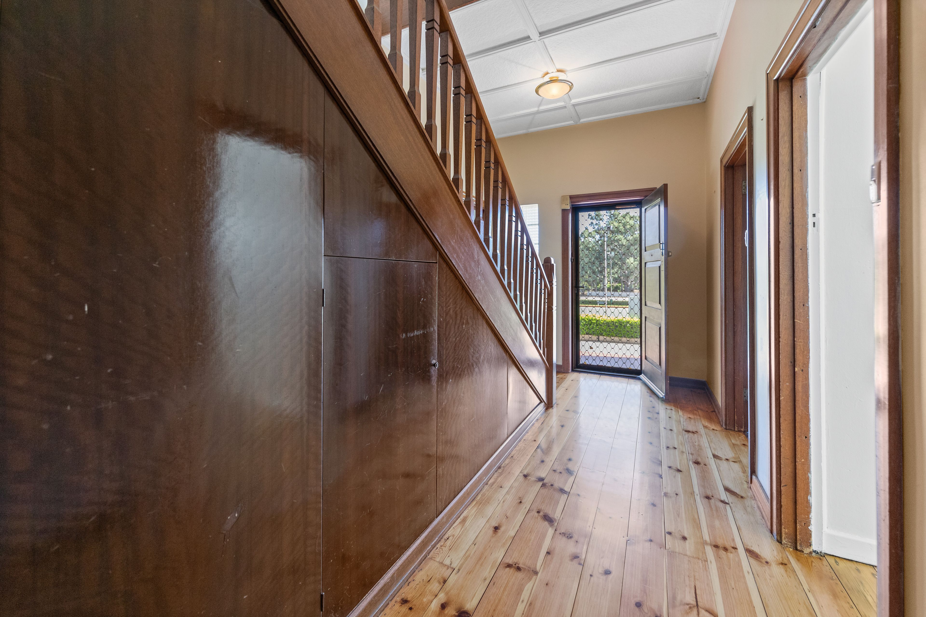 Walking up the stairs and through the front door, you are welcomed by polished Baltic pine floors, wrapping into the renovated kitchen. The first floor furtherly comprises of a large formal lounge featuring woolen carpet and wood paneling as well as a wood combustion heater and a split system for year-round comport. A formal dining space room, with the comfort of woolen carpet underfoot. A charming mud room under the staircase, as well as a large back porch including a separate toilet and laundry.