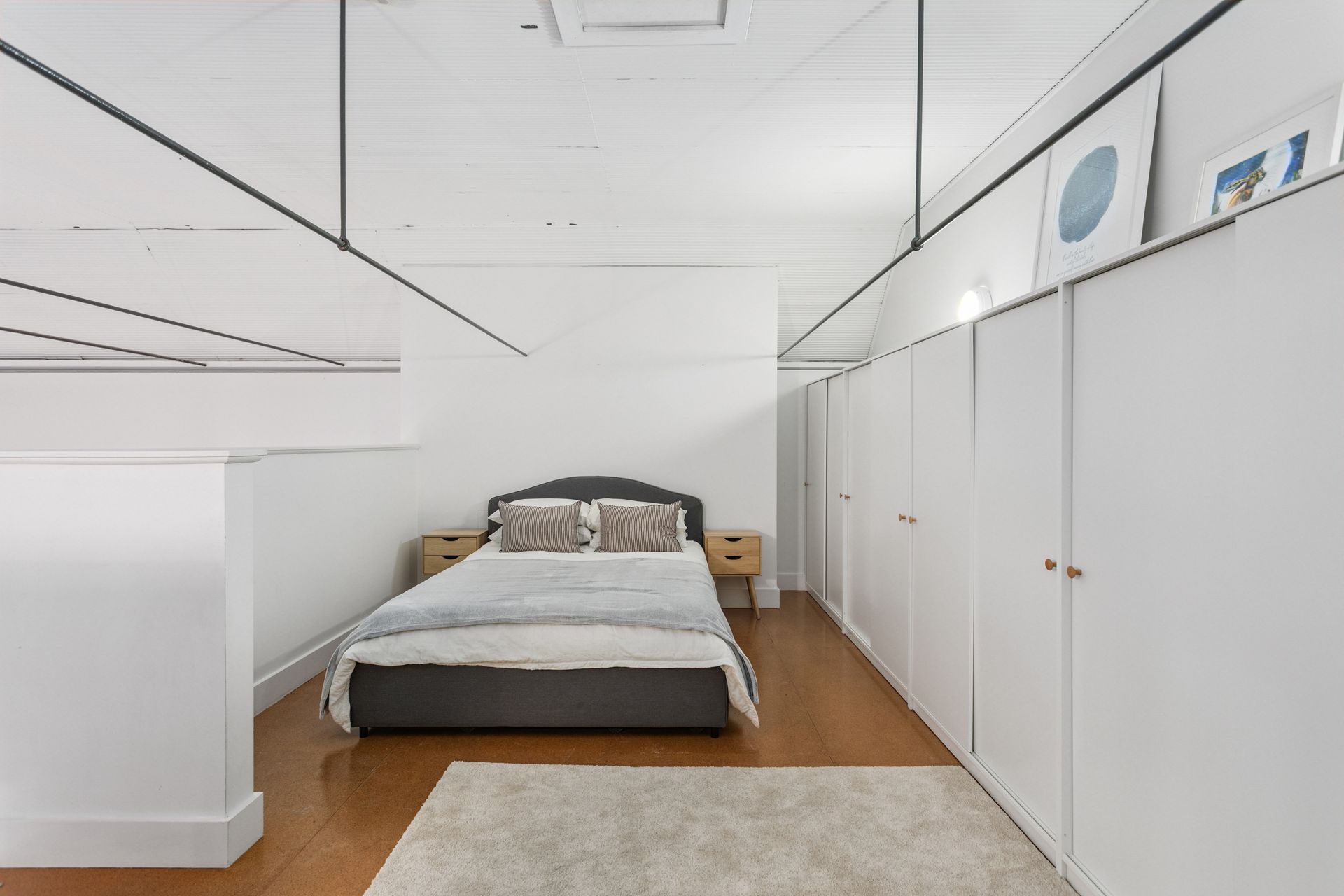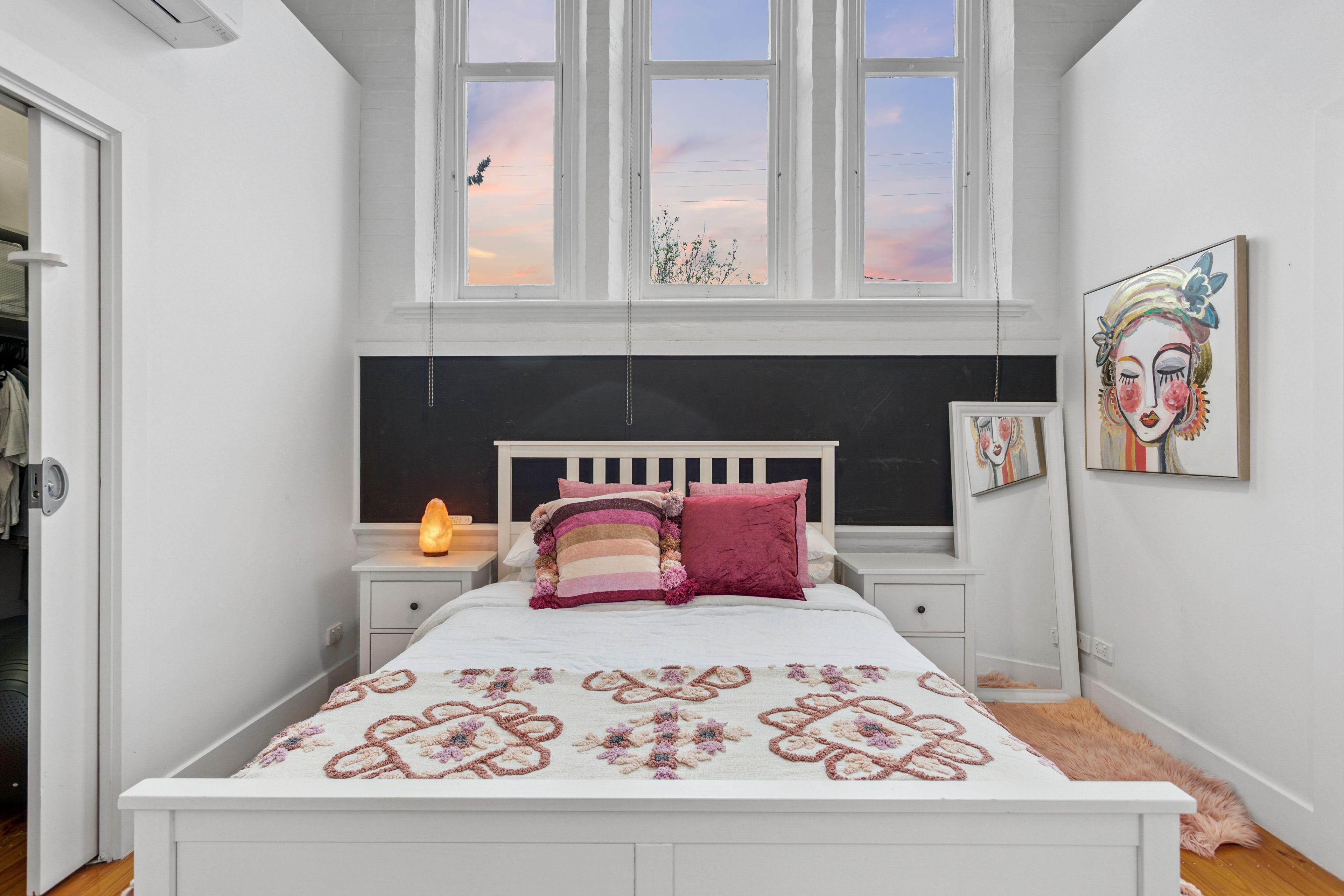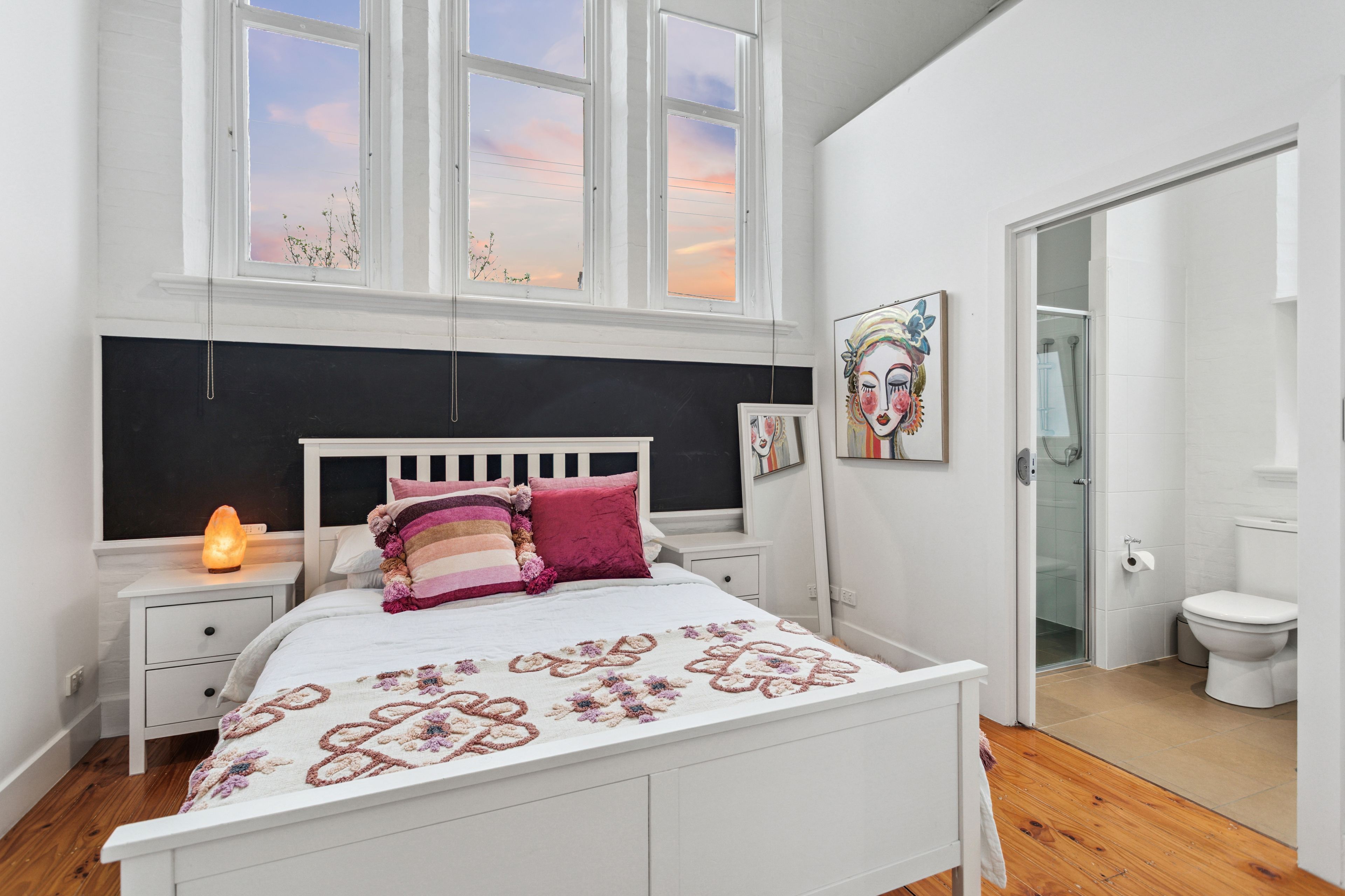 Behind its classic brick façade, the home reveals a spacious, light-filled interior that captures the scale and soul of its schoolhouse origins. The open-plan living and dining area is the true heart of the home - an impressive space framed by towering ceilings, beautiful Baltic pine floors, and soaring windows that bathe the interior in natural light. A blackboard wall spanning the width of the living area pays homage to the home's schoolhouse heritage, offering a creative and functional feature that ties the past beautifully into modern living.