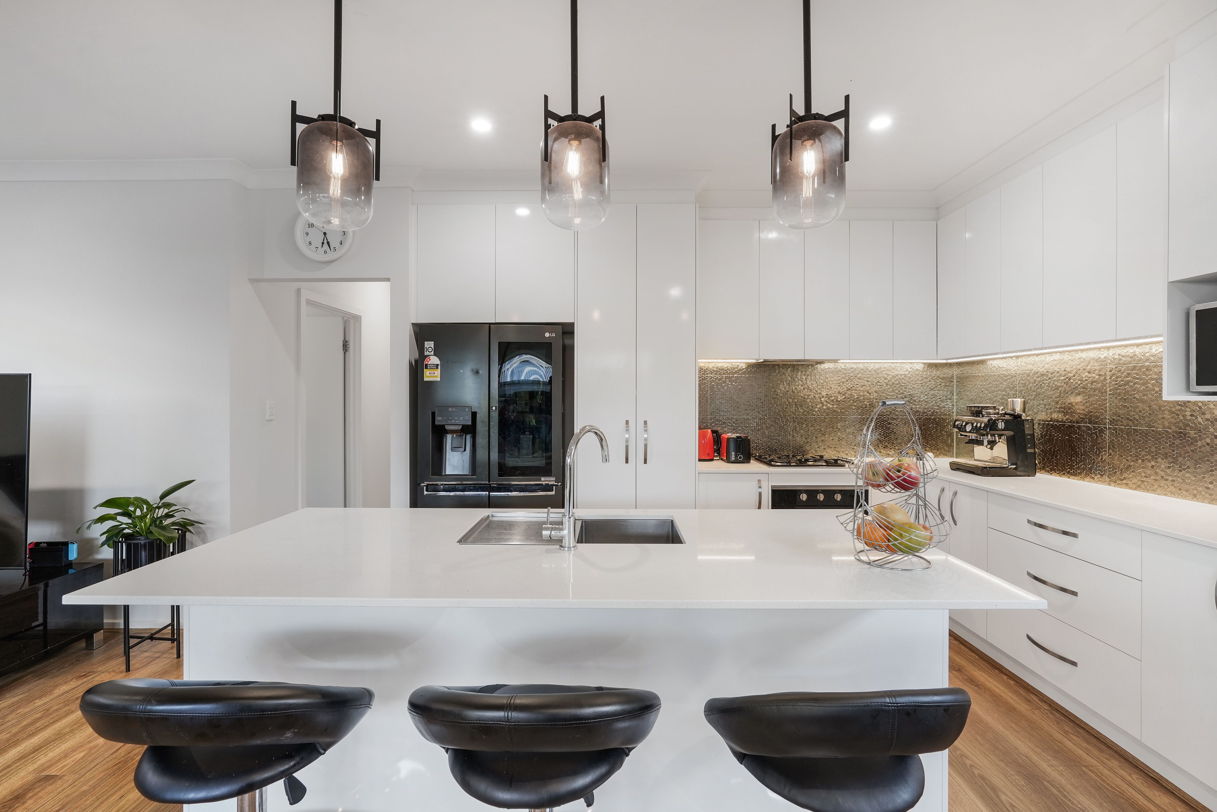 Gourmet all the way, the kitchen is well-kitted for creative cooks with a concealed rangehood over the gas cooktop/oven, undermount twin sink and dishwasher, and a swag of soft close cabinetry with sleek white finishes. The star power comes in the style department with stone bench tops, a shimmering tiled splashback behind the rear work bench, a trio of bespoke pendant lights over the island dining bar that add a hint of industrial cool, and the elegant gooseneck tap.