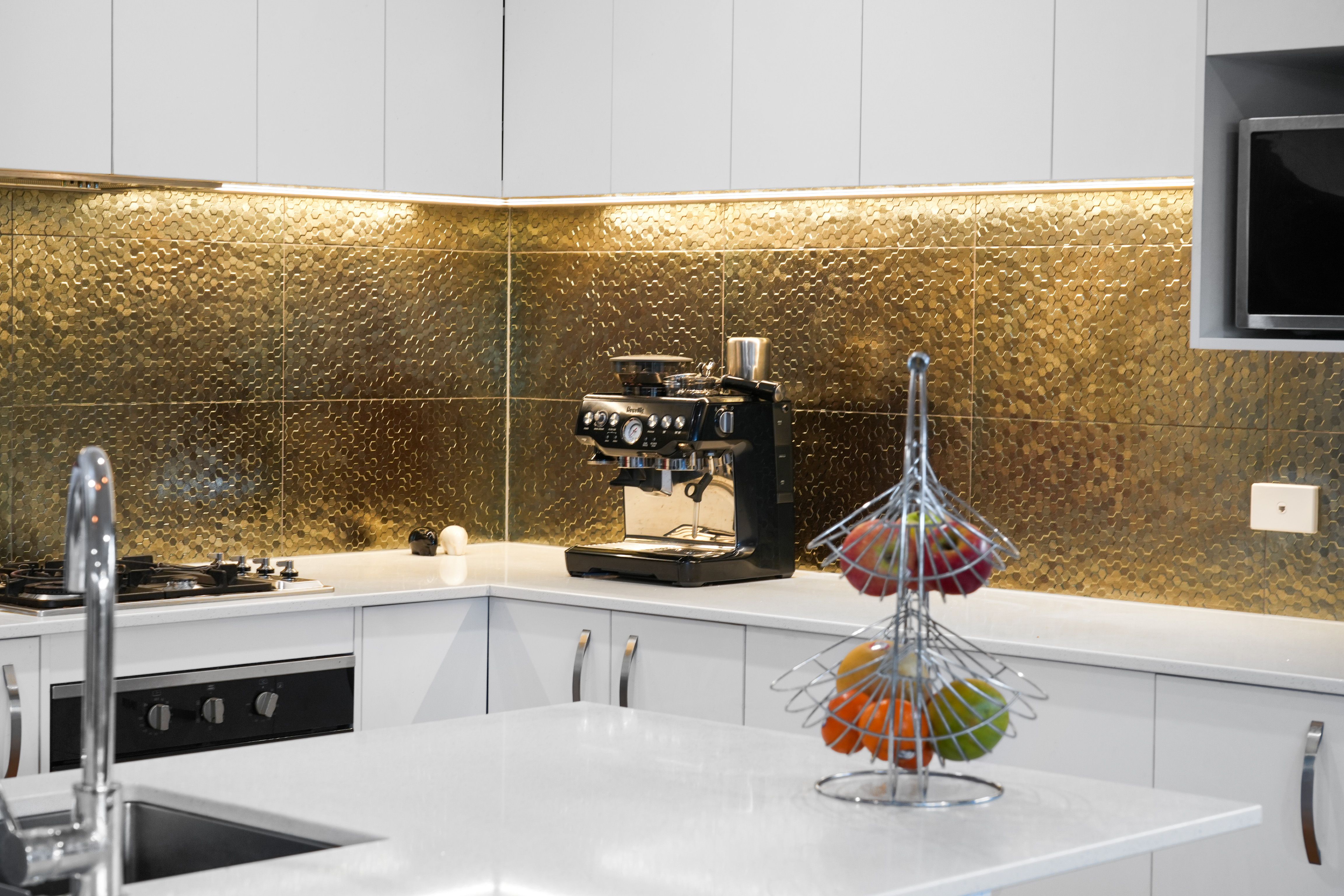 ? Island dining bar with twin undermount sink - drainer attachment included - dishwasher and pendant lights, shimmering splashback tiles over gas cooker/oven, reams of soft-close storage, fridge water connection