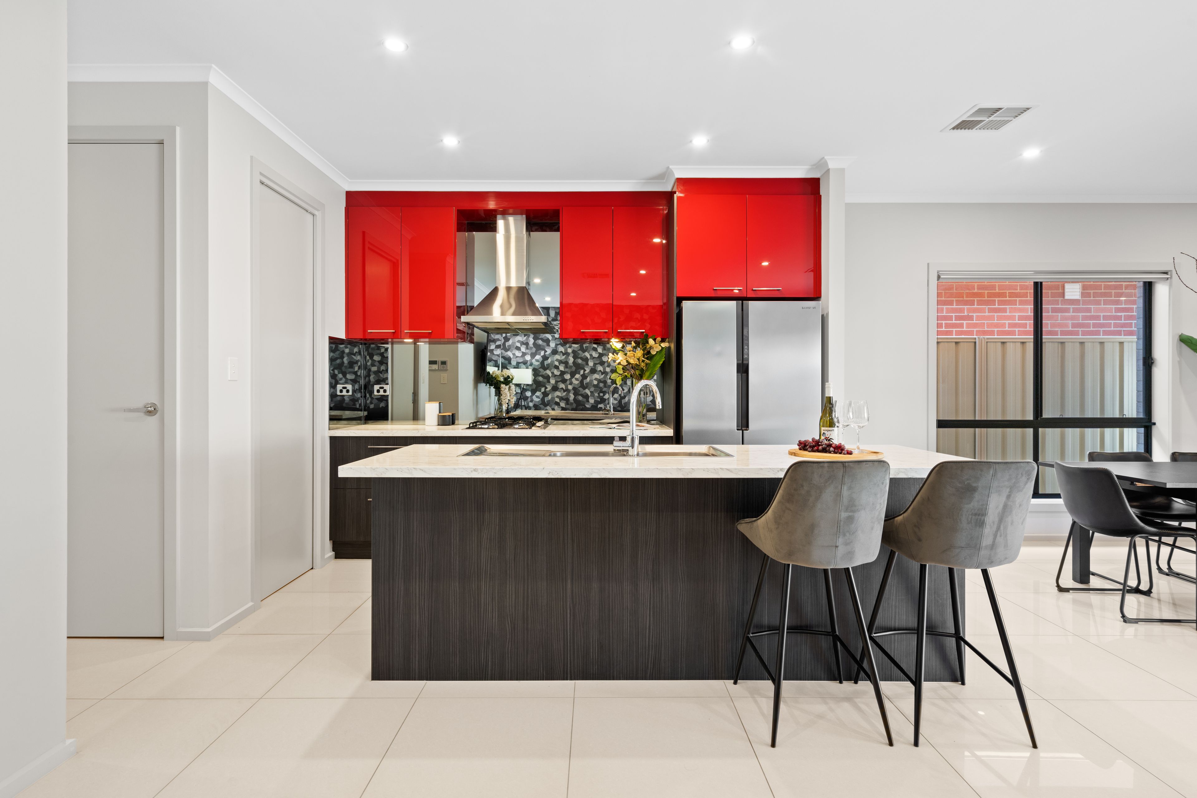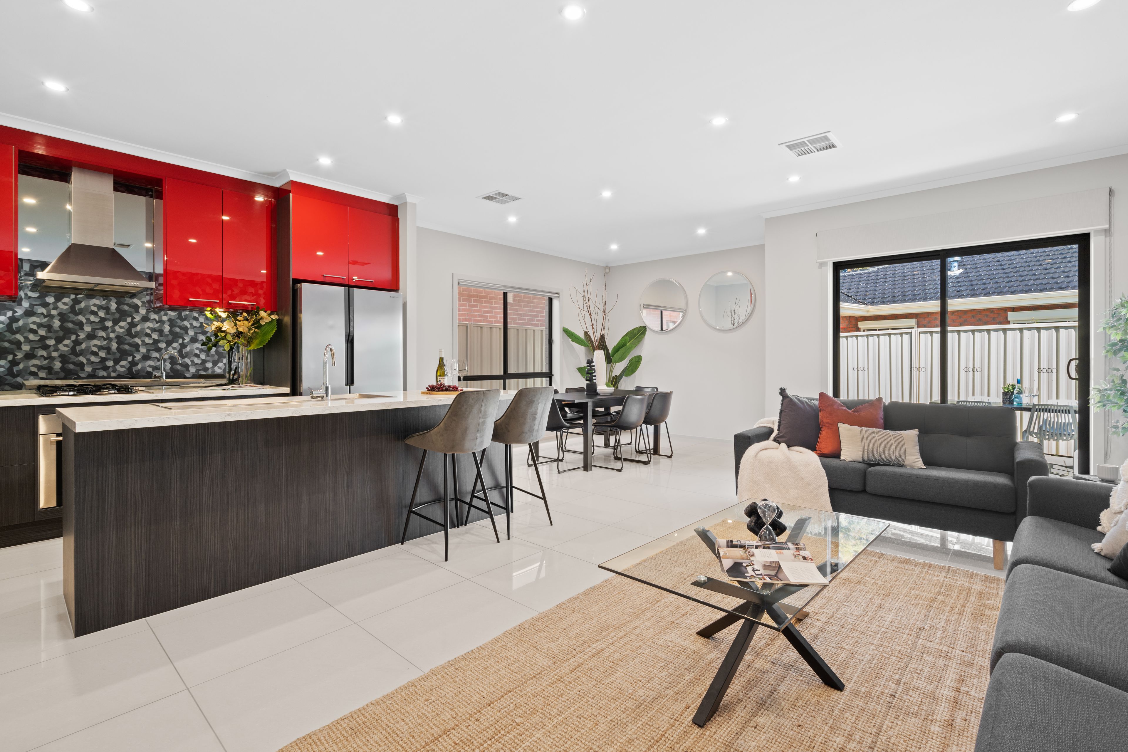 The heart of the home is the expansive open-plan kitchen, living, and dining area. The kitchen is both stylish and functional, featuring cabinetry that adds a striking pop of colour, a spacious island with breakfast bar seating, and stainless-steel appliances, including a gas cooktop. It's the perfect setting for cooking and entertaining, with a seamless flow into the dining and lounge spaces. Sliding doors lead from the living area to a private outdoor patio, providing a low-maintenance spot for alfresco dining or relaxing on sunny days.