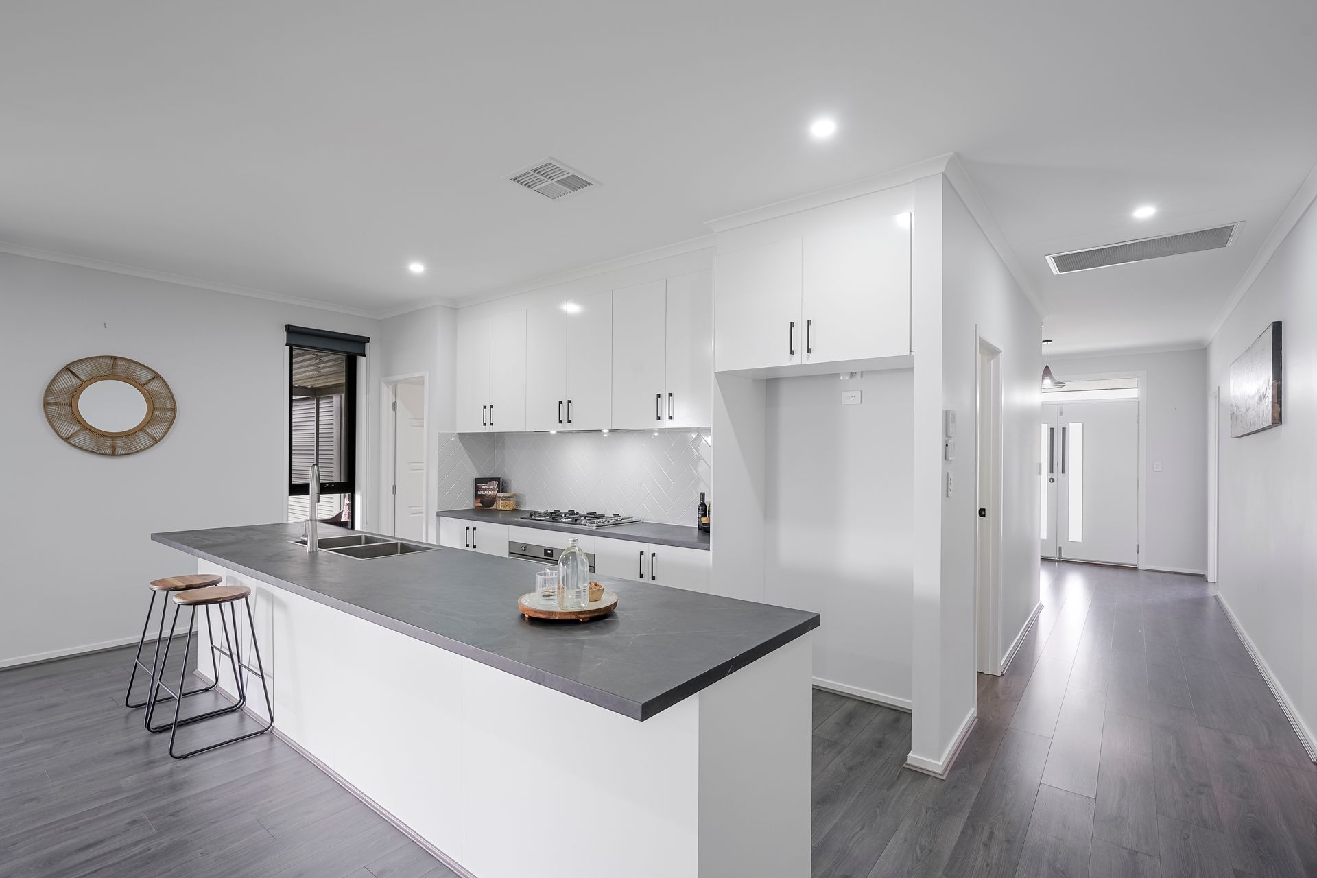 The heart of the home is the open-plan kitchen, living, and dining area, where you'll enjoy an expansive island bench with a double sink, a 900mm 5 burner gas cooktop, a 900mm family size electric oven, as well as the must-have dishwasher. The walk-in pantry offers direct access to the garage, adding convenience and functionality - simply park your car and unload your shopping with ease.
