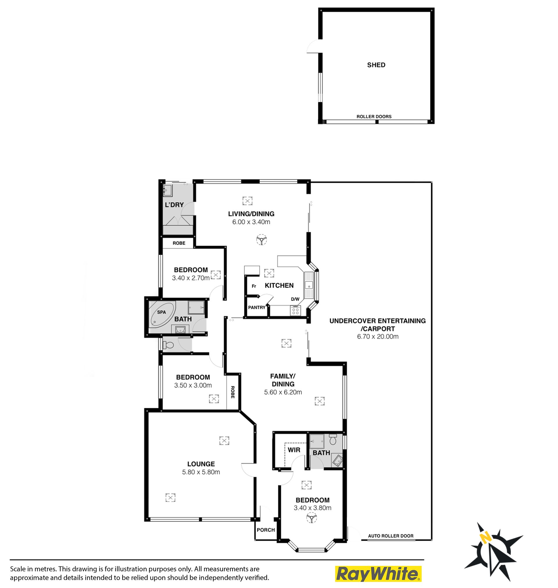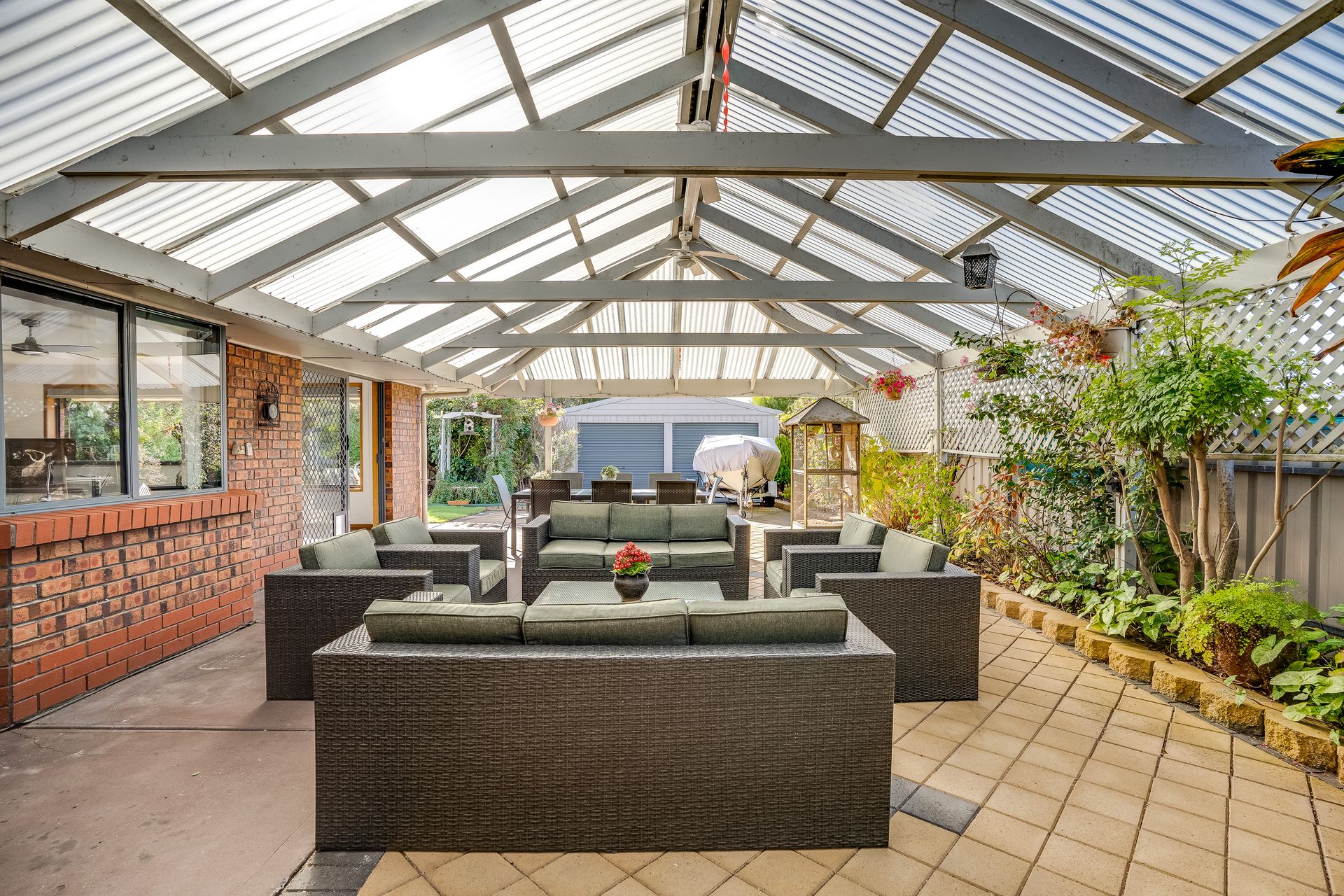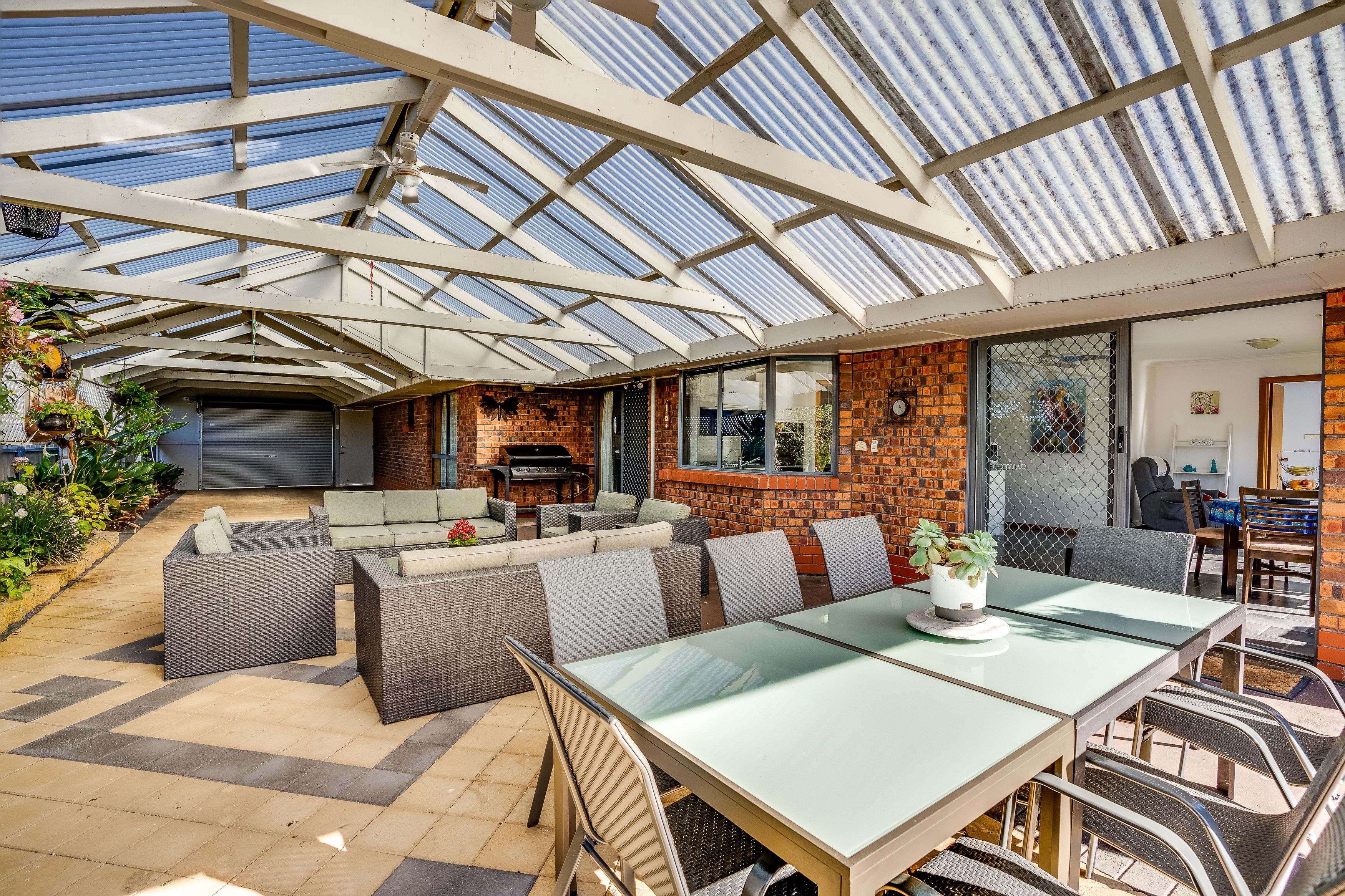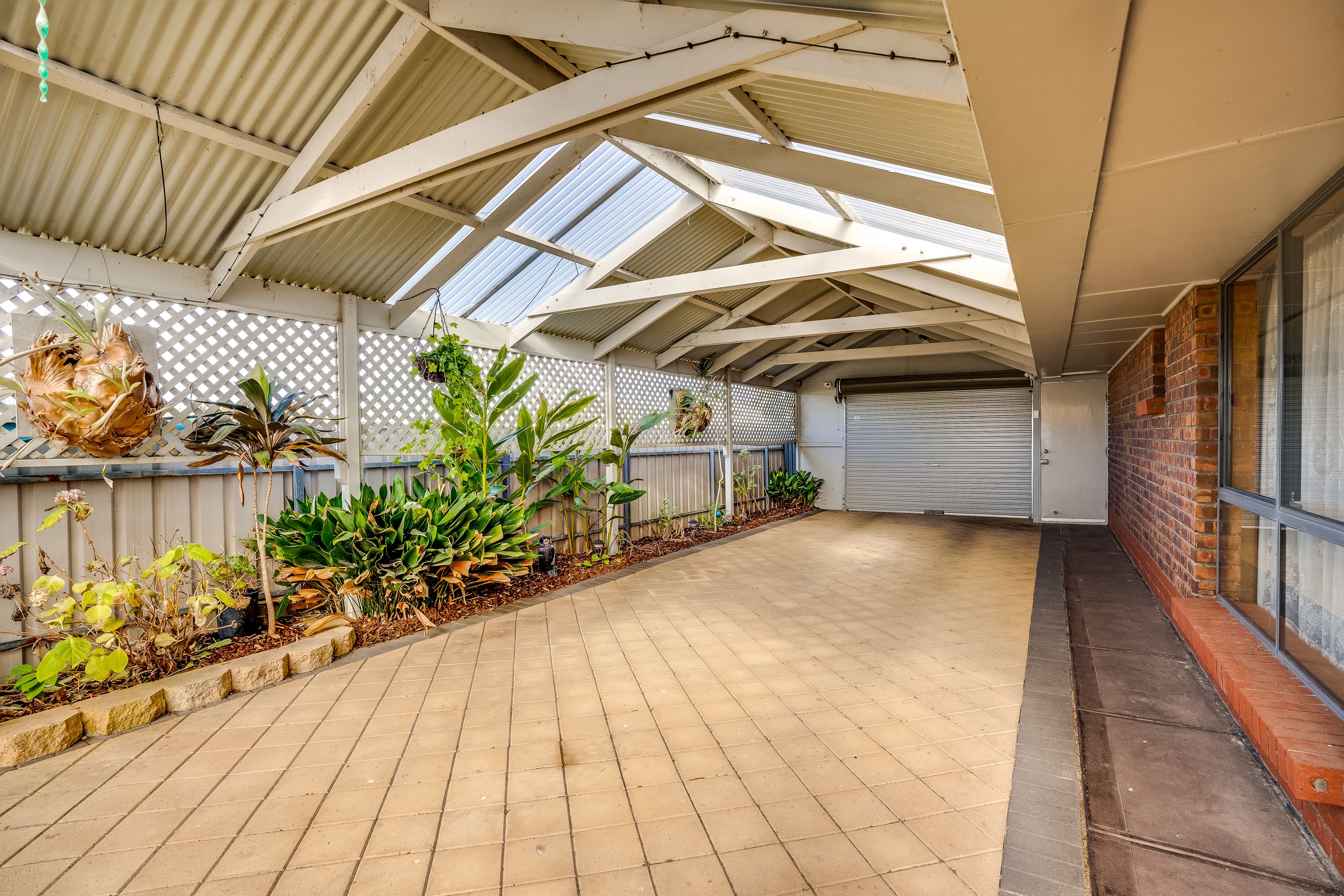 Double carport / garage with electric roller door leads through to the entertaining area and then to a good sized shed in the rear yard with concrete floor and power, plenty of room for storage and / or a workshop area.