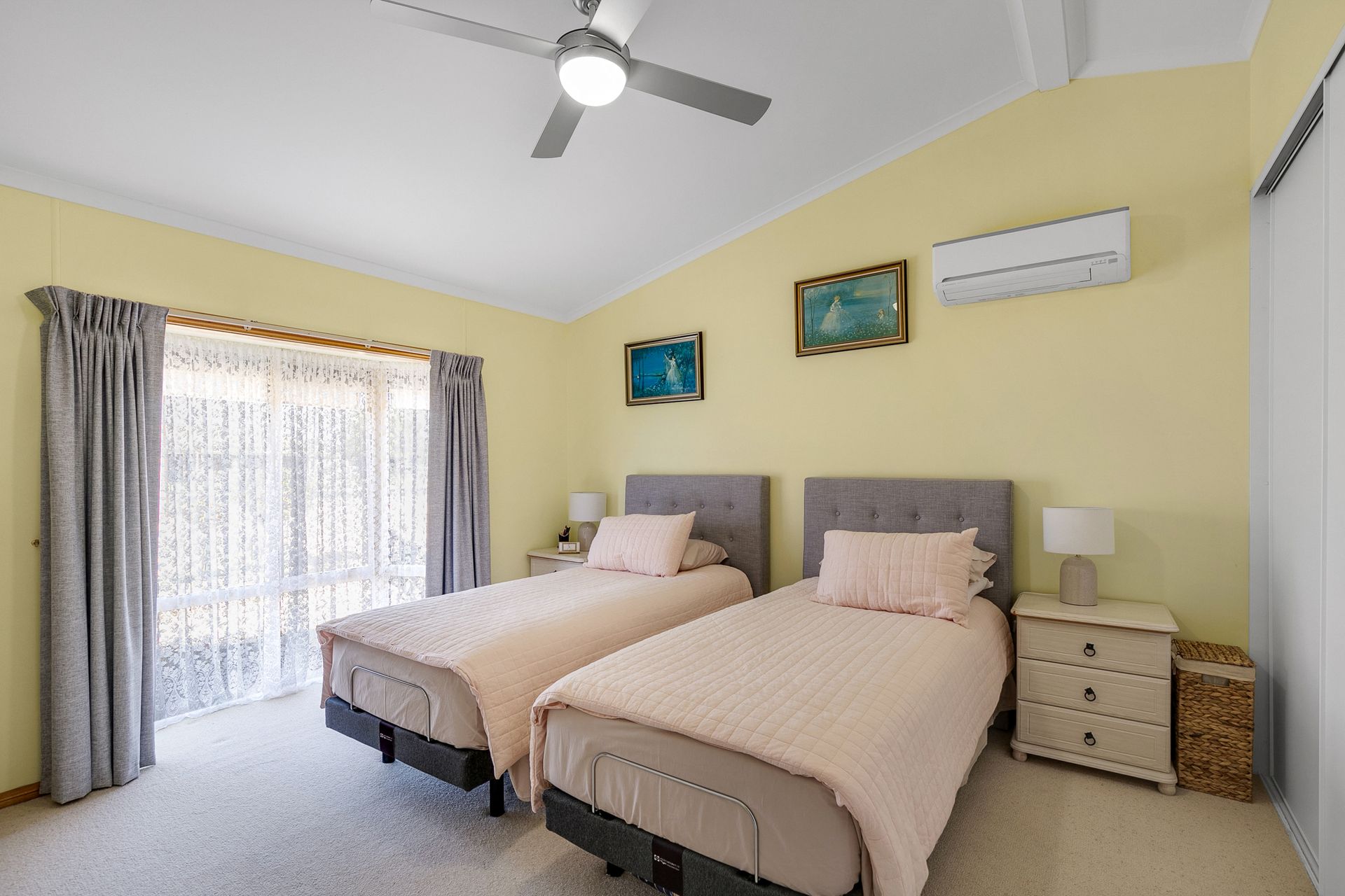 The home offers two generously sized bedrooms. The main bedroom features another bay window, built-in robes, reverse-cycle air conditioning, and direct access to the central bathroom. The second bedroom is also bathed in natural light and includes a ceiling fan and freestanding wardrobe.