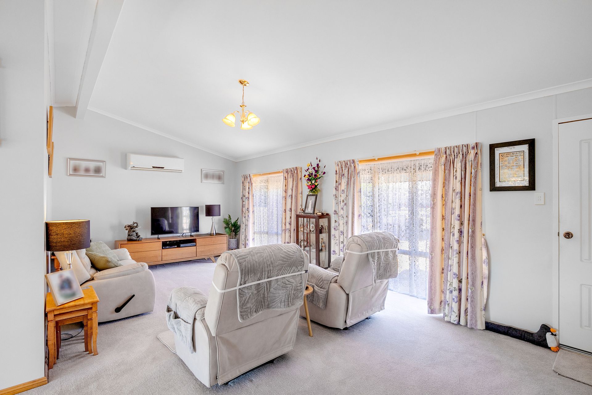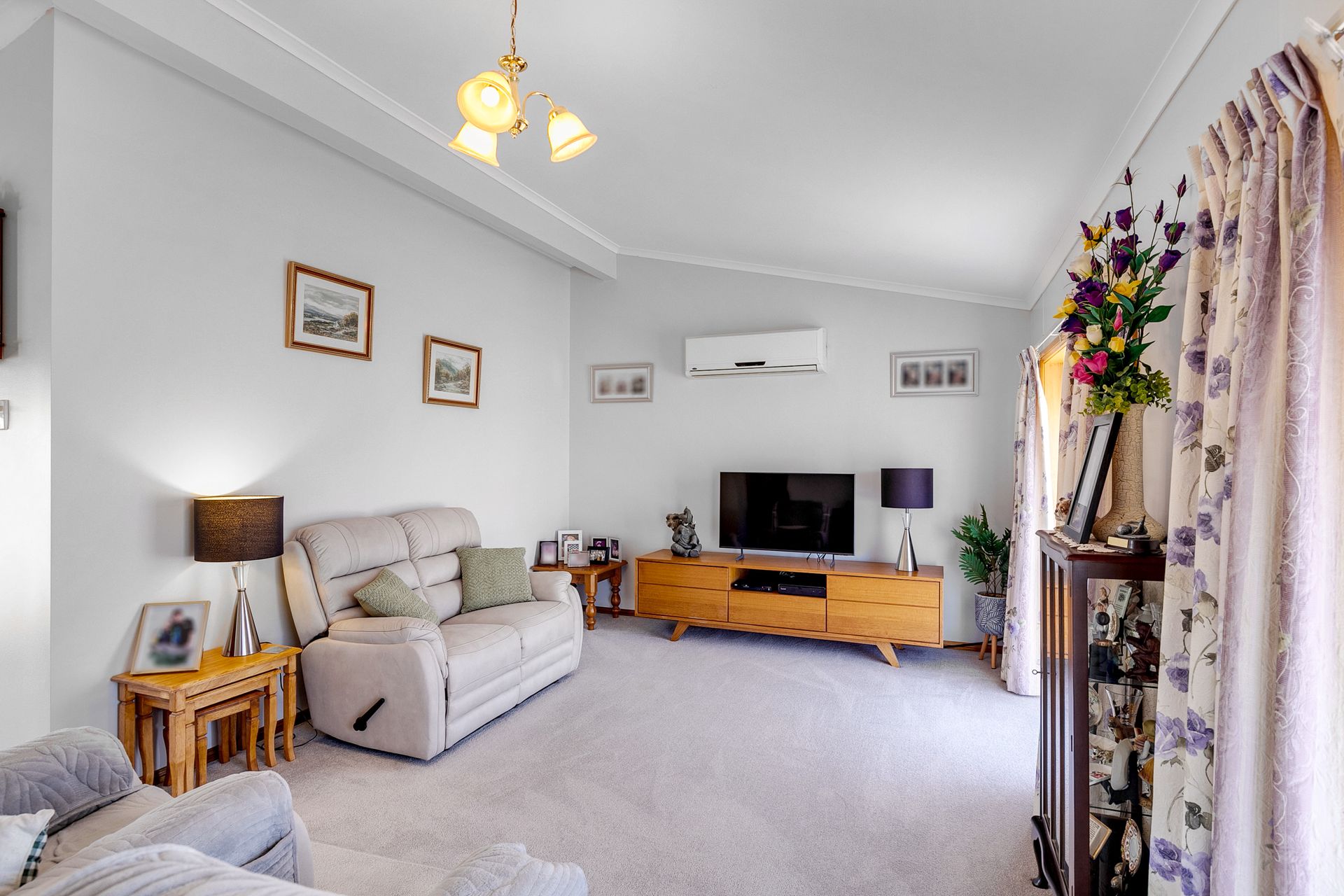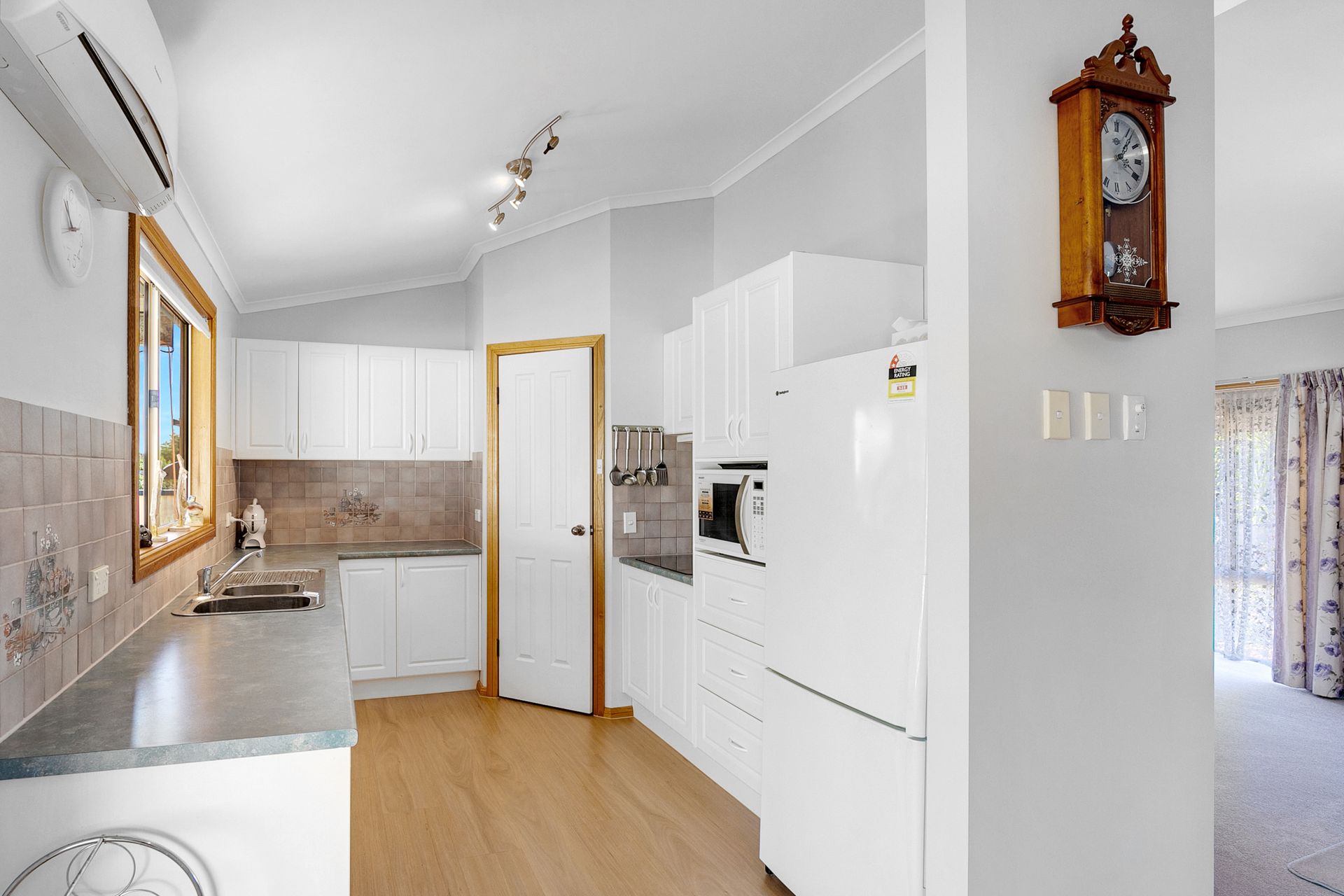 Step inside to find a light-filled, open-plan kitchen, dining, and lounge area, framed by raked ceilings and thoughtfully finished to create a sense of space and style. The carpeted lounge, complete with two of the signature bay windows and a reverse-cycle split system, is the perfect spot to relax. Meanwhile, the kitchen and dining areas feature vinyl timber plank flooring, a ceiling fan for comfort, and a well-equipped kitchen boasting a ceramic cooktop, convection microwave oven, and a walk-in pantry.