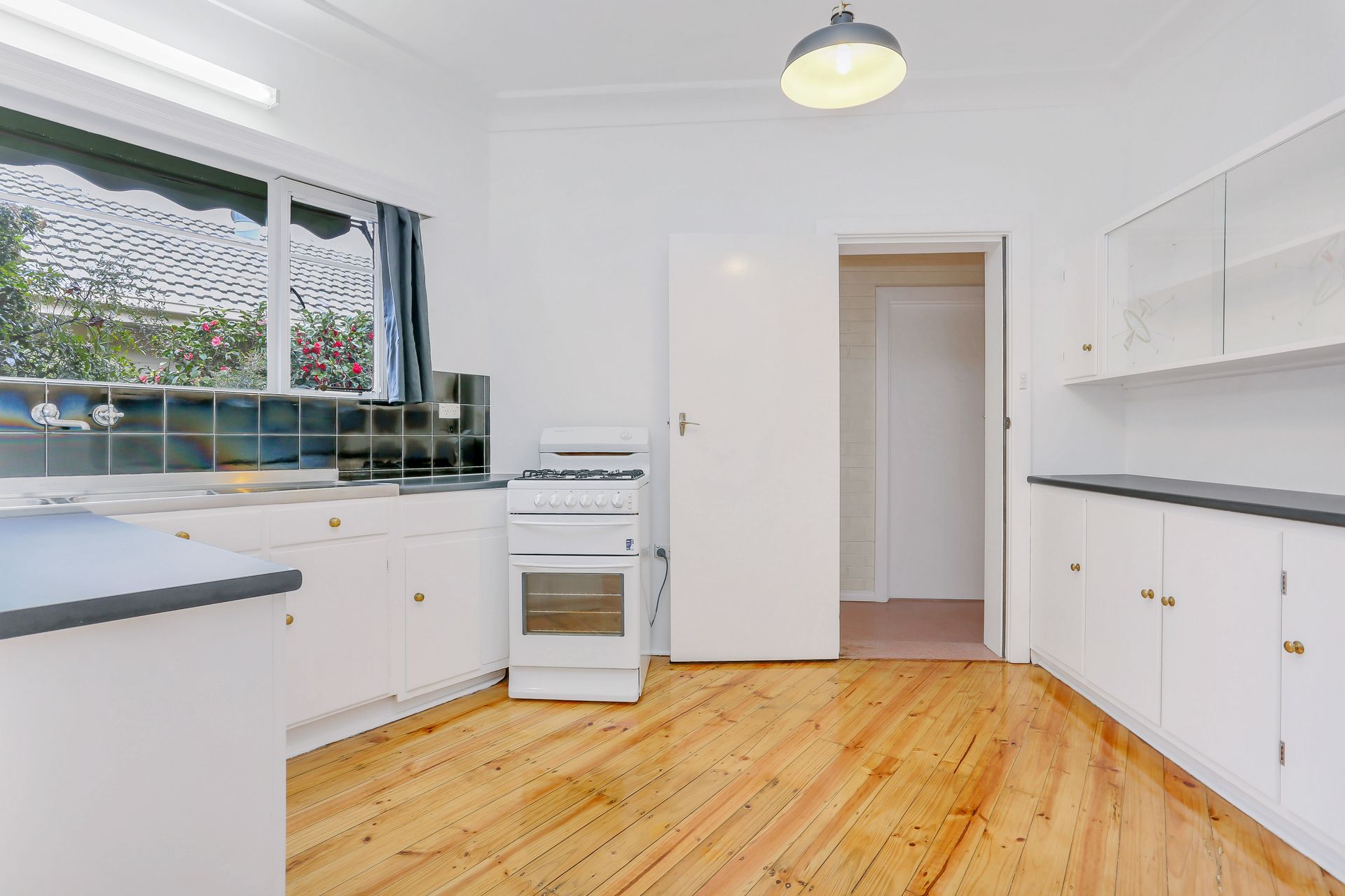 Crisp polished timber floors and freshly painted neutral tones flow throughout the main home body, creating a vibrant contemporary living space where art deco features add a desirable original elegance. A large living room is bright and airy with a kitchen/ dining adjacent. The original kitchen is in impeccable condition with crisp black & white styling and upgraded stove.