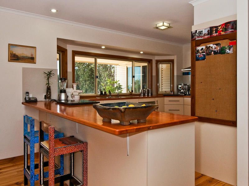 Upstairs features a stunning kitchen with timber bench tops, ample cupboards, time saving dishwasher, microwave provision and gas cooking. The kitchen has a long breakfast bar and opens to the huge open plan living area which features two over sized balconies providing panoramic views toward the ocean and over the surrounding hills and valleys.