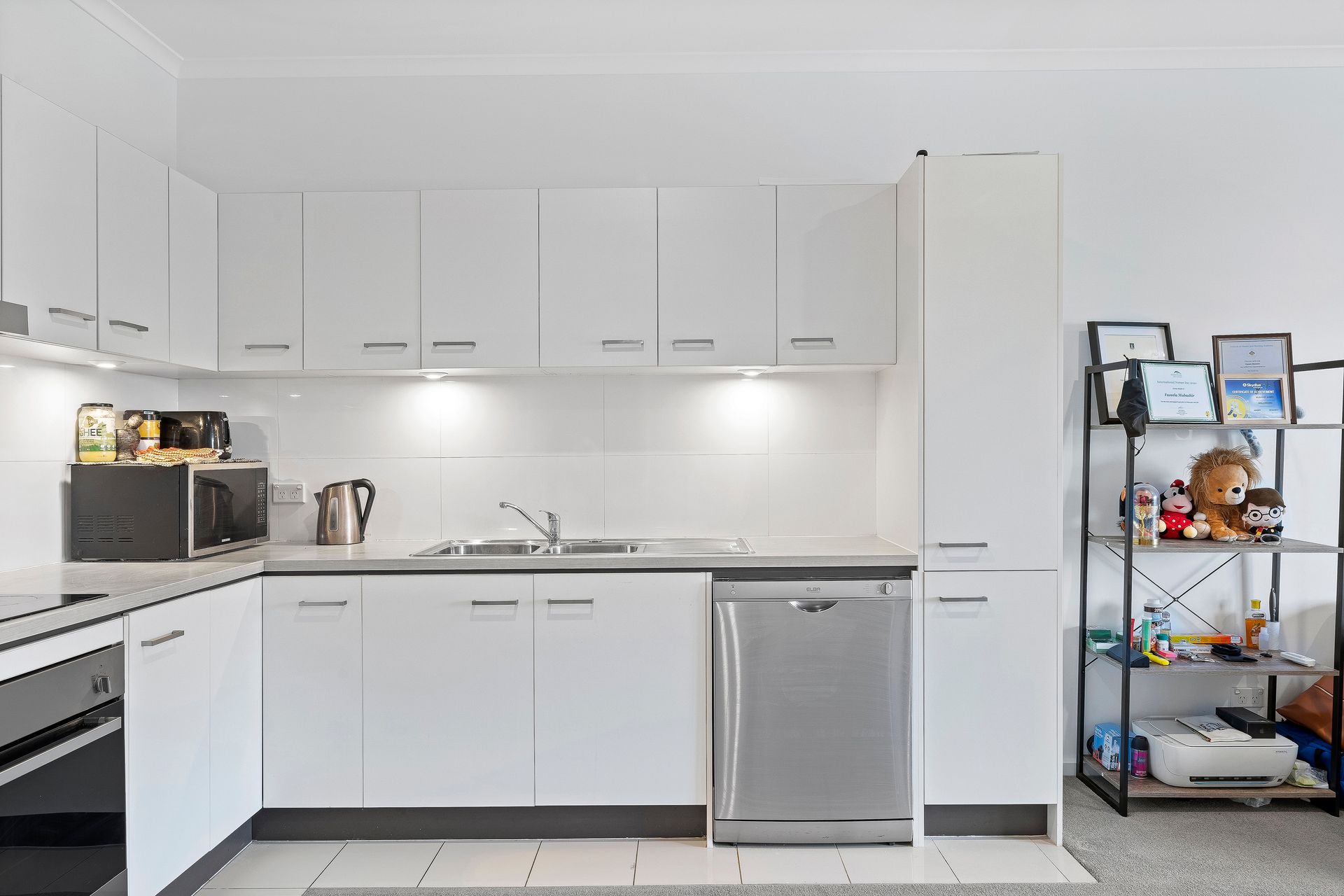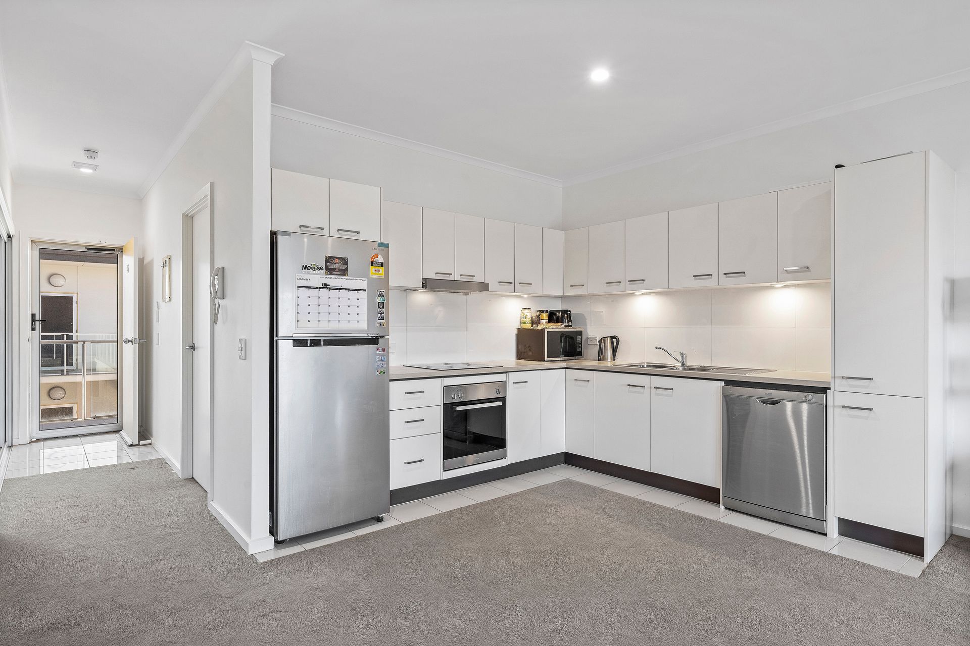 Relax in a spacious living/dining room featuring fresh quality carpets and bright neutral tones. An integrated corner kitchen provides timber bench tops, tiled splashbacks, ample overhead cupboards, double sink, glass cooktop and modern appliances.