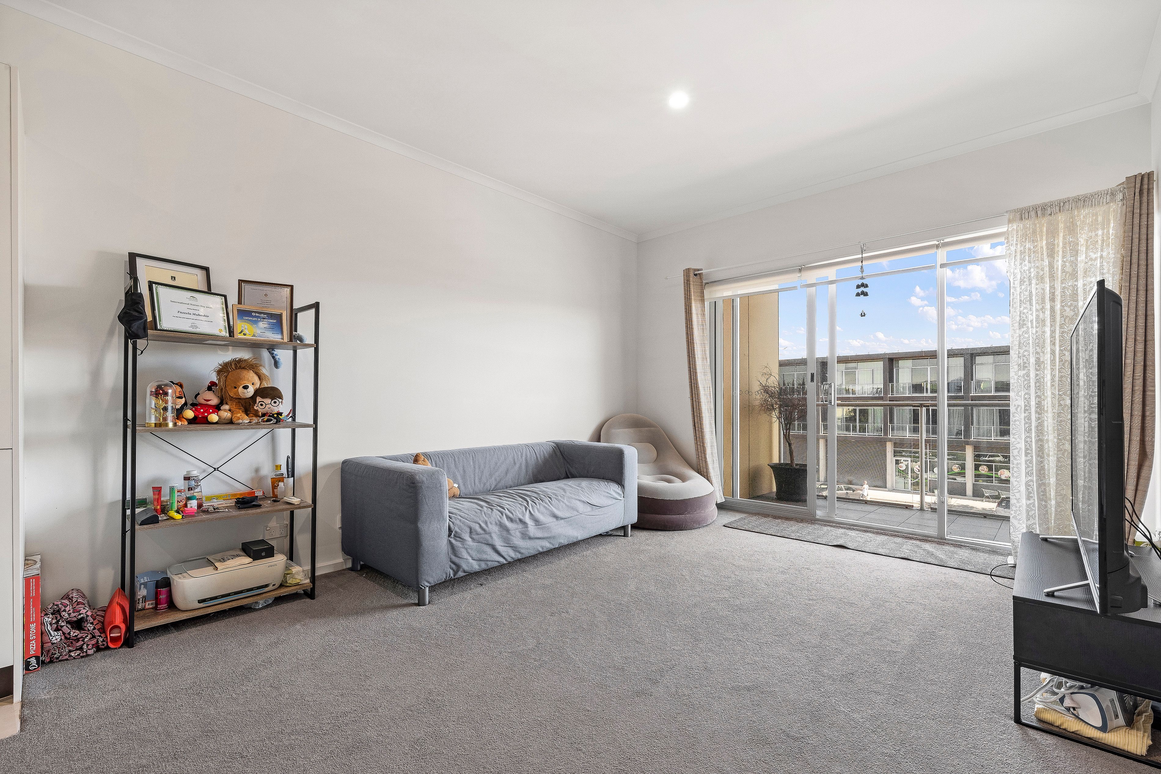 * Living room with sliding door to balcony overlooking street