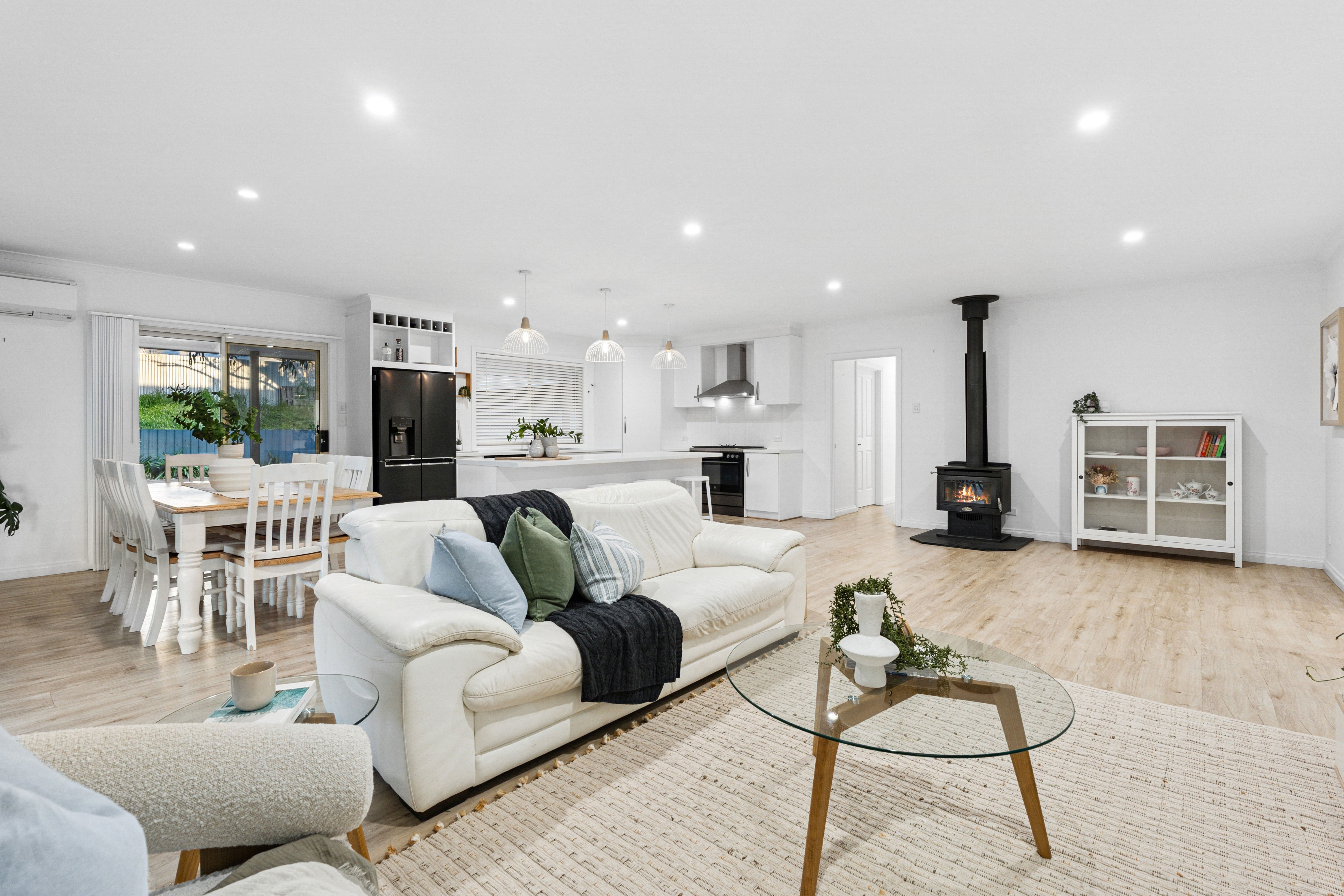 Step inside and be greeted by sophisticated details, starting with the elegant tray ceiling in the entrance. Downlights throughout and a cozy combustion heater create a warm, inviting atmosphere. The well-designed floor plan offers exceptional flexibility with four spacious bedrooms plus a dedicated study/fifth bedroom, catering perfectly to families or those who work from home.