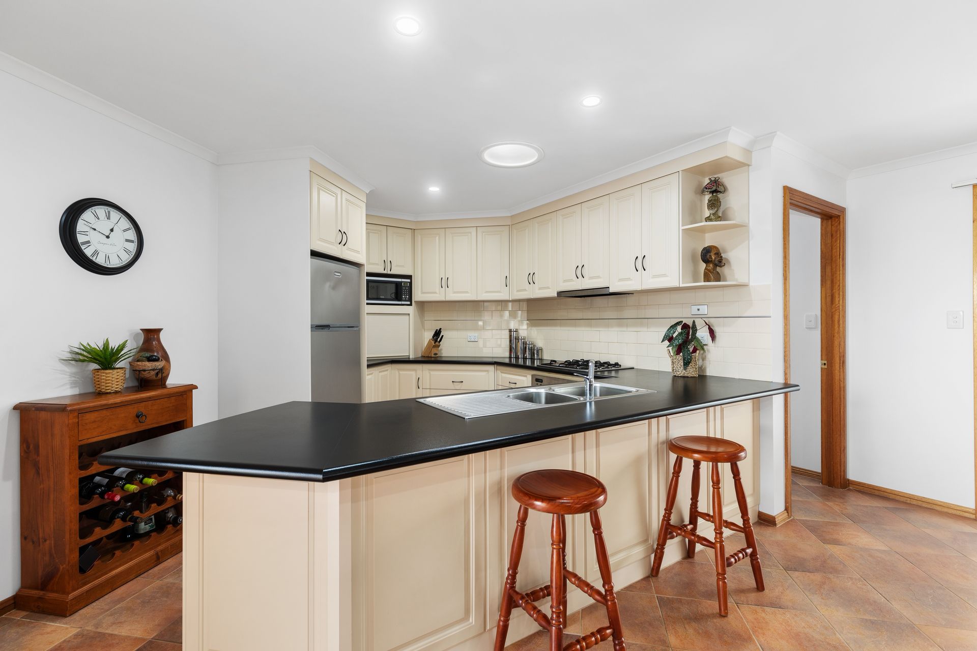 The kitchen is modern, featuring an island bench with a double sink, gas cooking and a dishwasher for convenience. The kitchen has ample bench and cupboard space also. Next to the open plan living and dining space, you will find glass sliding doors which lead you to the outdoor entertaining area. This alfresco is surrounded by a secure rear yard, with easy to maintain lawns and a large rear shed.