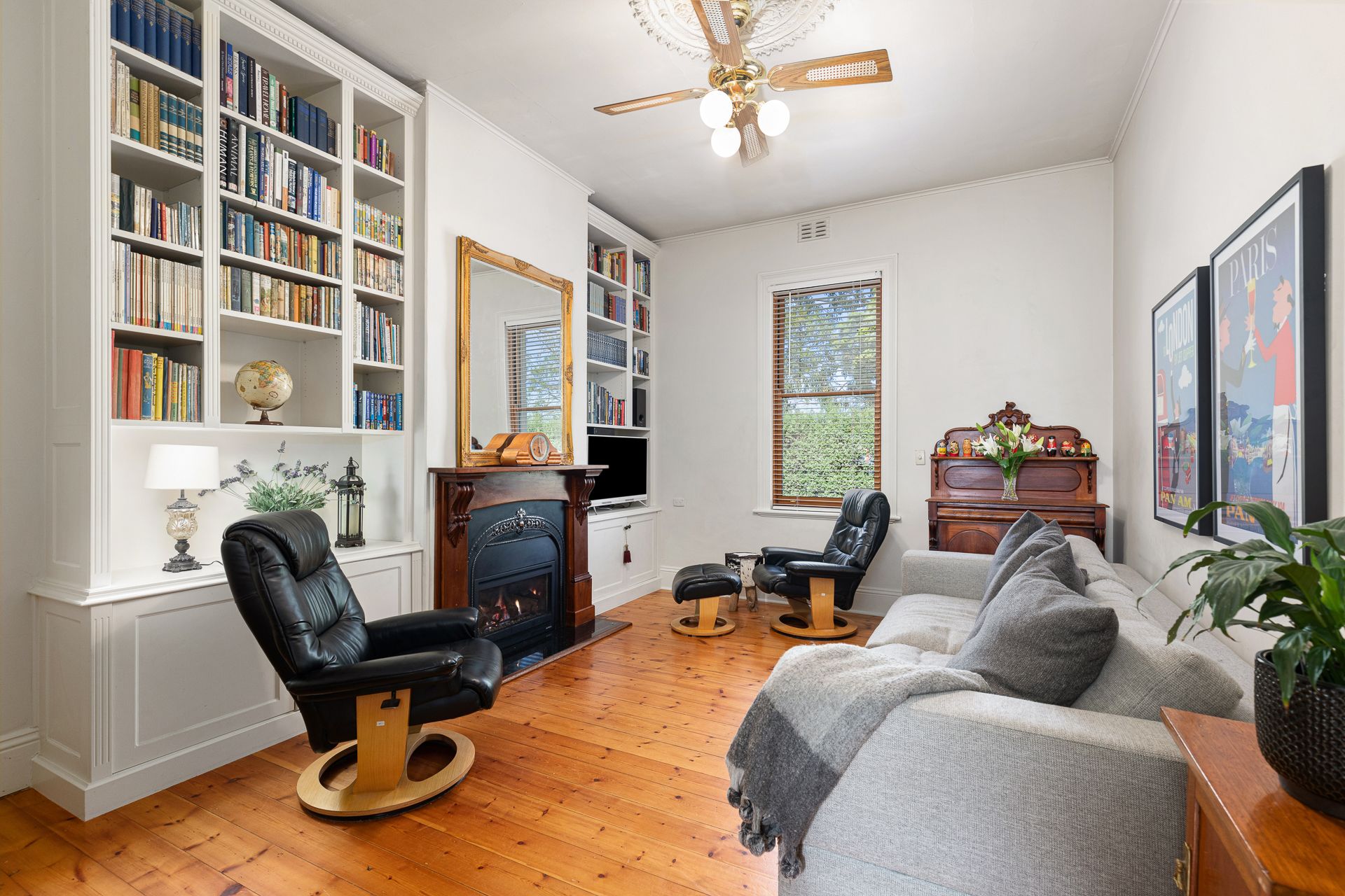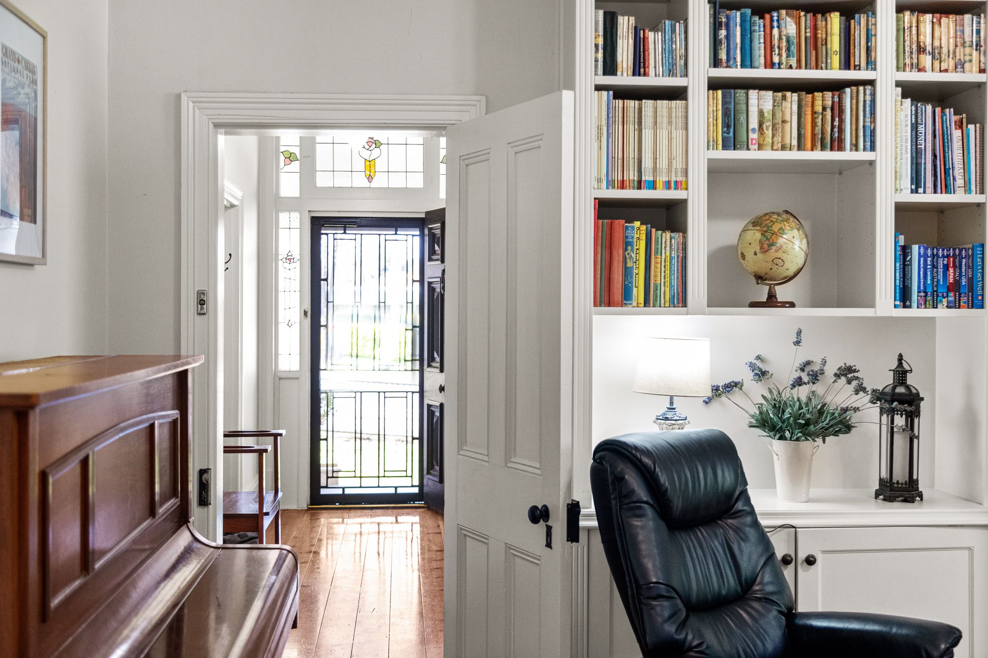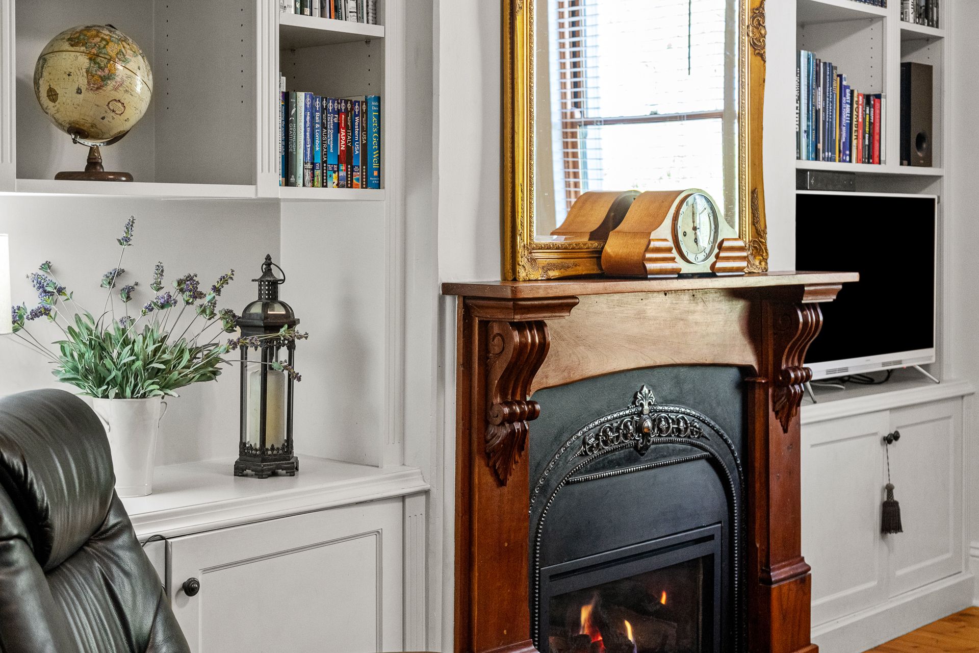 A formal living room with a working fireplace that has been updated to an enclosed gas log fire. The area includes built-in cupboards on either side of the fireplace, a ceiling fan and a side window, with the ability to be shut off.