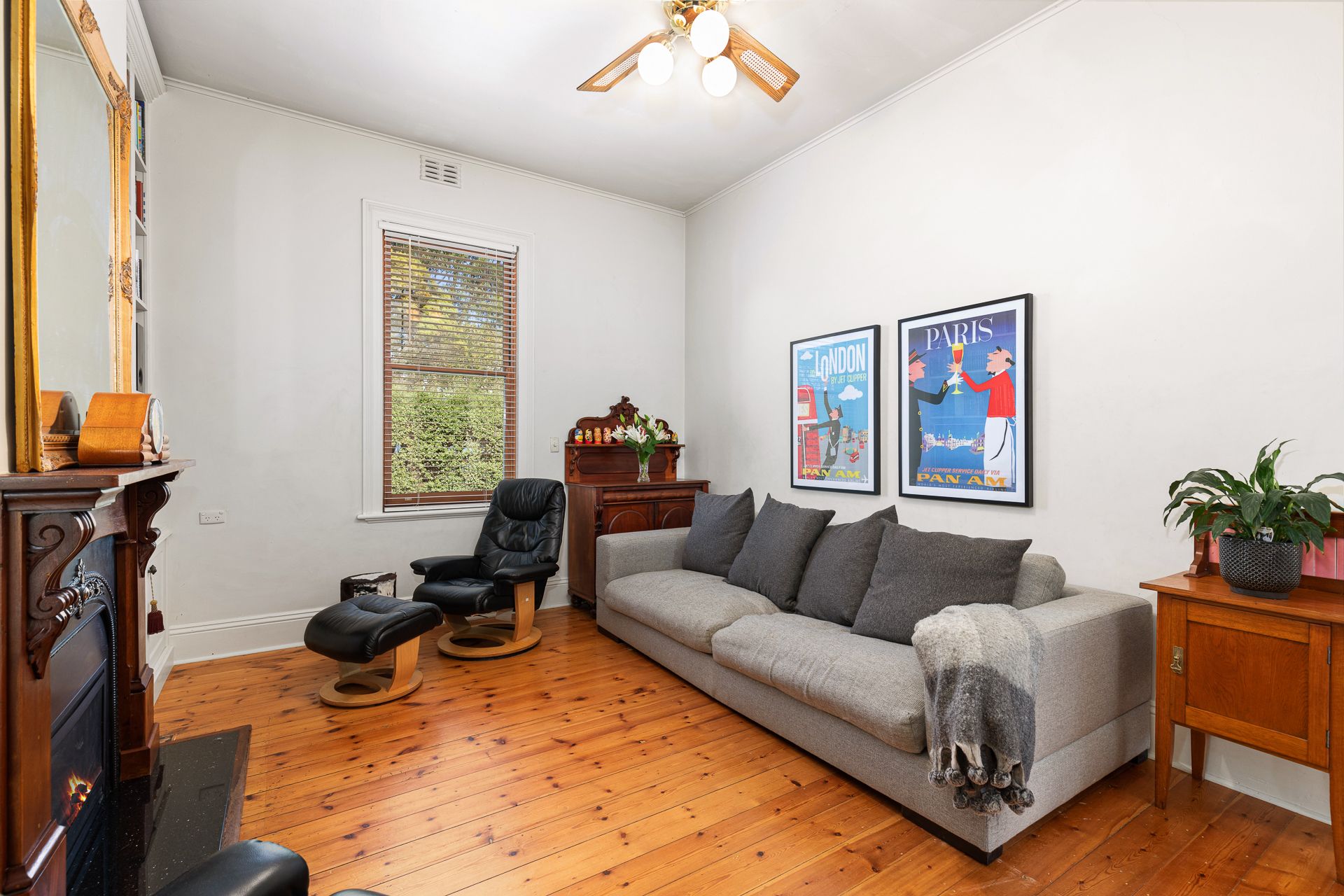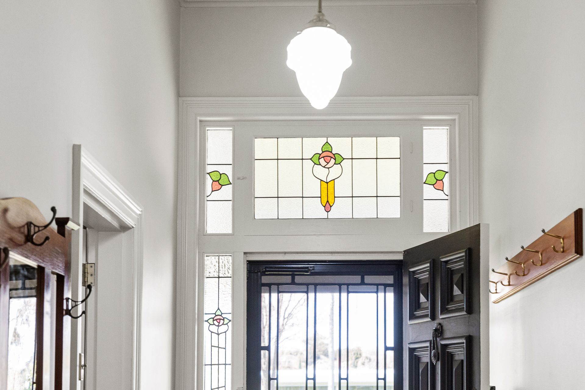 Outside is a pergola with timber decking, a garden with pavers extends from the pergola to a children's cubby house. The garden includes fruit trees and established natives enclosing the backyard. The space is secure and private and benefits from solar panels.