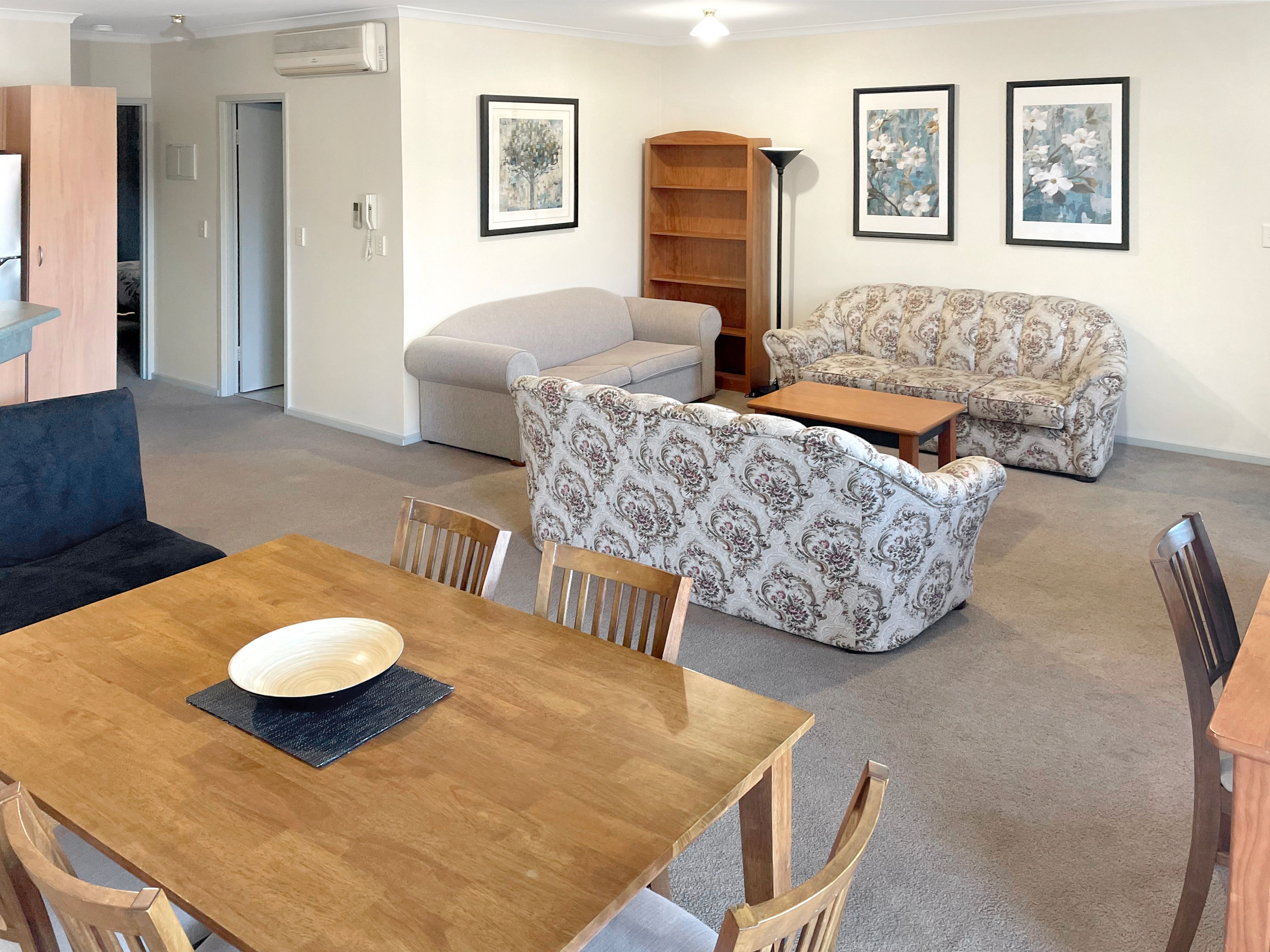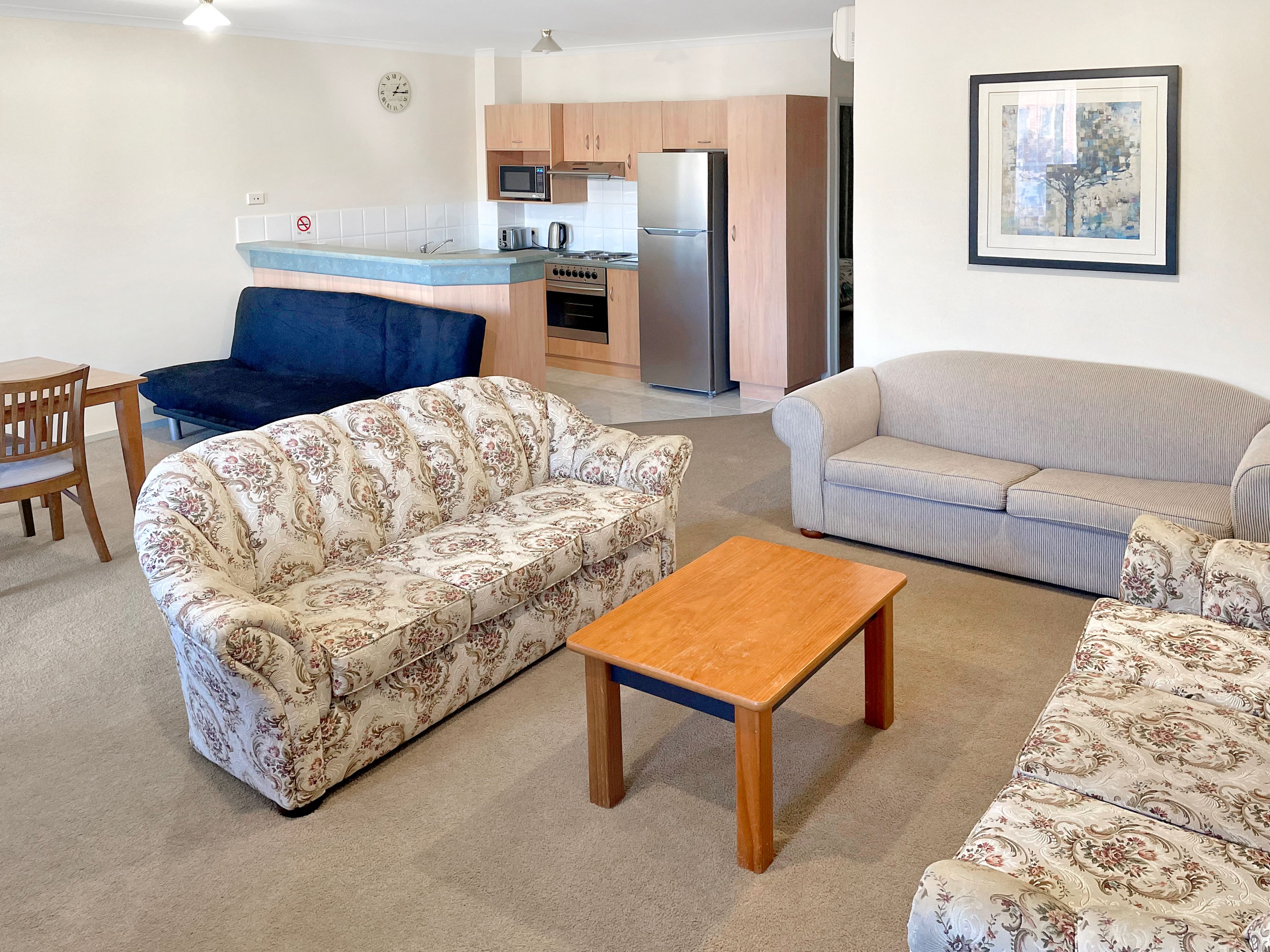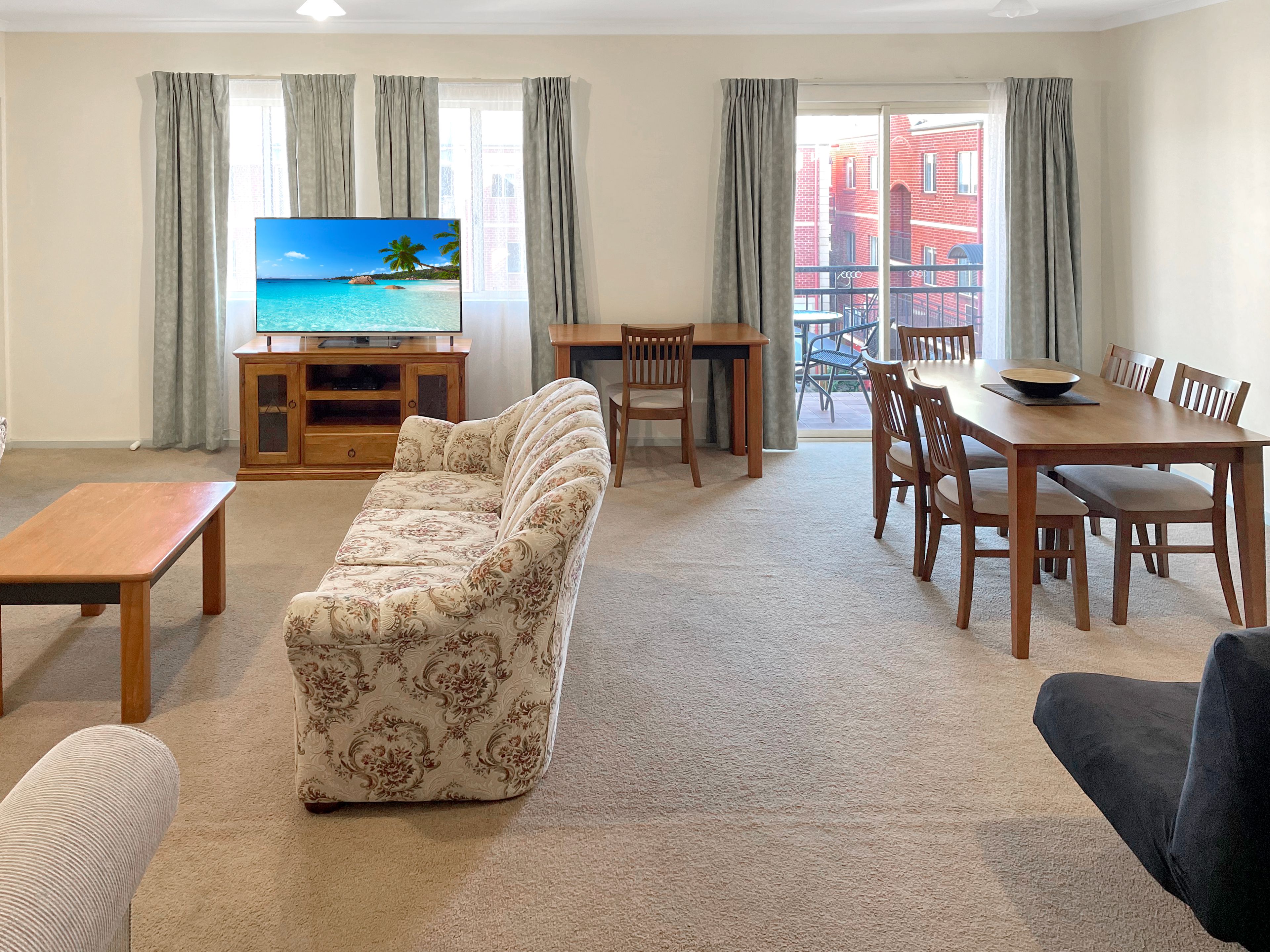Features: * Built-in robes * Carpets * Split System air conditioner * Queen and Double bed * Kitchen appliances include microwave, kettle, toaster, and Fridge. * Lounges / Futon * TV * Dining table and chairs * Bathroom with a bath, shower, and vanity * Balcony