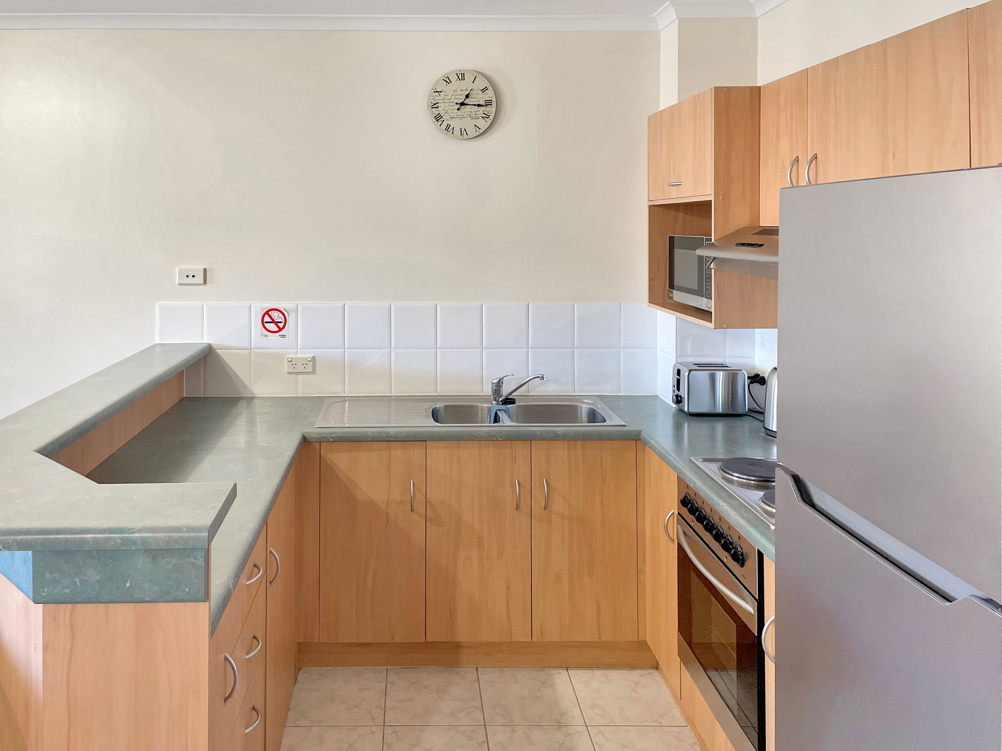 The apartment offers a generously proportioned open-plan living space, a well-appointed kitchen complete with all necessary appliances, two comfortably sized bedrooms featuring built-in wardrobes, and a modern bathroom.