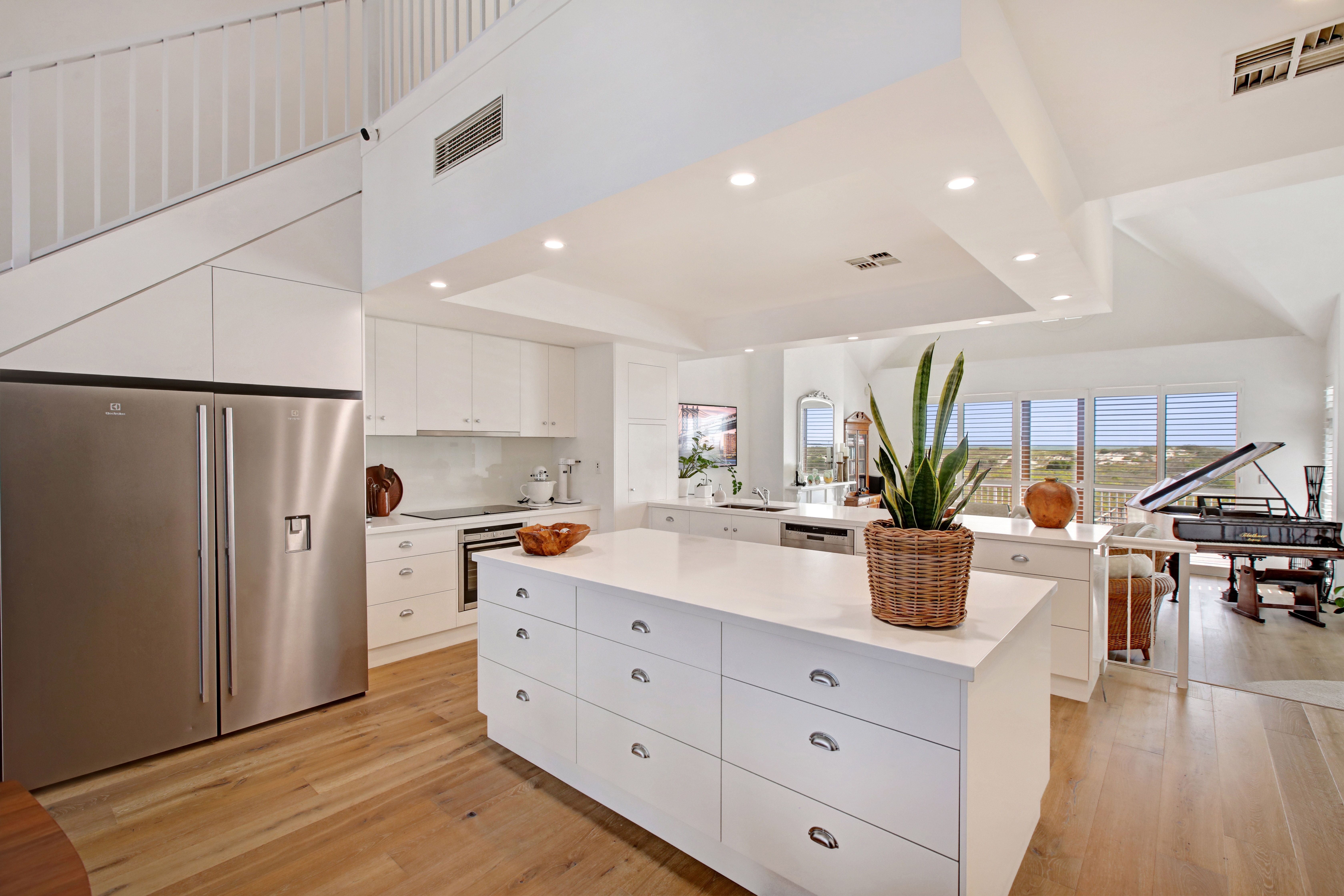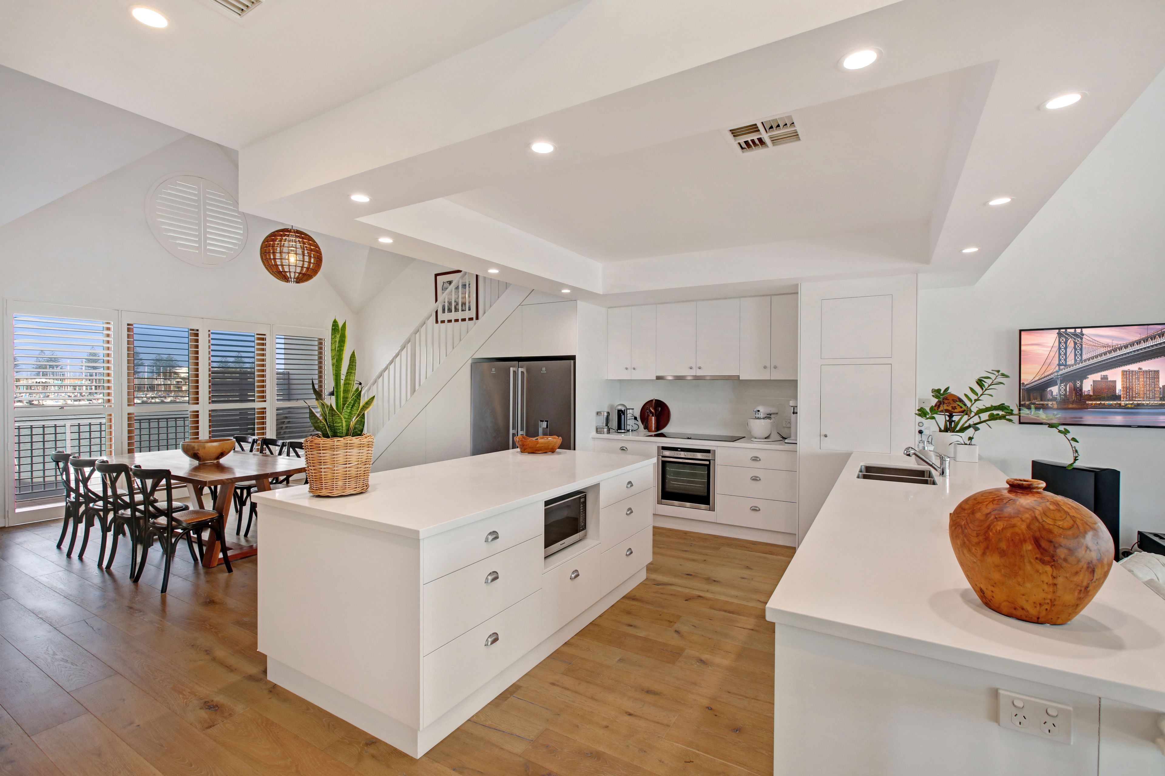 - Level three (the mezzanine) offers the flexibility of extra sleeping accommodation, a home office, home gym or retreat. - Level two (the main living level) has an open plan set up with a central kitchen, adjacent dining room and sunken formal lounge. - The lounge room is equipped with a gas fireplace set around an exquisite mantel piece with a private balcony and uninterrupted views of the coast. - The Dining room can accommodate a table of 12 and has access to the rear balcony with 180 degree marina views. - The striking Kitchen has recently undergone a full renovation equipped with a dumb waiter to the garage, stone bench tops, 900mm induction cooktop, stainless steel oven, dishwasher, inbuilt fridge and ample cupboard storage. - The Master bedroom is also located on level two complete with a walk-in closet, balcony and a fully tiled ensuite that features a bath, shower and dual vanity. - Level two is also serviced by a powder room with a laundry Shute to the ground level. - The ground level houses bedrooms 2 and 3 which are both a great size and both have marina views. - There is also a second separate living room featuring an in-built kitchenette with sink, puratap and dishwasher. - The main bathroom is also fully tiled with a shower, vanity and toilet. - Practical laundry room with extra storage and rear access (additional storage room under the stairs). - Double garage includes a loft storage and utility area. - Spacious rear patio ideal for large-scale entertaining with a glass fence, marina views and tropical plants. - Private boat jetty and pontoon includes a custom kayak launch pad. - New engineered hardwood floors throughout. - New plantation shutters throughout. - New internal and external paint throughout. - Intercom system.
