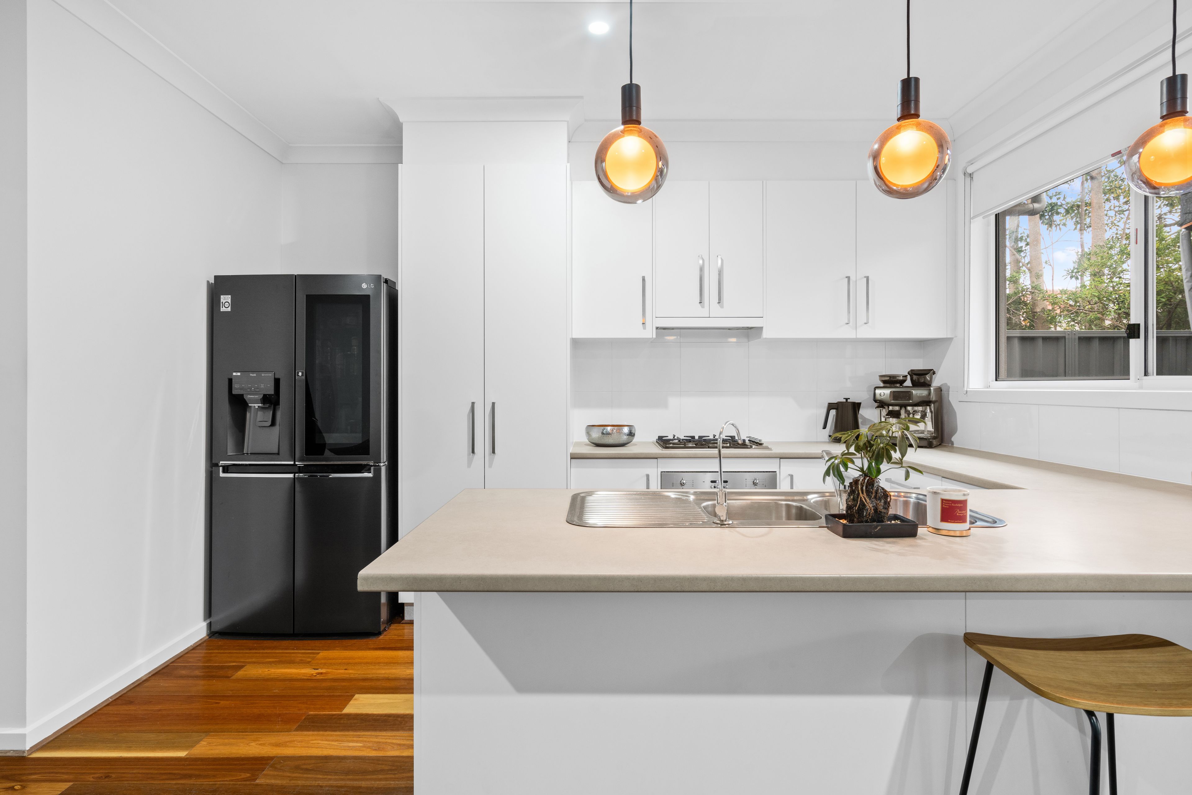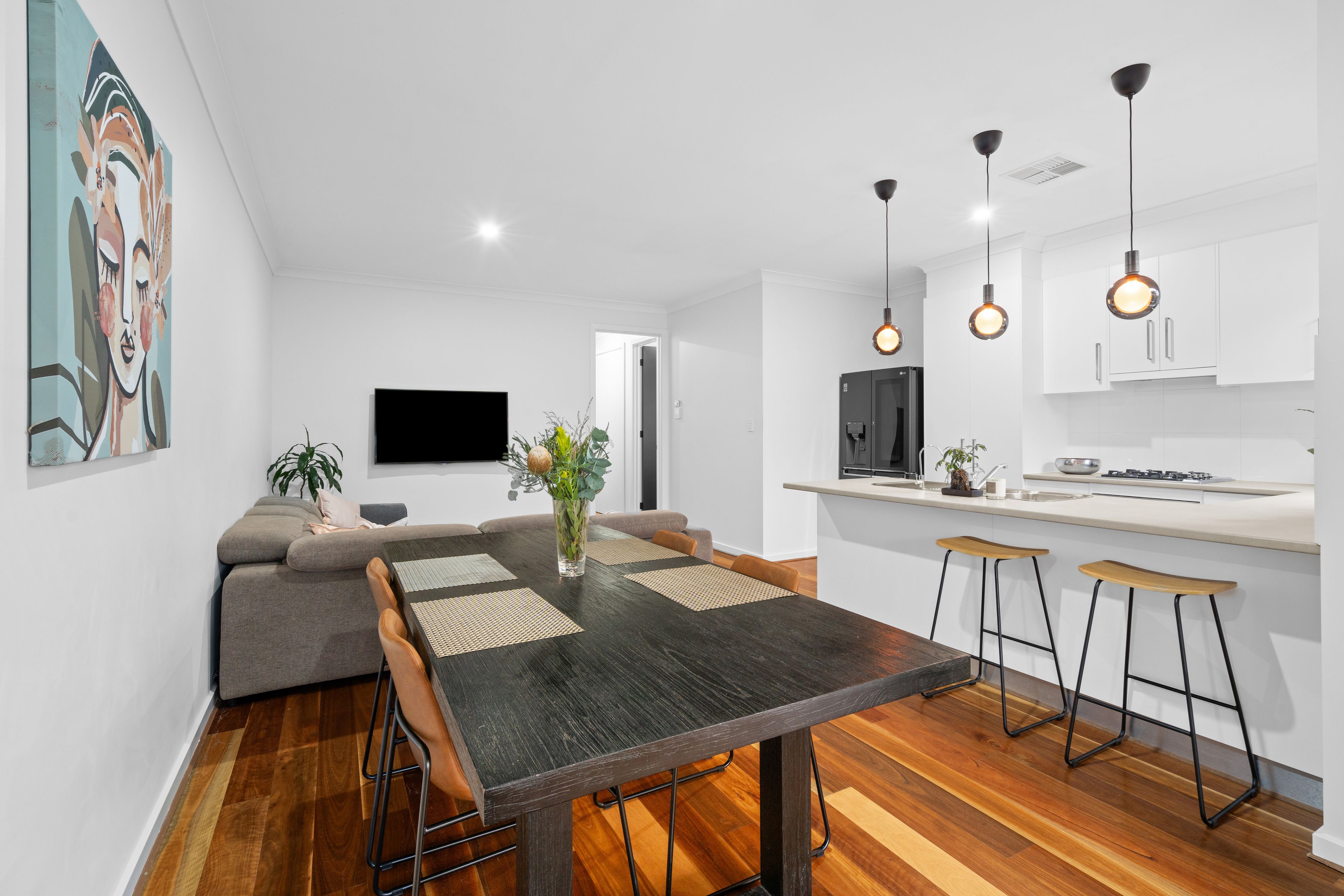 As you step inside, you are greeted by a spacious open-plan kitchen, living, and dining area adorned with polished wooden floors, sleek cabinetry, and stylish pendant lighting. The kitchen is a culinary delight, featuring quality appliances, ample storage, and a convenient breakfast bar.