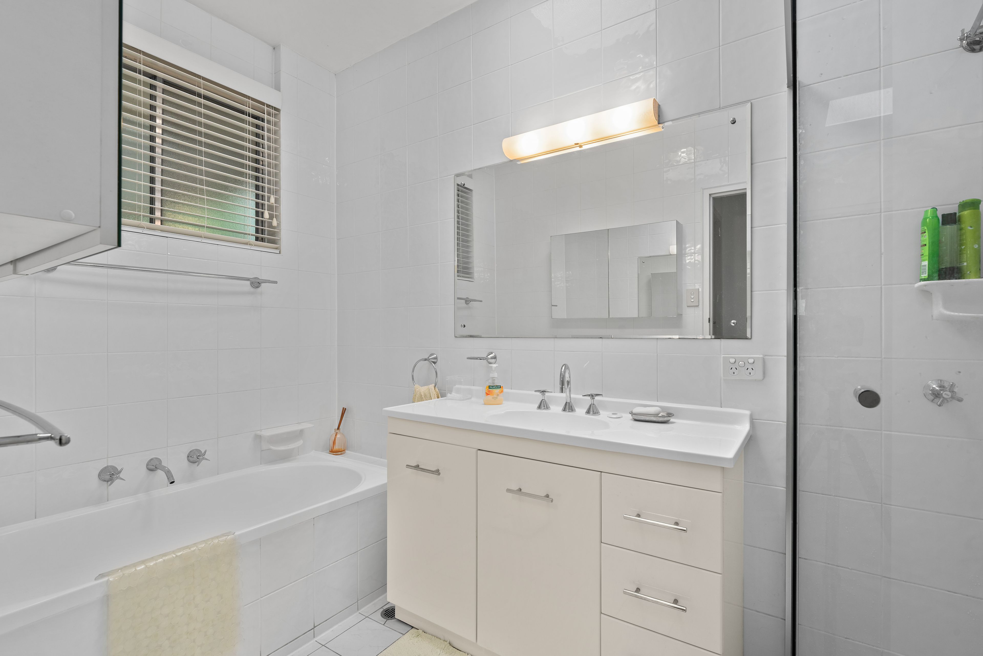 The bathroom is white, spacious and updated and the toilet is separate for convenience.