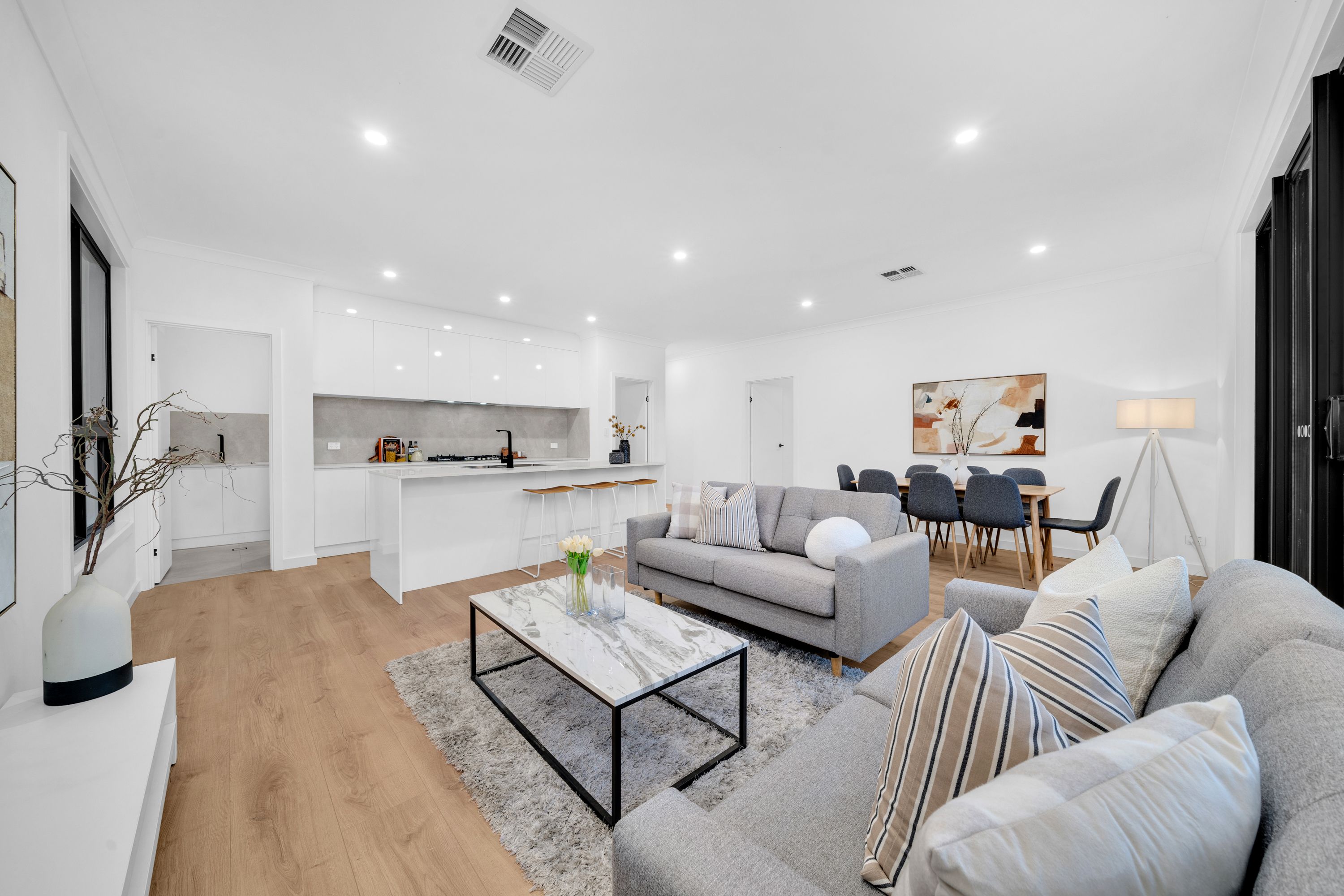 Step inside the main living area and enjoy a sense of spaciousness enhanced by soft neutral tones, high ceilings, and oodles of natural light. The elegant kitchen makes entertaining easy with a walk-in pantry, quality appliances, a gas cooktop, stone benchtops, and a large island bench with room for seating.