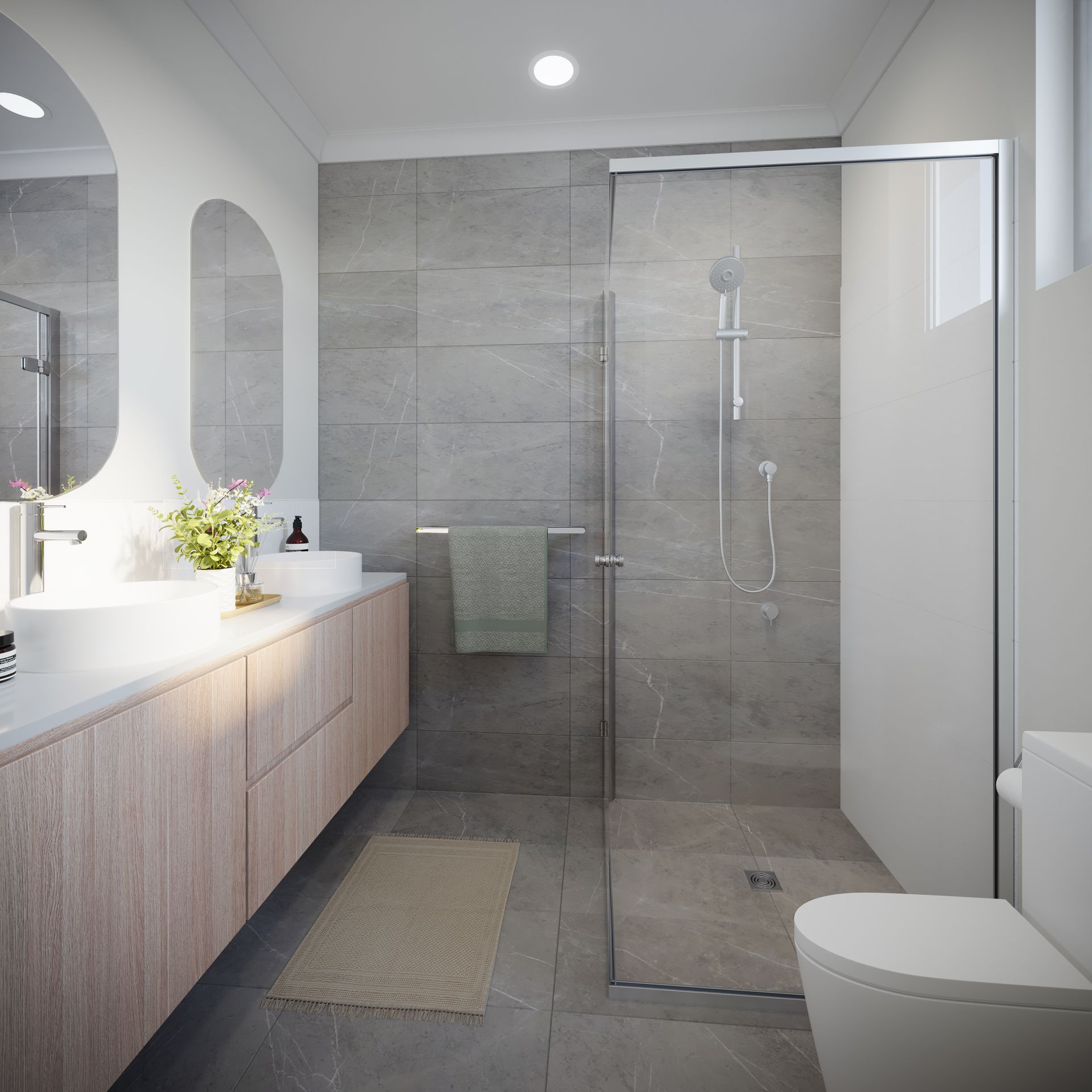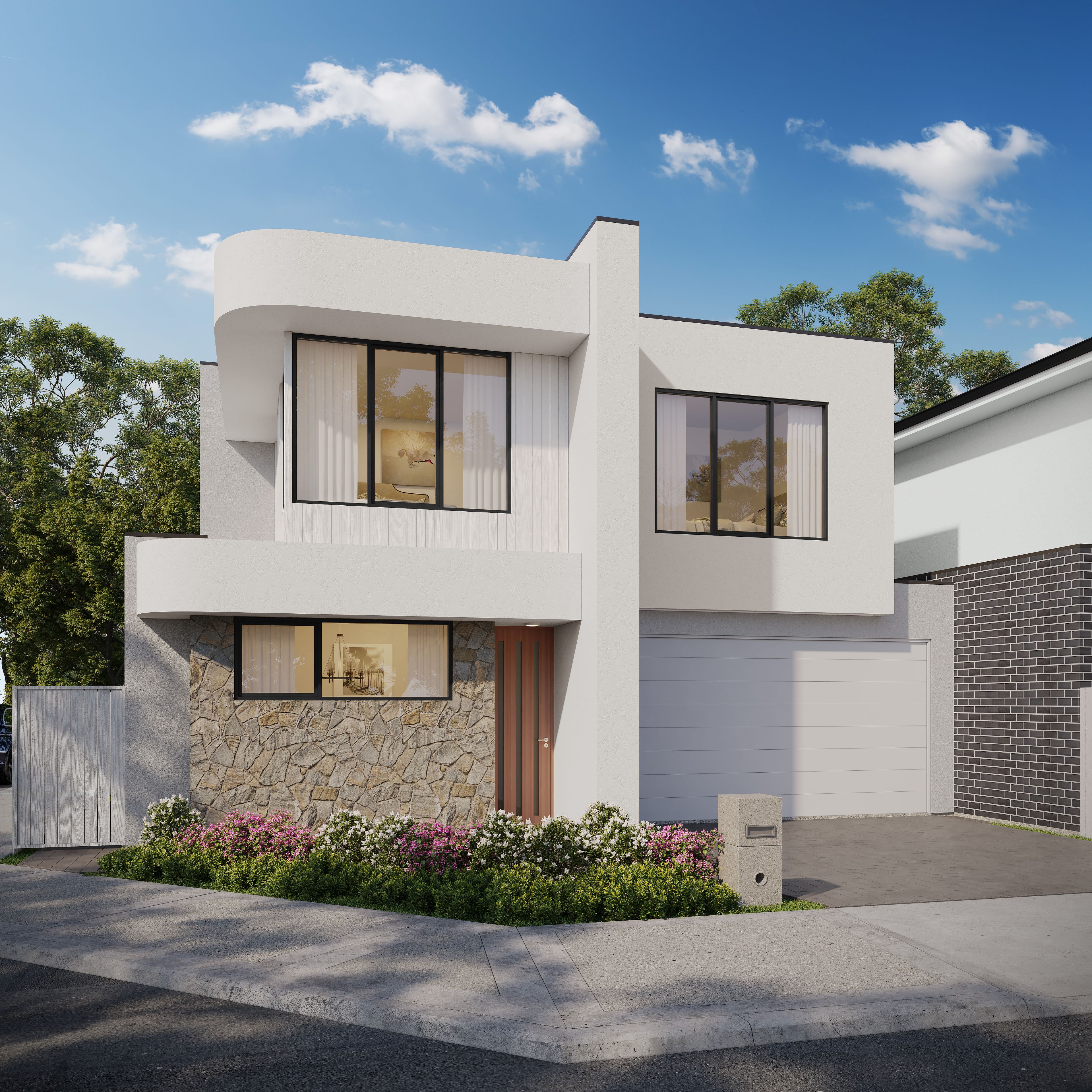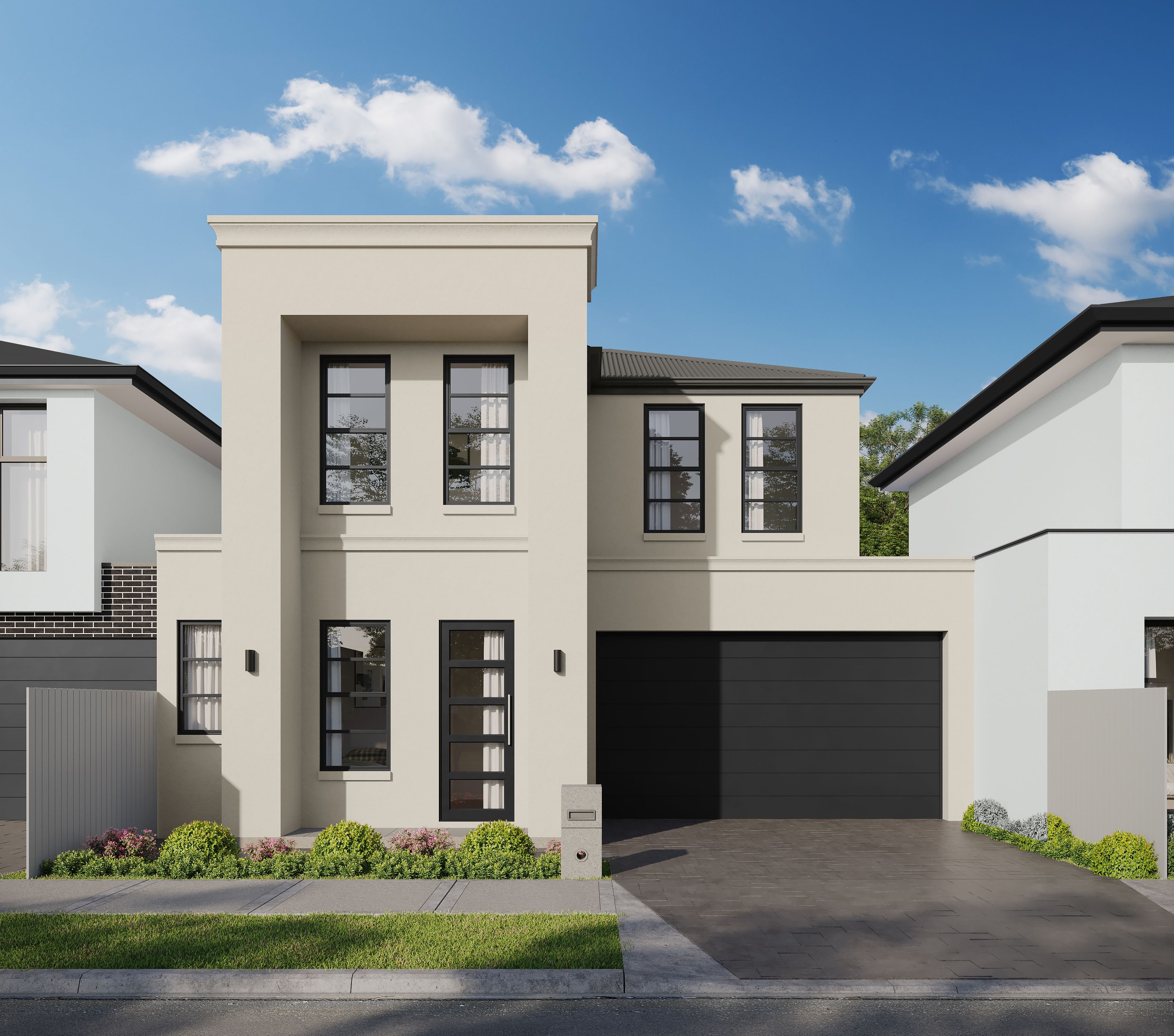 These custom-built homes include double garages and four spacious bedrooms, including a master with a walk-in robe and bedrooms 2, 3, and 4 with built-in robes. There are 2 bathrooms complete with stone benchtops and full-height feature wall tiling, as well as a separate WC. The stunning open plan kitchen, dining, and living spaces feature modern, neutral, and high-quality finishes throughout.