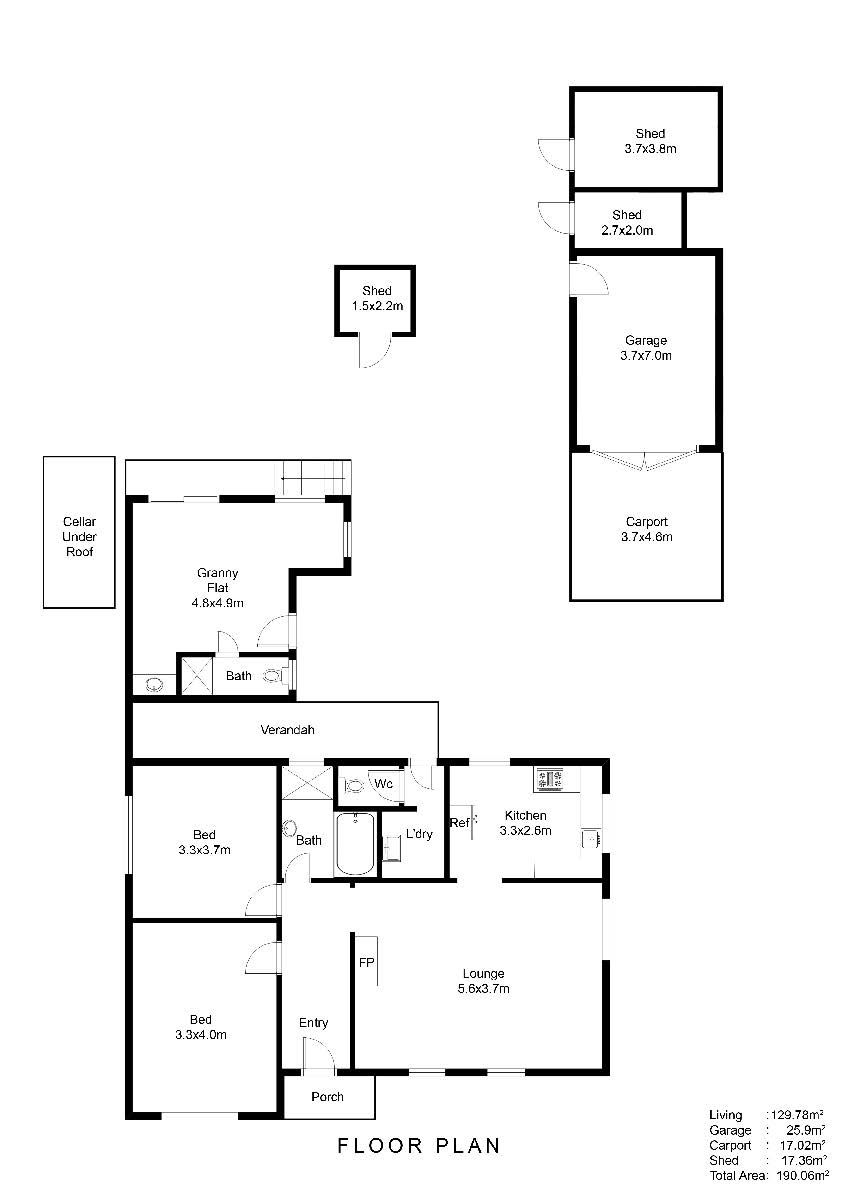 • 2 Generous size bedrooms plus detached rumpus/3rd bedroom with bathroom & sink facilities. • Large lounge room. • Kitchen/meals area. • Original bathroom. • Carport and garage. • Lots of shedding. • Garden shed. • Timber floors throughout.