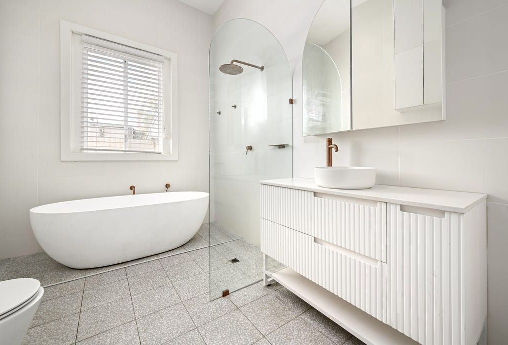 • Stylish central family bathroom featuring deluxe freestanding tub, modern vanity, shower, toilet, and laundry facilities