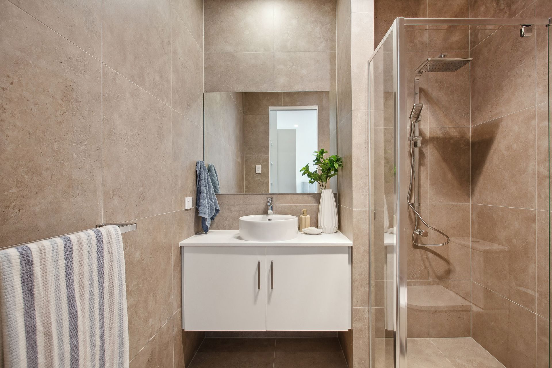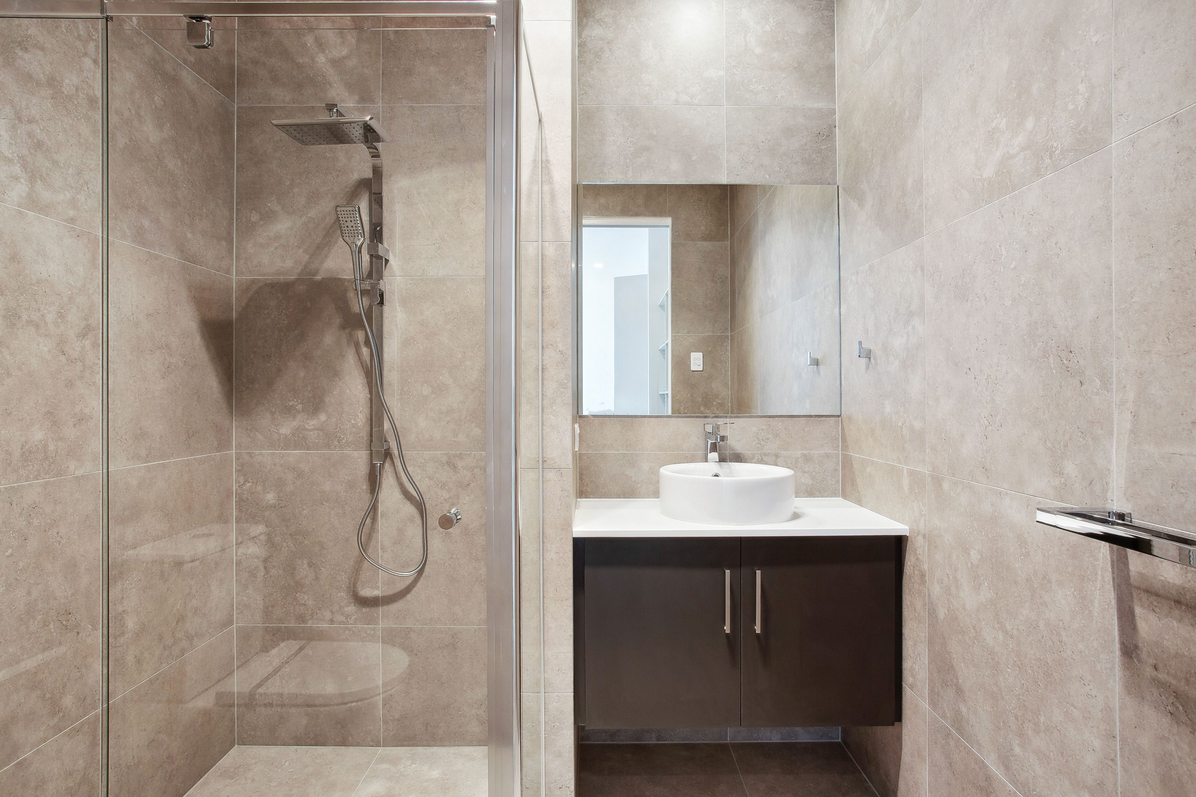 Luxurious Bathroom: Unwind after a long day in the luxurious bathroom, complete with floor-to-ceiling tiles, a sleek Raymor shower, and a glossy white round basin. This bathroom is your personal oasis of relaxation.