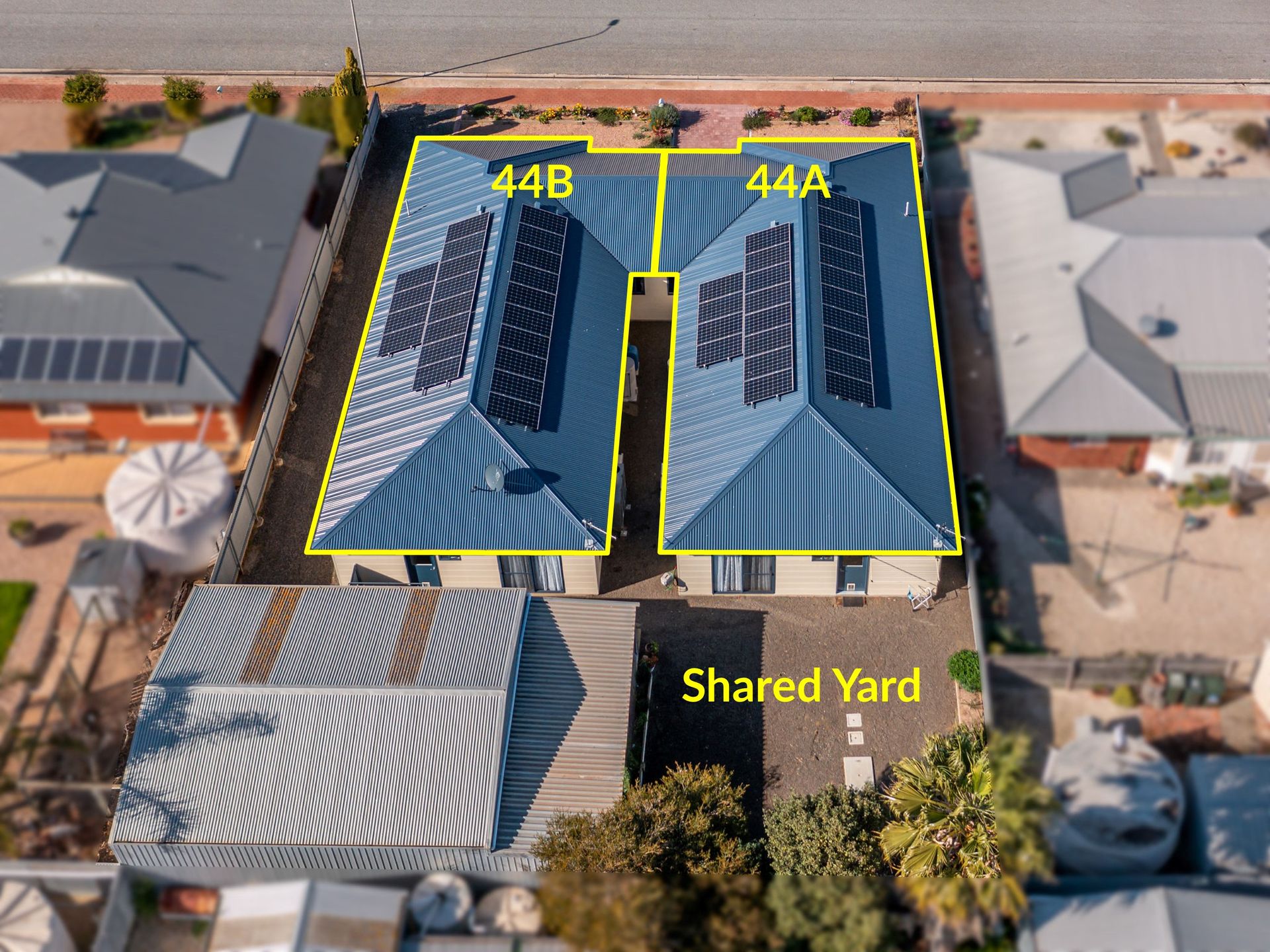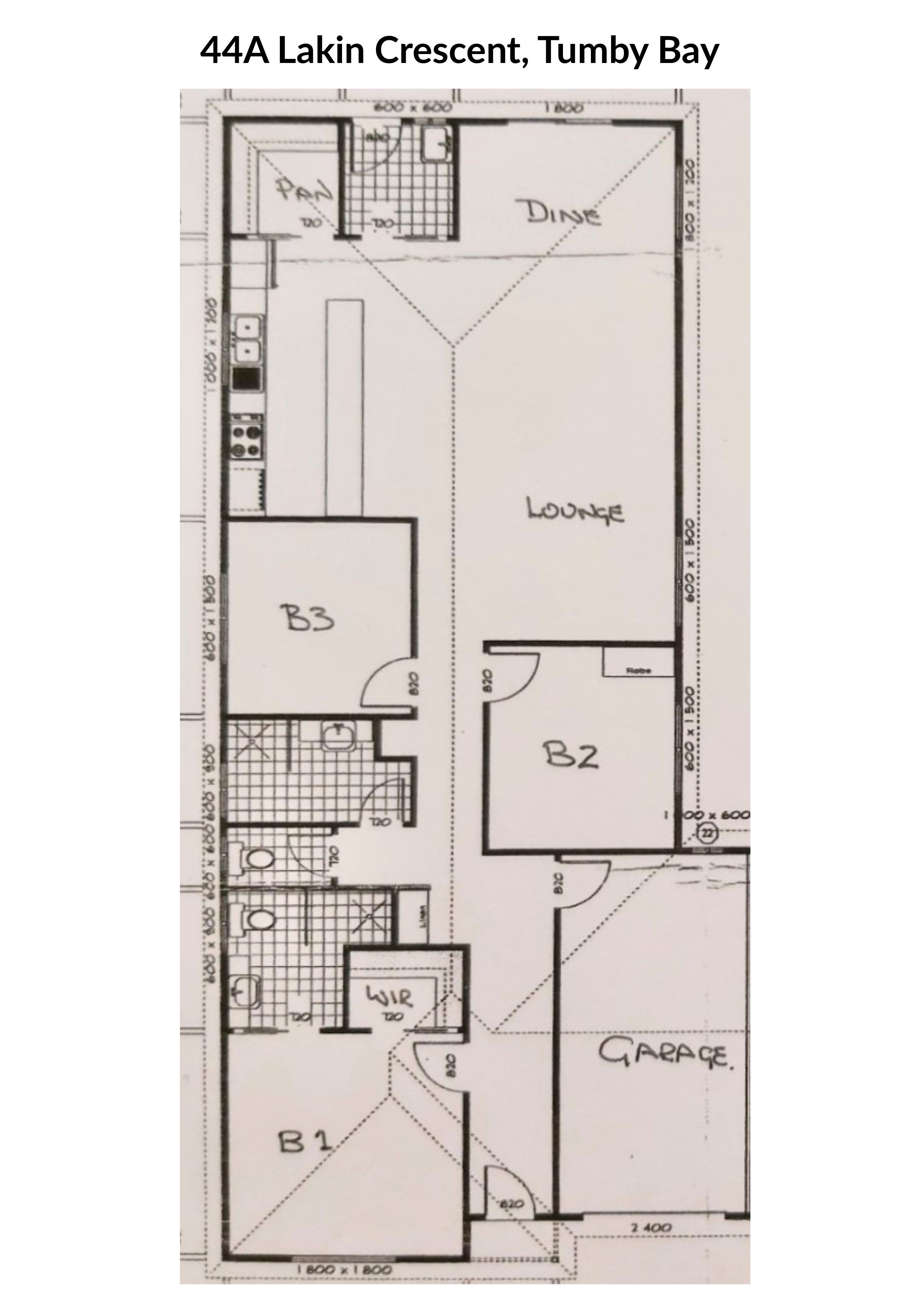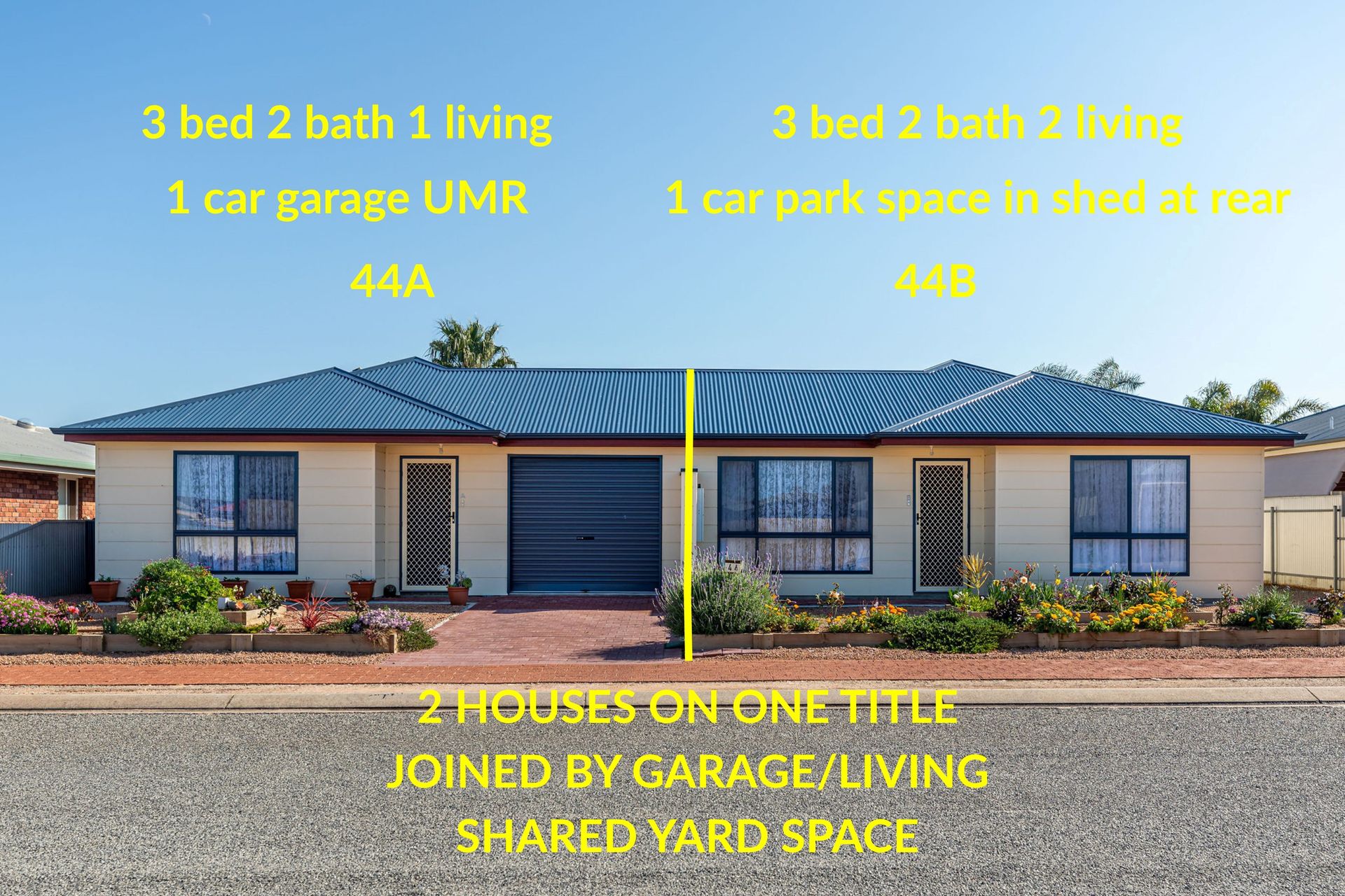 Located at 44 Lakin Crescent, Tumby Bay: There are two houses on the one property. They are joined by a garage/2nd-living. The one house available for rent is referred to as 44A and comprises 3 bedrooms, 2 bathrooms and 1 living room.