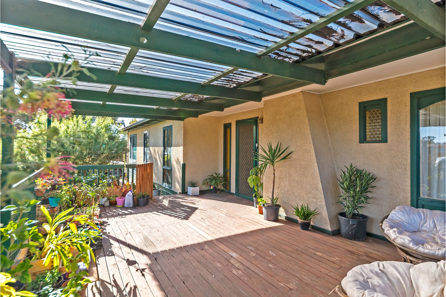 The rear deck overlooking the well-maintained back garden, with lush lawn, veggie gardens, and low maintenance yard layout. The single carport allows rear access to the shed, with side access to the yard also accessible from the side street.