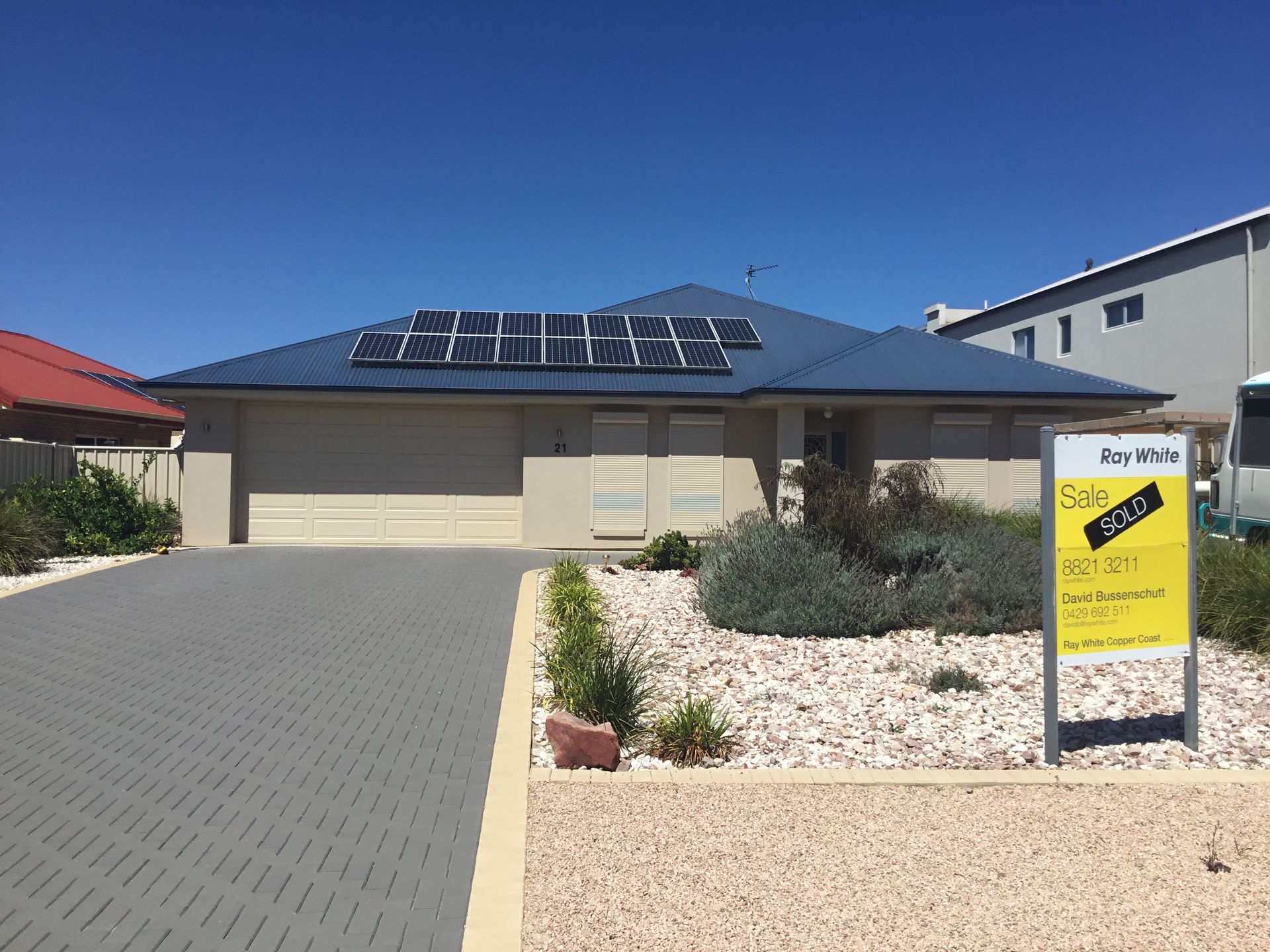 Position Perfect at this address! Located on the Wallaroo Marina with 12m of your own water front complete with pontoon it's going to be so easy heading out for the days catch in the Wallaroo Bay. This home has three bedrooms all with either full mirrored built in robes, or walk in robe. The larger master offers exquisite views over your gardens and with the waterways as the back drop, you will fly out of bed to get an early start on the whiting. Spacious open plan living room that has well-appointed kitchen featuring granite topped island bench with sink and dishwasher, gas cook top, modern chic splash backs and an enormous walk in pantry that will have any chef excited. Tiled living areas, air conditioning, ceiling fans, parking for two under the main roof with direct internal access, en-suite to the master bedroom with spacious shower and double basins. This home was designed to take in the marina views so features outdoor living in the tiled alfresco complete with zip track blinds, ceiling fans plus gas port for your BBQ and then a patio to the rear of the garage that offers some under cover parking for small boat or just a little extra storage space. The gardens are tiered to the pontoon with established low maintenance plants leaving plenty of time for R and R. There are solar panels on the roof to help keep your power bills under control and this wonderful property is just a 5 minute stroll to the white sandy beaches of the Wallaroo Bay. Inspection will impress and to arrange yours call the Sales Agent David Bussenschutt on 0429 692 511.
