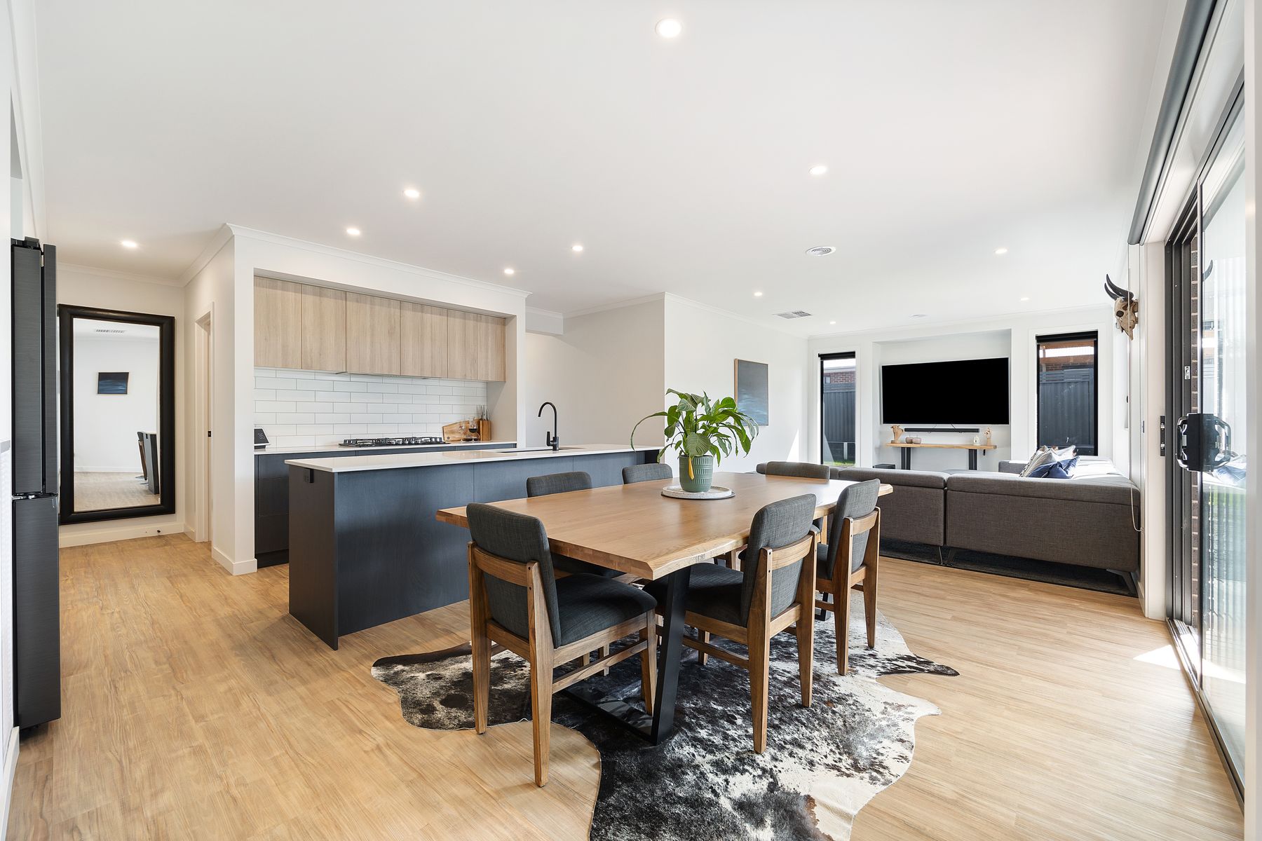 Upon entry the home comprises a spacious front lounge, cloak storage and a generous master suite with his and hers walk in robes, leading to a full ensuite featuring floating double vanity with an abundance of storage, full bath, shower and separate toilet. Continue down the hallway to an open plan living, kitchen and dining space that has had no expense spared. The kitchen features stone benchtops, 900mm oven, five-burner gas cooktop, double sink, dishwasher, and is further enhanced with a well-designed walk in pantry. The rear wing of the home features a further three bedrooms all with built in robes, fourth bedroom with additional data points as currently used as study, walk in linen storage, central bathroom with oversized shower and a separate toilet. The home is complete with well-appointed laundry offering direct access to the rear concreted area.